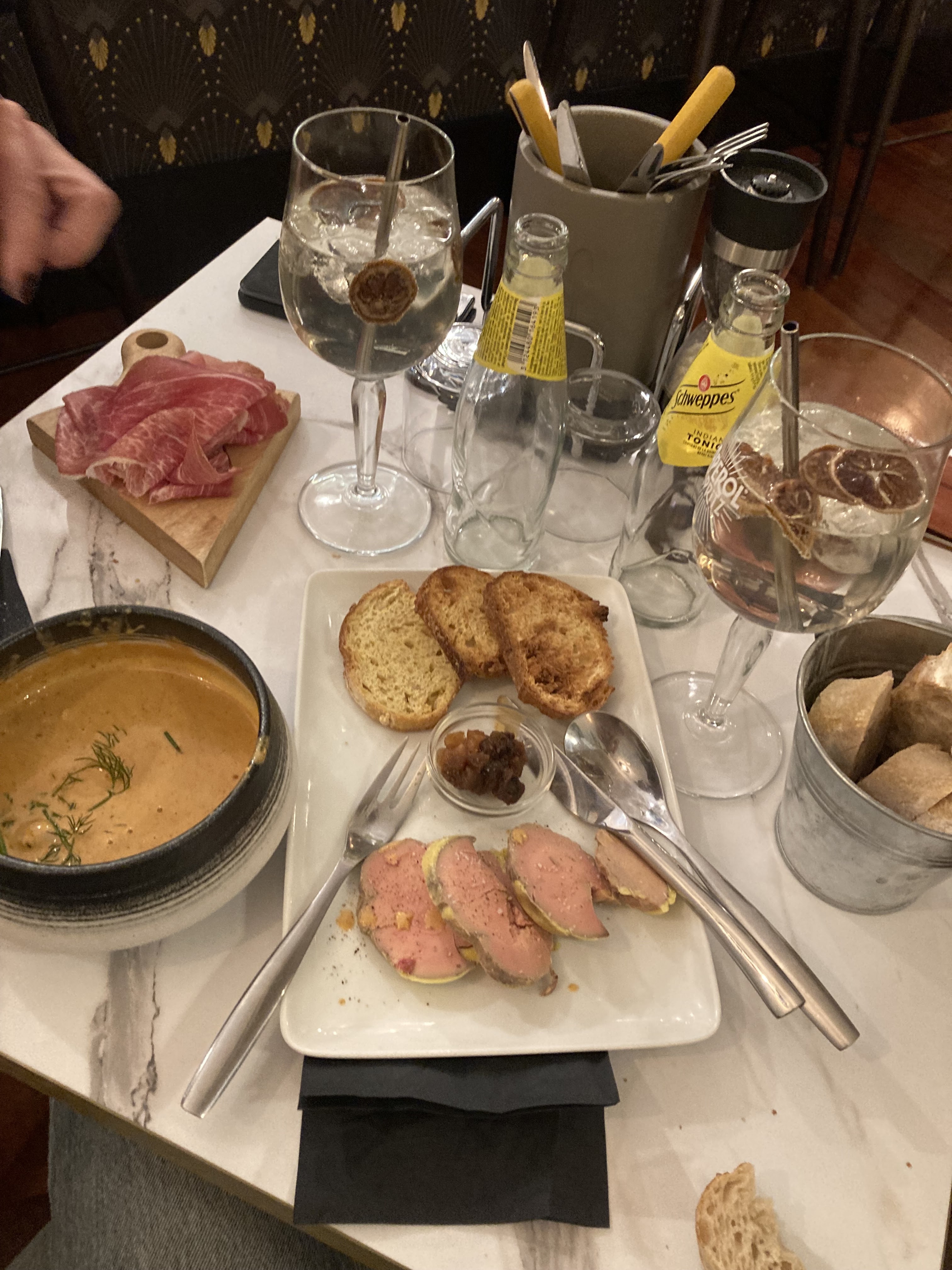 une bonne adresse, le foie gras est bon ainsi que la raviole de langoustine. Les prix sont assez élevés mais la qualité est là. Petit bémol sur le fait qu'ils refusent de prendre les tickets resto le midi en semaine... la décoration est très jolie et les tables bien espacées. Les chiens sont acceptés à l'intérieur, top aussi ! En résumé je recommande pour les petits appétits, car si on prend 3 ou 4 tapas on en a vite pour 50€ par tête mais honnêtement 2 tapas peuvent suffire à mon sens. Les choux à la noix sont très bons dommage que ce soit vraiment petit en revanche pour 11€.