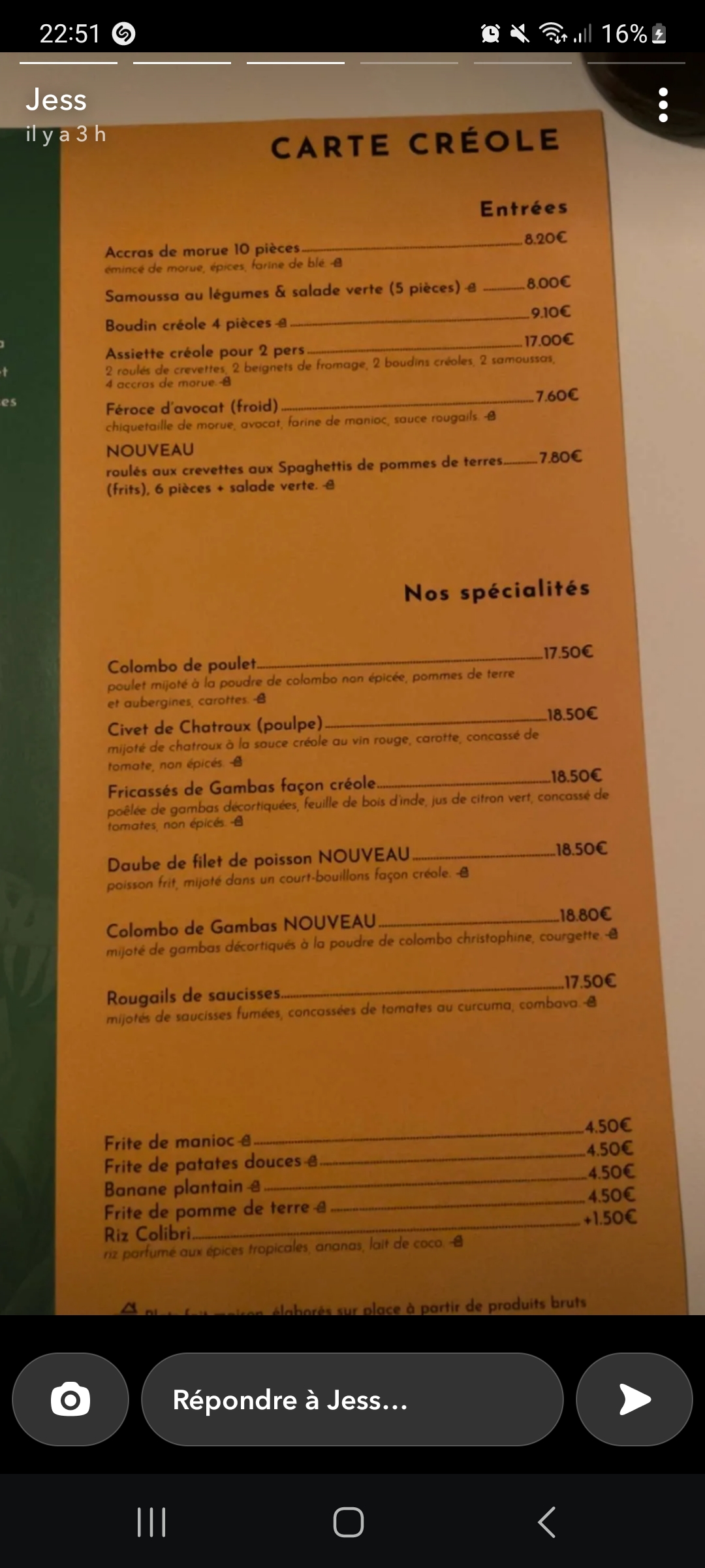 C’est pas bon, j’espère que la vrai cuisine créole c’est pas ça... je déconseille fortement, avant le resto fessait des pizzas, les pizzas étaient bonnes Je sais pas comment répondre à votre commentaire, en tous cas merci pour la réponse, Pour les détailles les entrées étaient fades, aucun goût, la petite sauce fait pas l’affaire, et les plats on dirait qu’ils étaient cuit il y a plusieurs jours et c’était pas du tout goûteux, limite fade aussi, Désolé, c’est pas pour vous offenser mais c’est mon avis personnel 😊 J’ai mangé chez vous le 2 juillet 2020 le soir