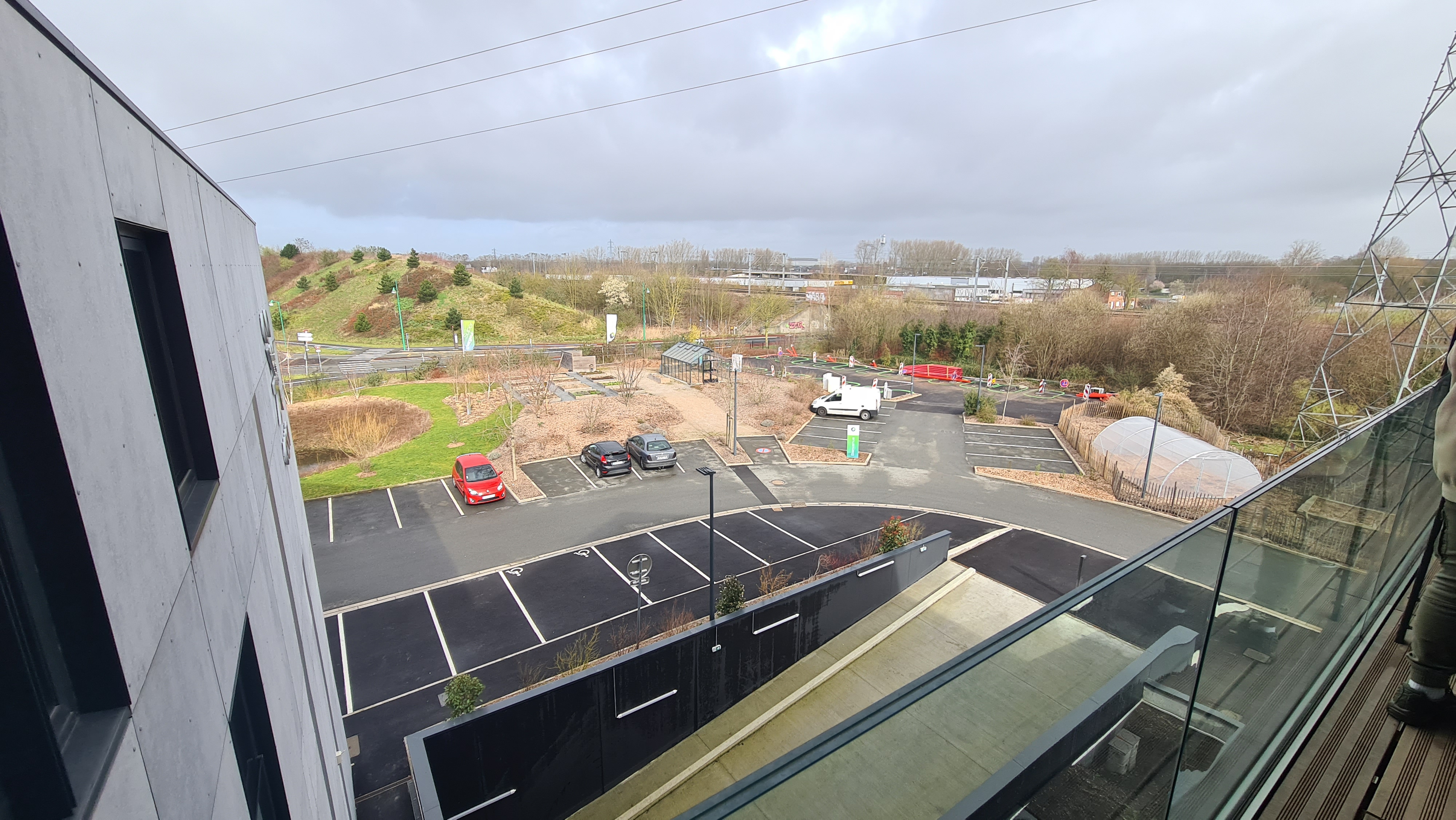 Lieu moderne de coworking. Chargeurs de voitures électriques sur le parking.