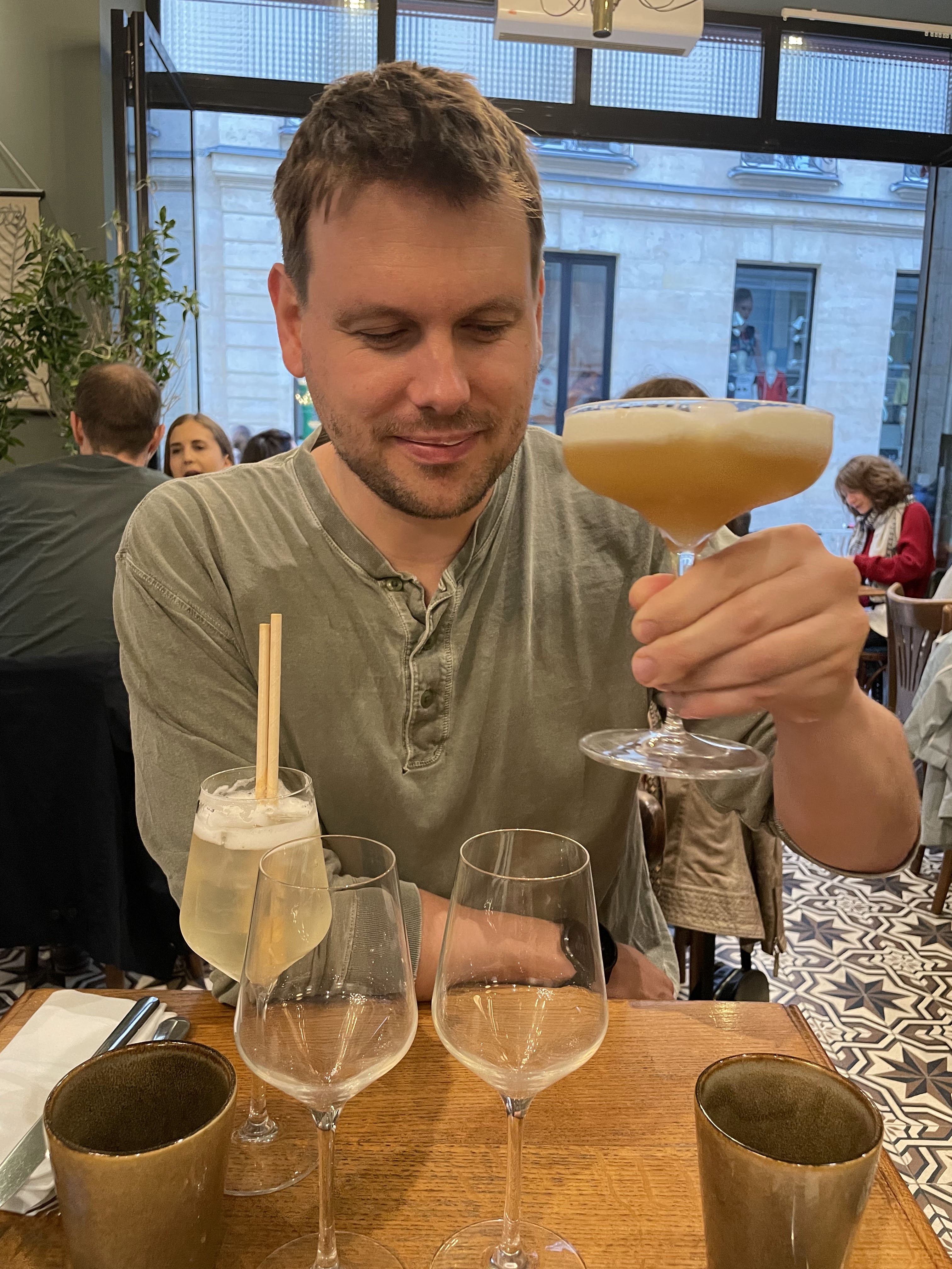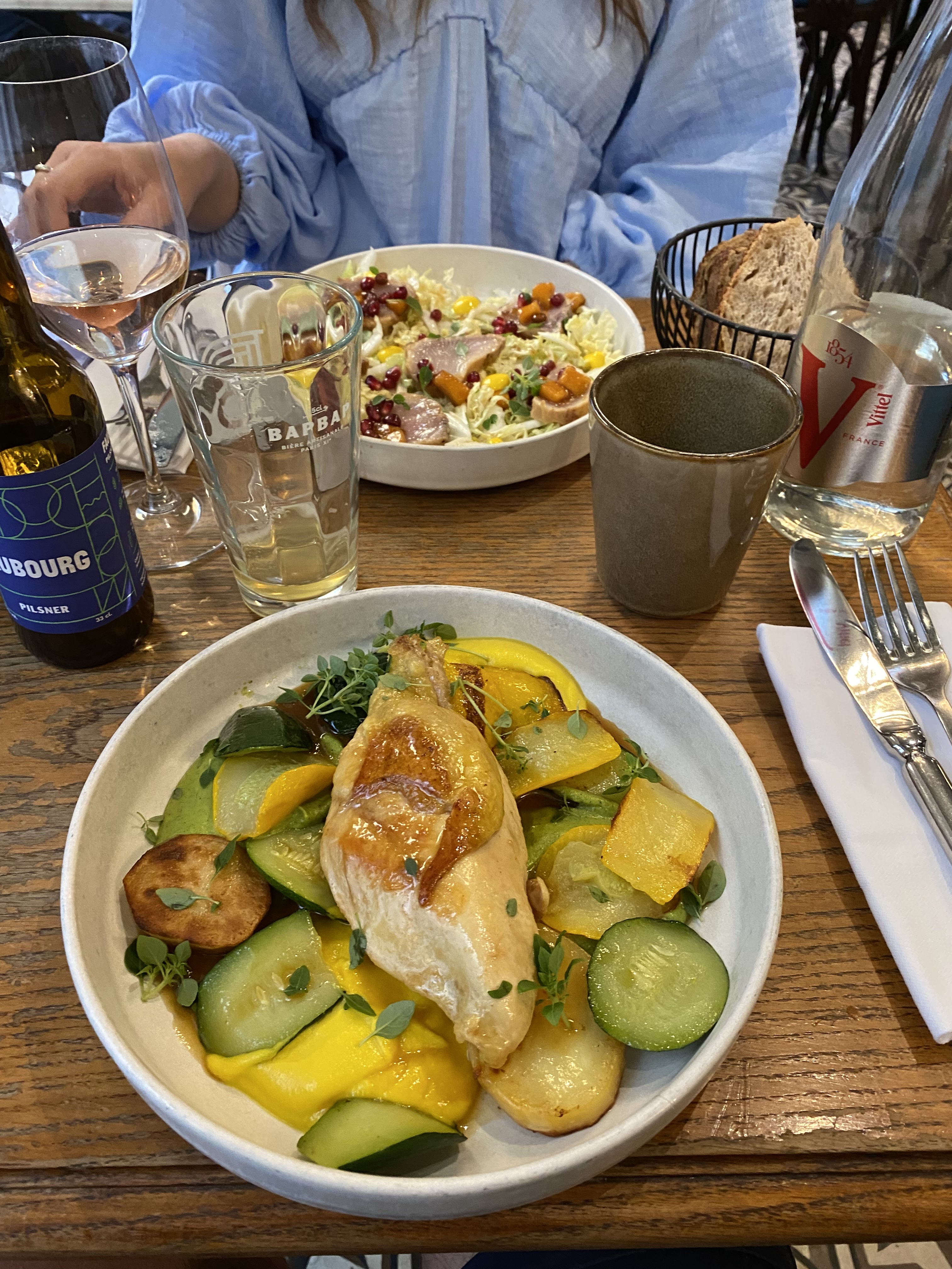 Bonnes choses: - Le plat principal (daurade) était incroyable - l'un des meilleurs repas que j'ai eu depuis longtemps. Je recommande vivement (voir photo ci-jointe) - Ambiance extérieure agréable, tables très propres - Présentation des plats très bonne Points à améliorer : - Le service était très lent, tant pour prendre notre commande que pour servir notre nourriture. Nous avons appris plus tard que c'était parce qu'il y avait des partis plus importants à nos côtés. Même si j'apprécie cela, il aurait été bien de nous faire savoir à l'avance que l'attente sera plus longue que d'habitude, afin que nous ayons peut-être commandé plus d'entrées, etc. pour nous faire attendre. Les serveurs se sont ensuite excusés. - l'entrée aux olives était beaucoup trop salée à notre goût, donc ne commandez que si vous aimez les plats salés - Je n'étais pas convaincu du rapport qualité/prix. Je sais que vous êtes à Paris mais j'ai mangé de bons repas à des prix plus raisonnables ailleurs. En particulier, on nous a servi un petit verre de cidre, par opposition à un volume de bouteille réel comme celui servi ailleurs. Le restaurant ferait encore mieux d'offrir une classe plus grande et de facturer un peu plus - le simple fait de regarder un si petit verre vous donne le sentiment d'être lésé.
