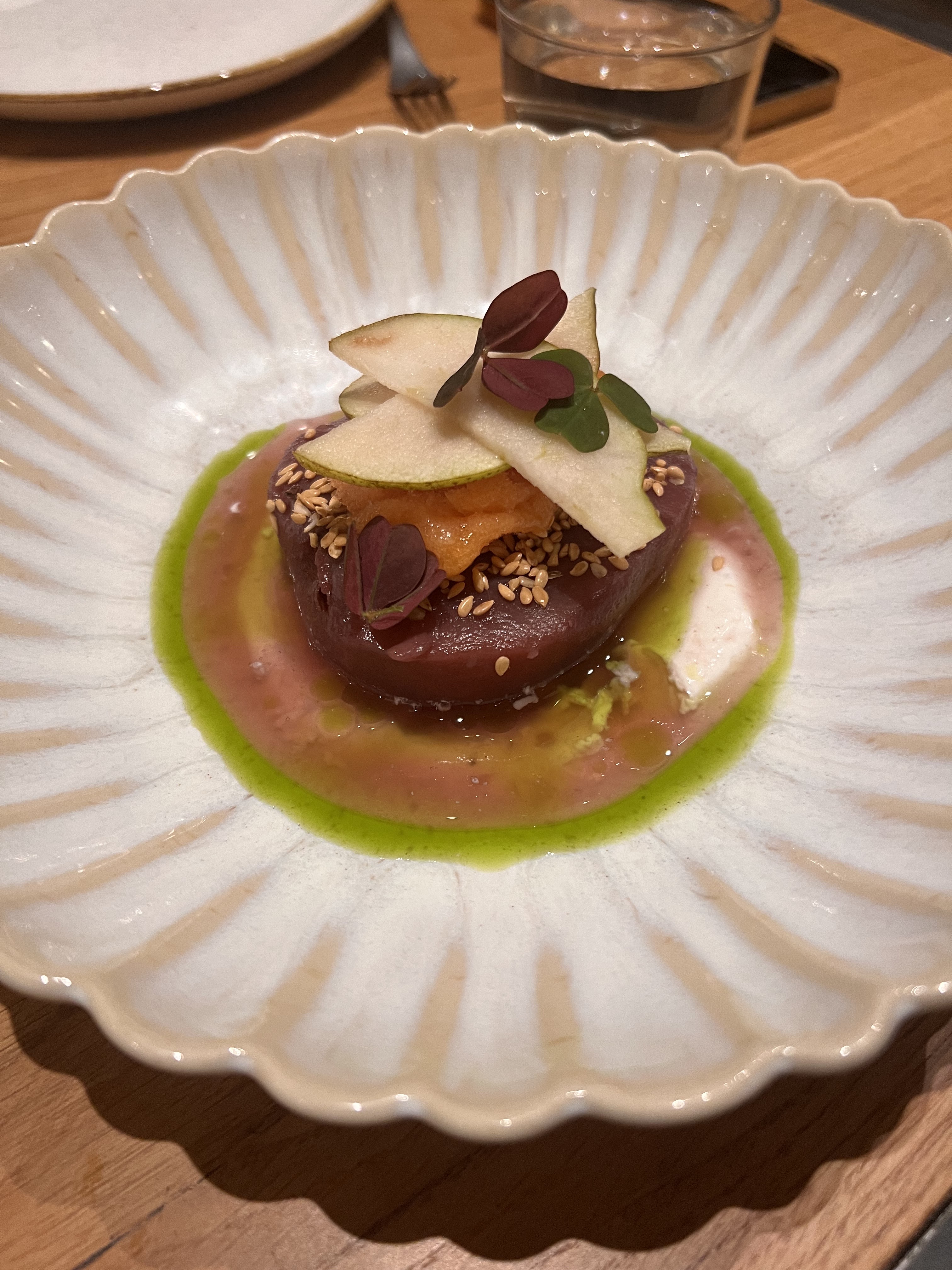 Je suis venu ici avec un groupe de 10 amis avec des régimes alimentaires très variés et tout le monde a vraiment eu une excellente expérience. La nourriture était très créative et savoureuse. La présentation était belle et réfléchie. Merci beaucoup pour l'excellent service et le repas mémorable !! Nous reviendrons absolument !! Je le recommande FORTEMENT.