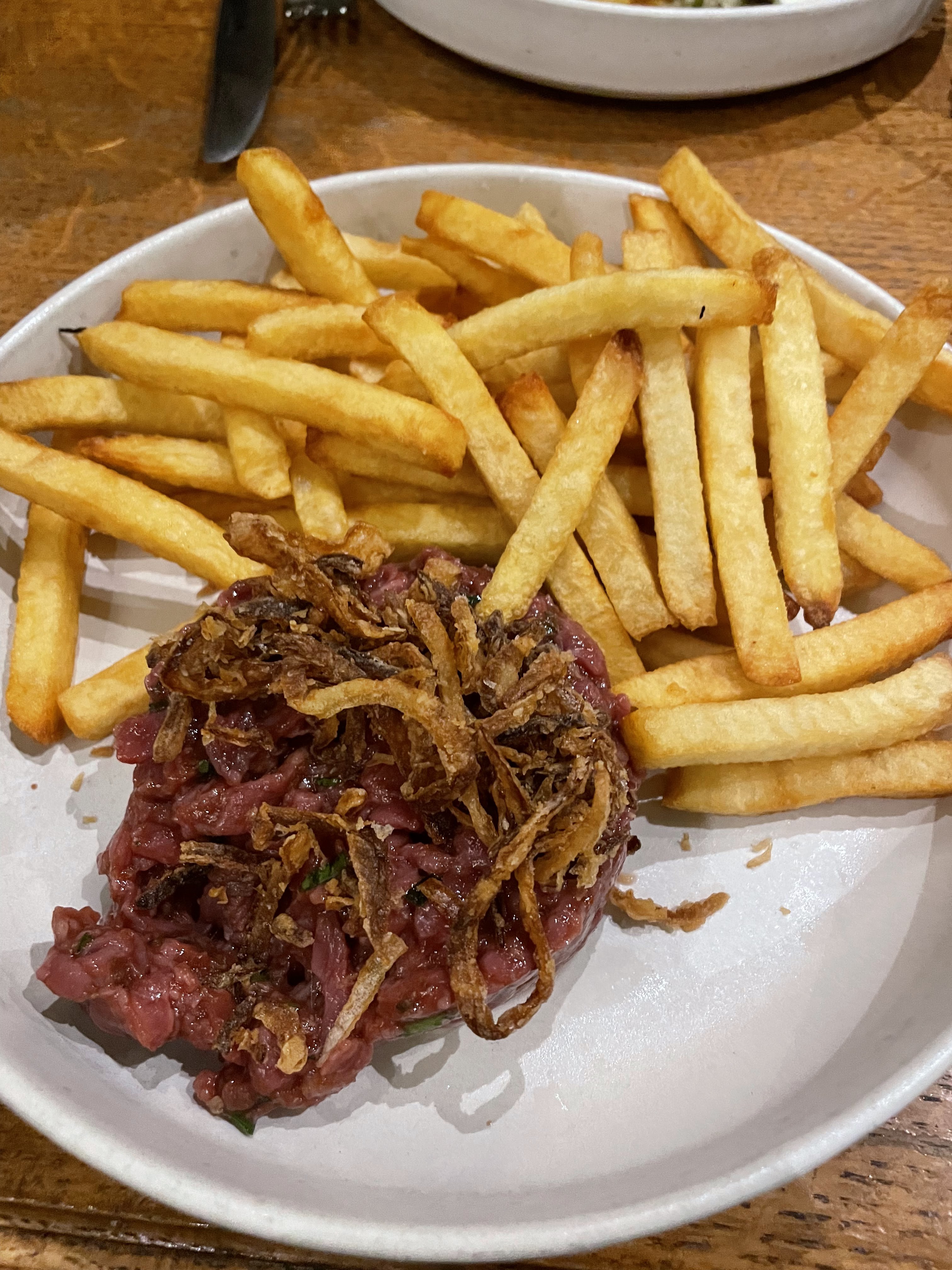 Je ne comprends pas comment certains commentaires peuvent dire que tout est fait maison. J'ai commandé un tartare (extrêmement basique, même pas de tabasco ou autres condiments apportés), les frites étaient clairement surgelées et sans intérêt, et le pompon : la salade qui allait avec n'avait même pas de vinaigrette ! Pour le coup mettre un peu d'huile ou de vinaigre (ou même une sauce achetée), c'est pas compliqué. Seul point positif : le cadre est joli et le service correct (encore que ceux qui mangeaient littéralement sur la route alors que des voitures circulaient n'étaient peut être pas du même avis). Vu le prix (élevé évidemment vu le quartier), il vaut mieux passer son chemin. Achetez vos frites surgelés & votre tartare au couteau à picard, la salade à monoprix, vous aurez le même repas pour 3 fois moins cher.