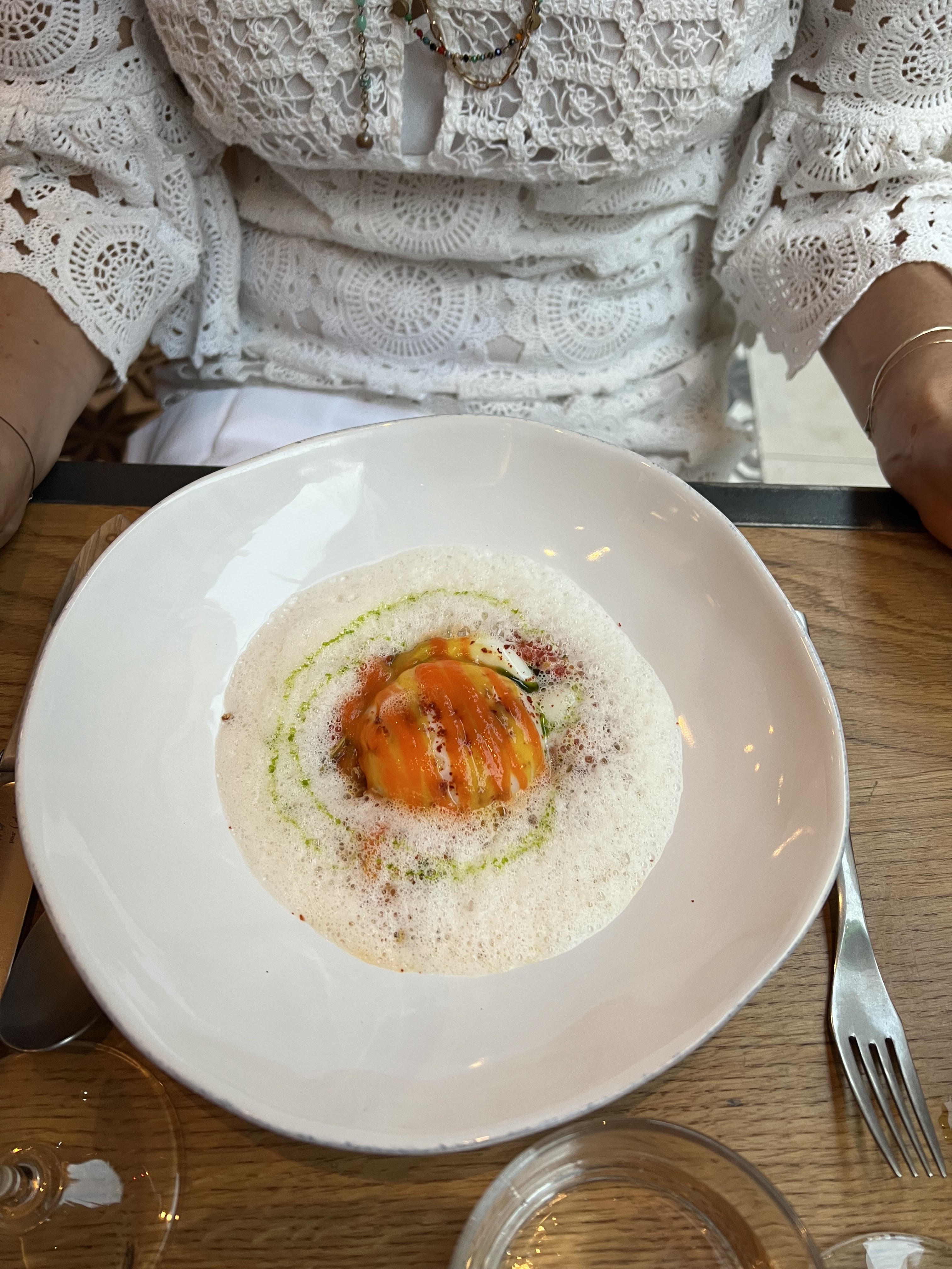 Les mots me manquent… (comme les ingrédients dans l’assiette) Quand les cuisines sont gérés par un expert comptable ça donne Colvert. De mini portions comme j’en ai jamais vu. En les voyant arriver à table, on en rigolait tellement c’était absurde. En photo, entrée à 13€ pour 2 cuillères à soupe de crème de maïs. Pas une cuillère de plus. Le plat volaille avec pomme paille, j’aurai du faire la photo : 2 allumettes de pomme de terre. 39€ les 3 noix de st Jacques coupes en 2 pour avoir l’impression qu’il y en a 6. Nous étions 3, une entrée, 1 plat chacun. 150€ sans boisson pour le déjeuner façon dînette d’enfants. Le pain était apporté 2 tranches par 2 tranches alors que nous étions 3 à table. Gênant du début à la fin. De sérieux doutes sur les commentaires élogieux laissés avec pléthores de photos sous toutes les coutures, de descriptifs, commentaires. Nous n’avons pas dû aller dans le même restaurant