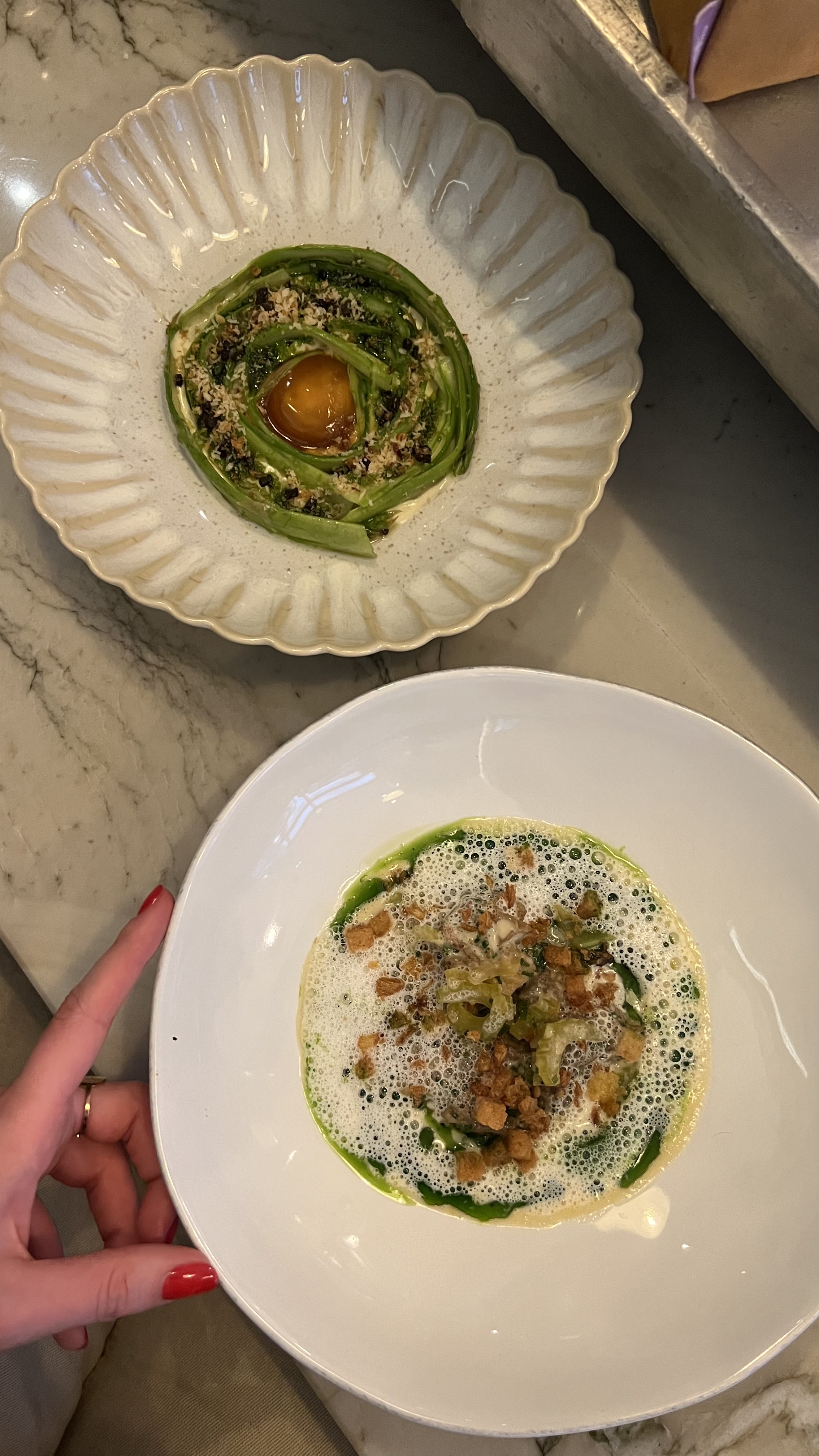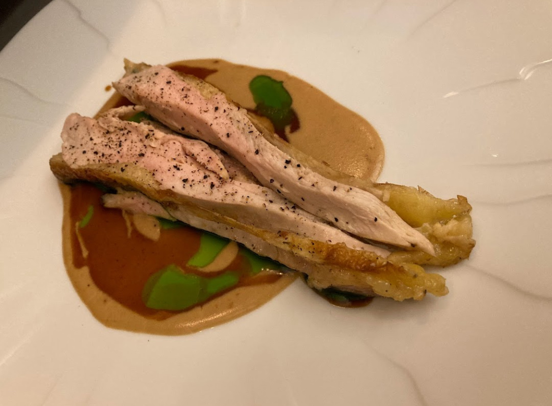 Très beau menu mais qqs petits erreurs Notamment une entre crabe celeri ou le on ne sent pas du tt le goût crabe et pas sa texture non plus. Accompagnement de la.pintade était froid ce qui est dommage car l émission d oignon était très bonne Sinon asperges blanches incroyable Poisson et veau aussi et tous les jus aussi Bcp de travail et parfois un tt petit petit peu trop de choses dans les plats qui fait qu on se perd un peu.