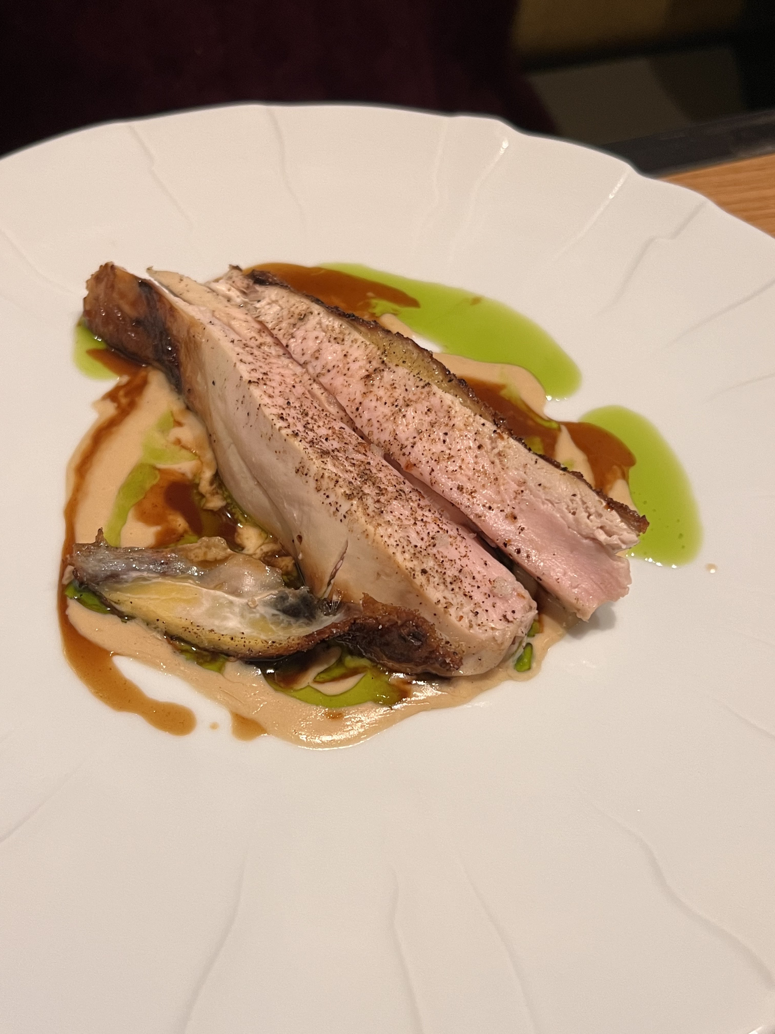 Beau coin salon. Personnel attentif et sympathique. Je recommande l'entrée de veau. Les cornichons à l'ikura, des saveurs exceptionnelles. J'aurais pu manger 5 de ces morceaux. Il y avait de la pintade comme plat principal, très tendre mais les saveurs ne me démarquaient pas. Pourrait goûter principalement la saveur originale de la volaille. Pain gratuit délicieux.
