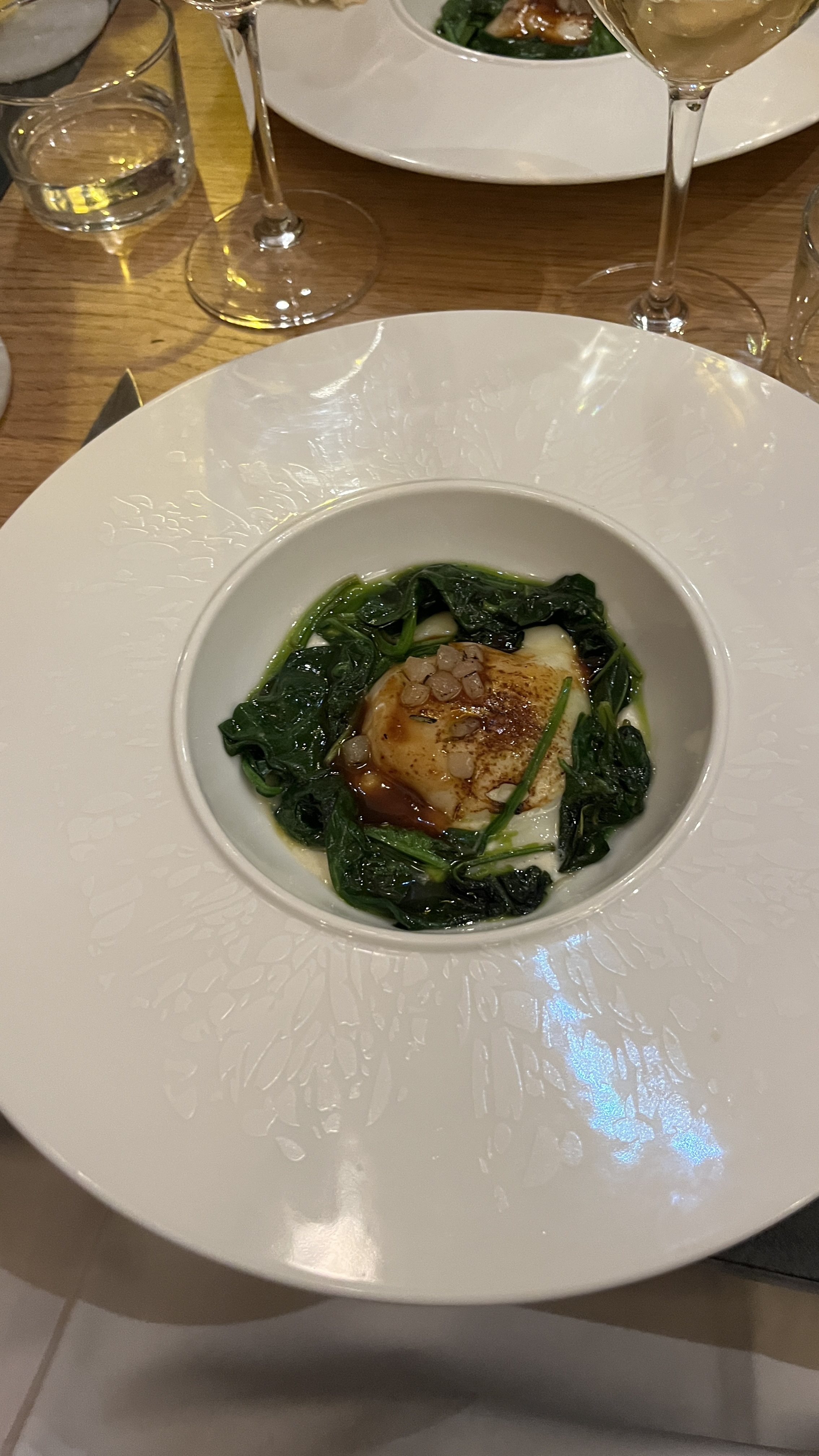 Saint Jacques à l’unilatérale coupées en deux trop froides épinards amers Service gentil mais lent Musique d’ambiance (comme partout actuellement ) assomante