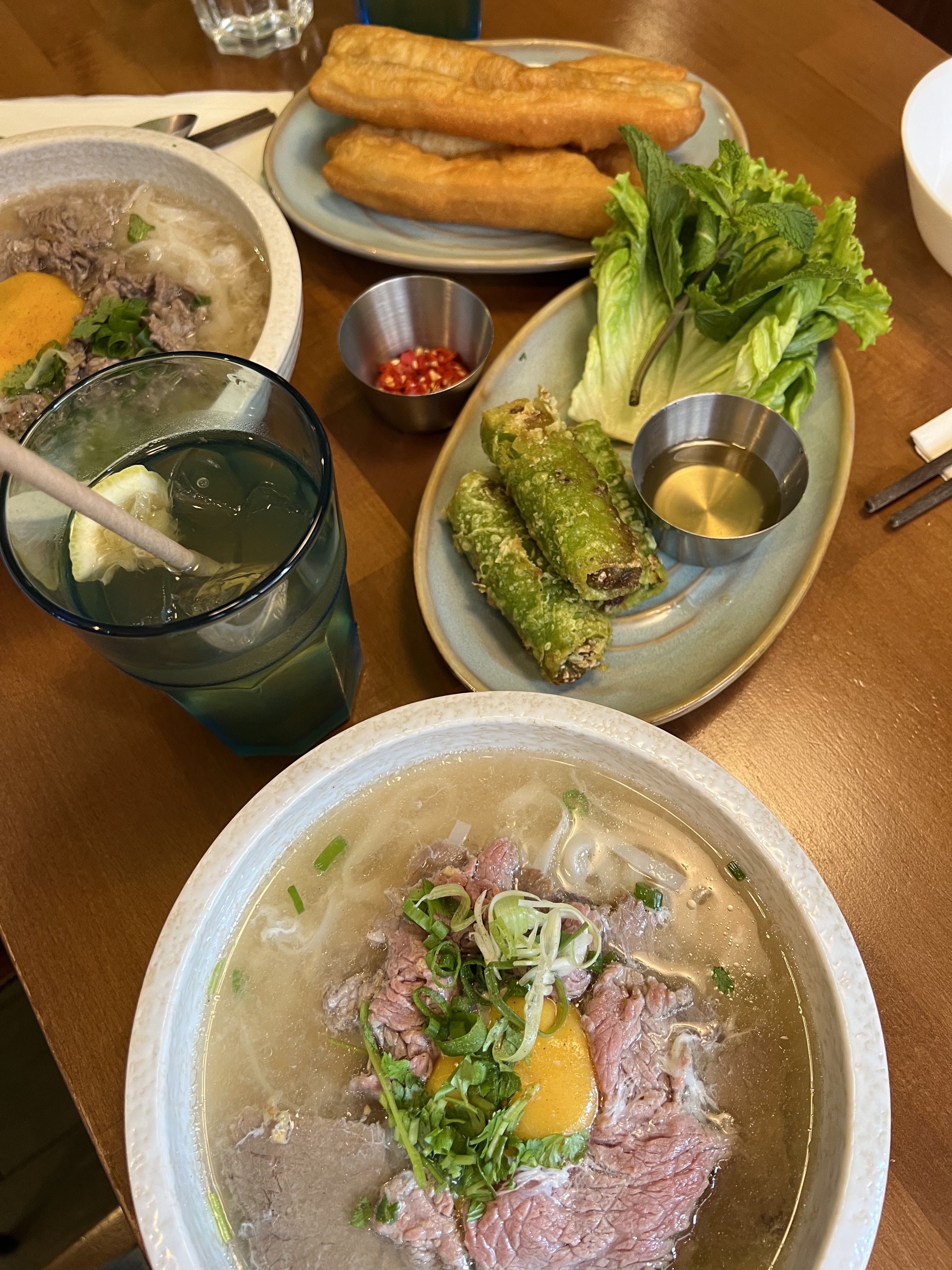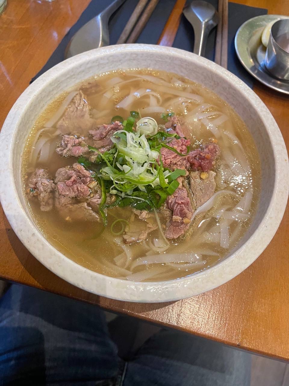 J'avais envie de quelque chose de chaud par une froide fin d'après-midi et j'étais ravi de trouver cet endroit ouvert; l'ambiance était agréable et il y avait suffisamment d'espace pour que ma famille de quatre personnes puisse s'asseoir confortablement. Nous avons commandé chacun un pho au bœuf et ma femme a commandé un rouleau de printemps frais. J'ai fini mon pho au bœuf et j'en ai commandé un deuxième. La soupe avait l'air bien dans la mesure où elle n'avait pas un goût trop salé et avait l'impression qu'elle était, comme le menu le suggérait, cuite pendant 24 heures. Les tranches de bœuf étaient tendres et pas trop moelleuses. Le plat était servi avec un citron et du piment, comme il se doit. Bonne quantité de coriandre et d'oignon nouveau. La glace à la noix de coco était une façon appropriée de terminer le dîner et était accompagnée d'une petite purée de mangue qui complétait la glace ; Je n’étais pas tellement fan des chips de riz sur la glace. Le personnel de service était attentif et a récupéré un petit plat de sauce de poisson dans la cuisine, à la demande de ma femme. Très content de l'expérience.