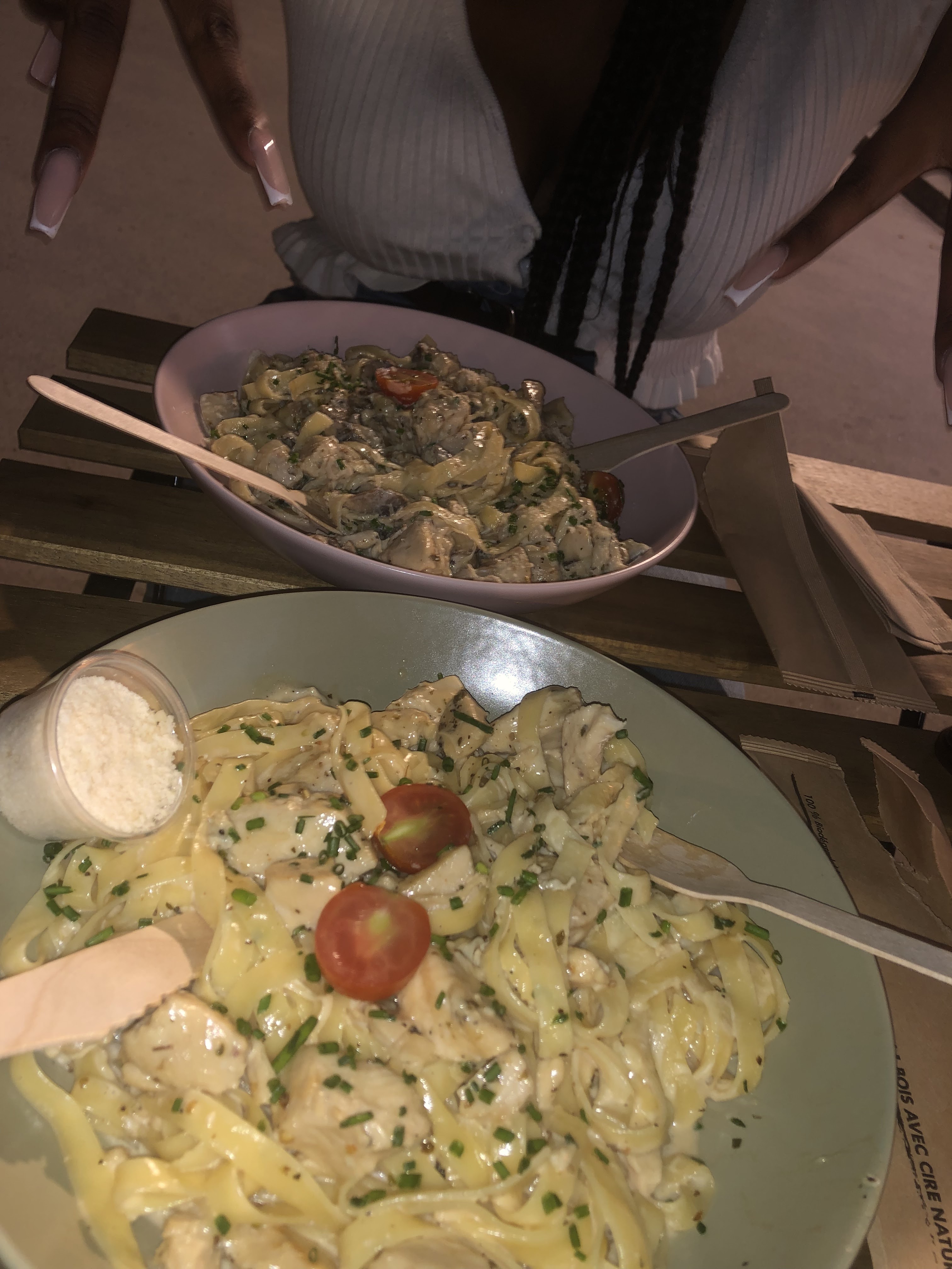 Nous étions deux, on a pris un burger et une pizza, nous avons trouvé ça bon, j'étais très étonné par la pizza. Pour le négatif, la taille du burger est pas incroyable par rapport au prix, manger avec des couverts en bois n'est vraiment pas agréable ! Le monsieur qui accueille les clients est très sympa, ce qui est des cuisiniers par contre...