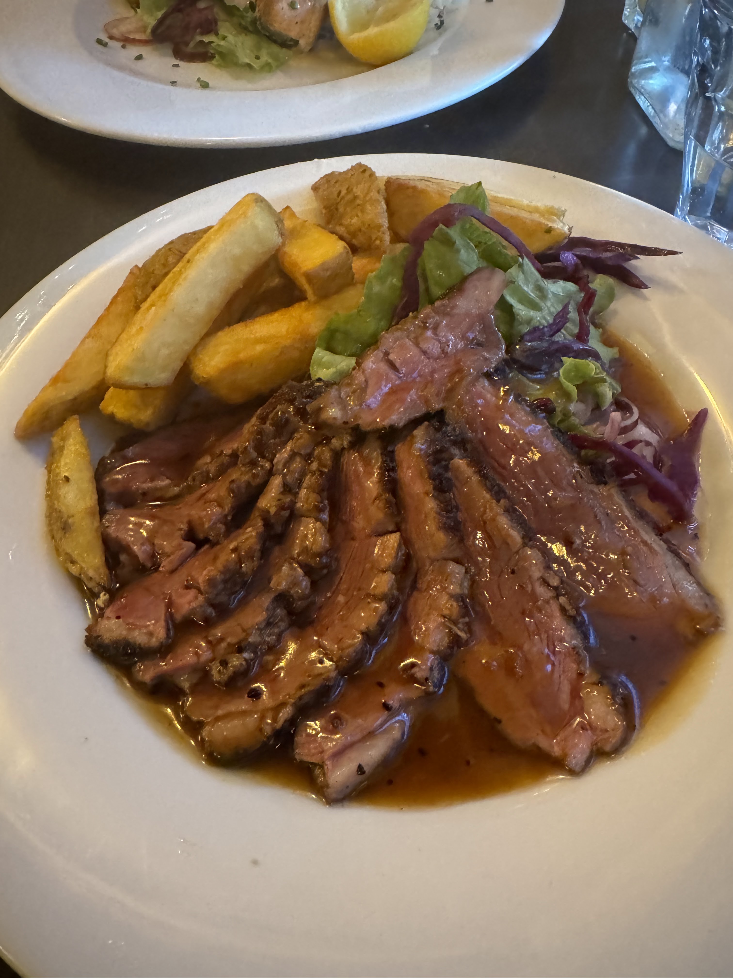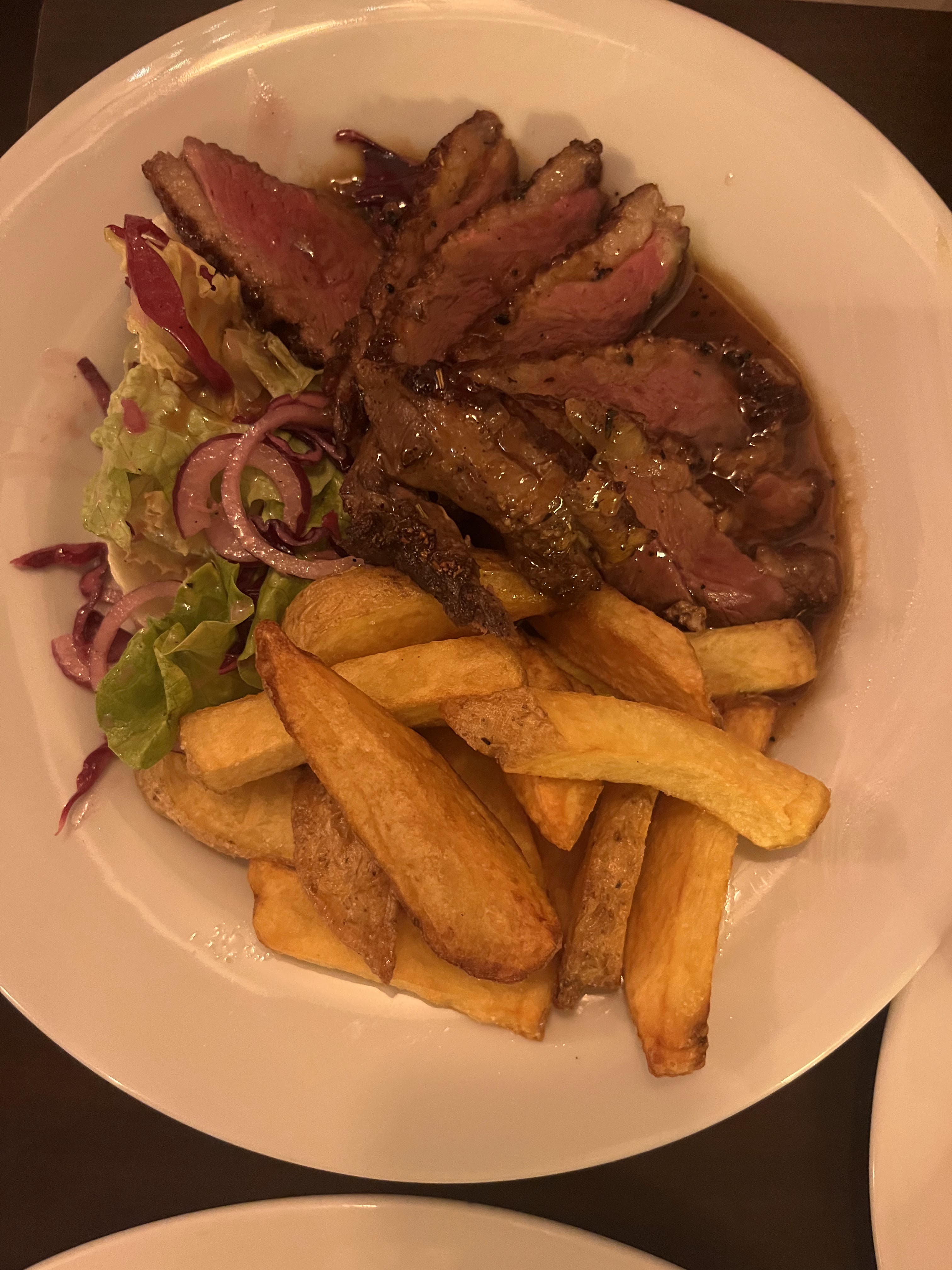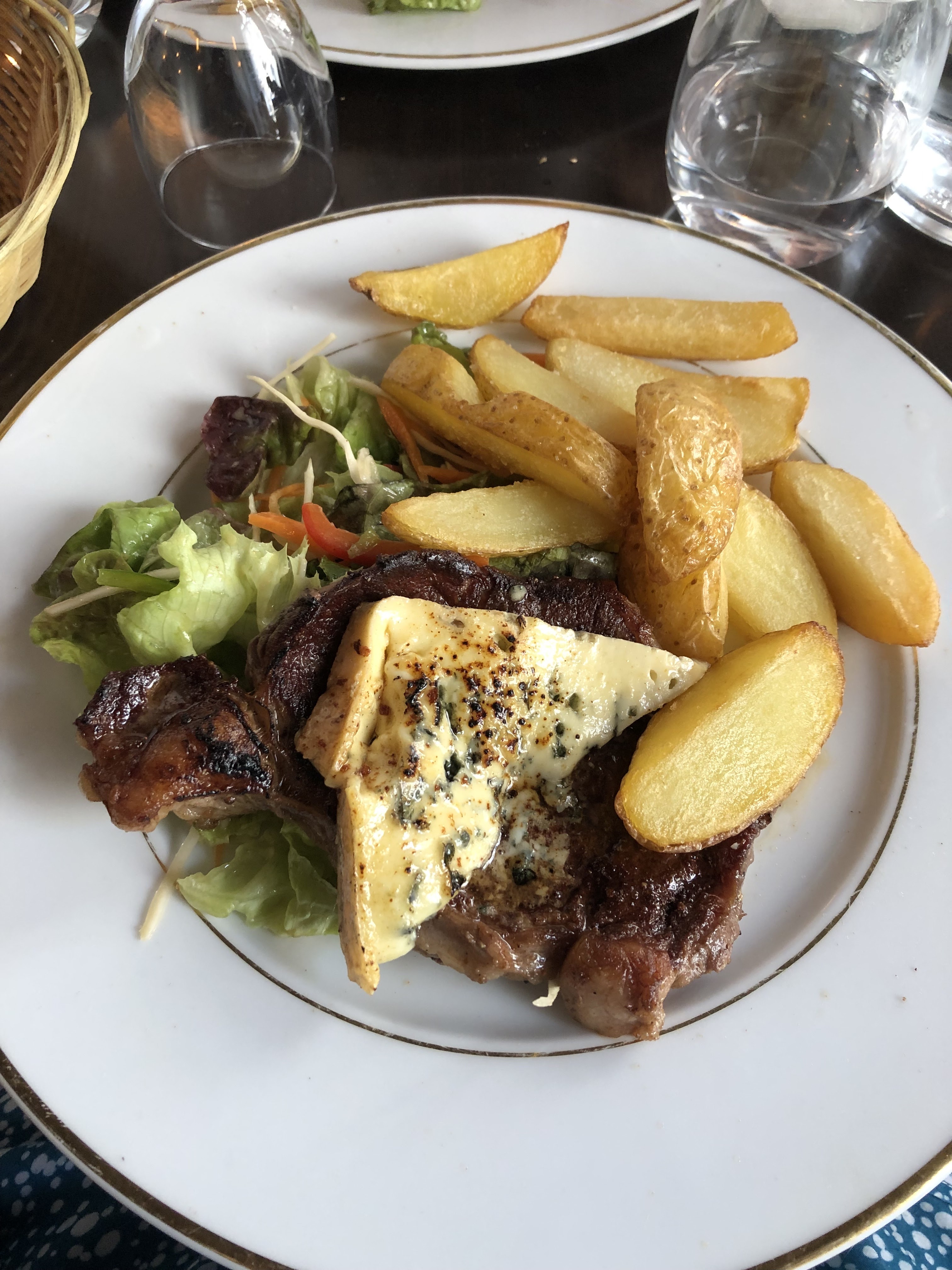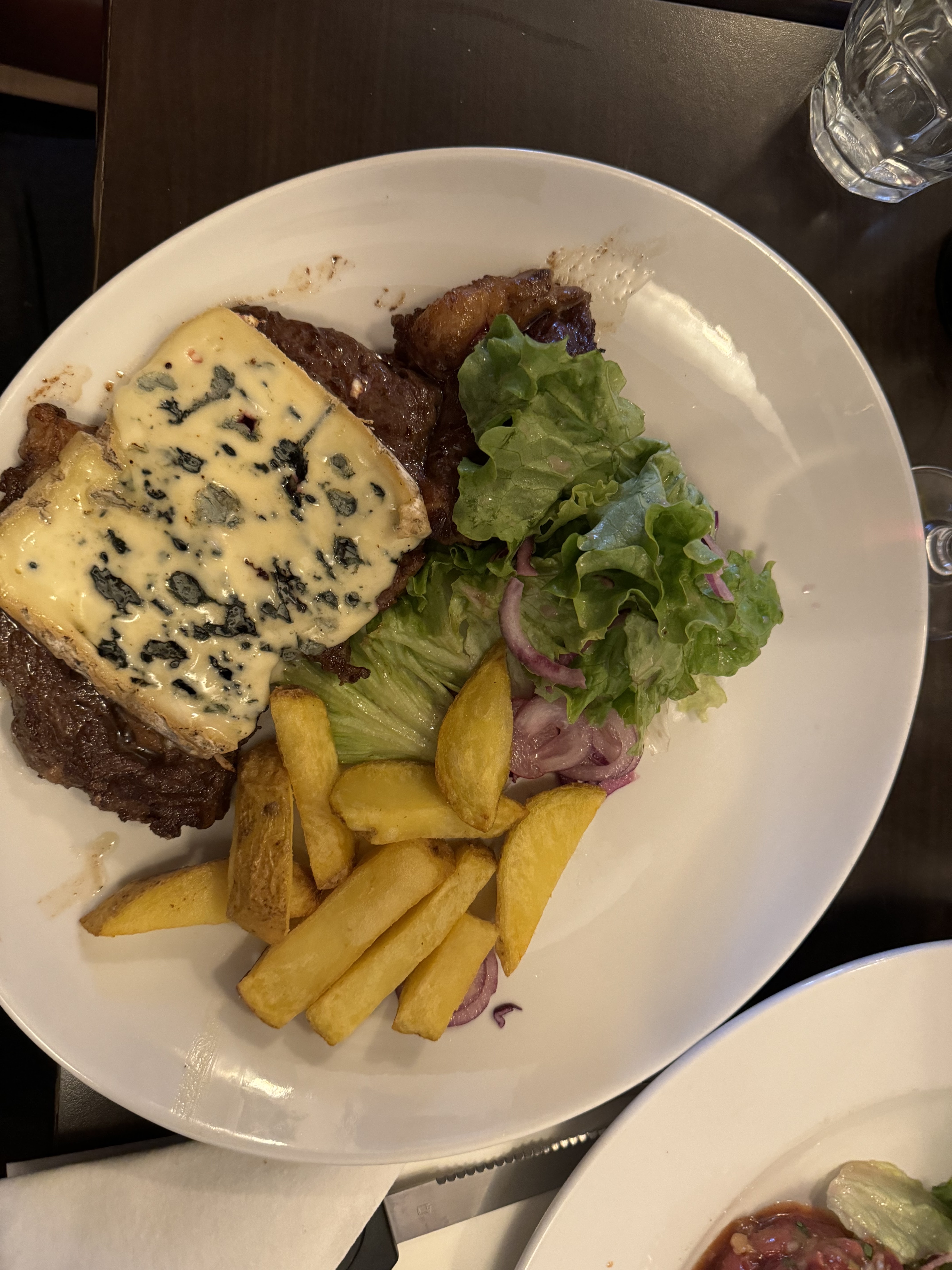 Bonne nourriture. Le steak était bon. Je ne suis pas fan des steaks en France en général, car ils ont tendance à avoir des tendons moelleux et autres bandes de tendons sur les bords du steak, ce qui les rend difficiles à manger en général. Mais le steak était bien cuit et la sauce au fromage bleu (en France !) était bonne aussi. J'ai aussi eu la soupe à l'oignon française, qu'il était approprié d'essayer en France. Je reviendrais pour le service incroyablement sympathique et pour essayer d'autres plats !