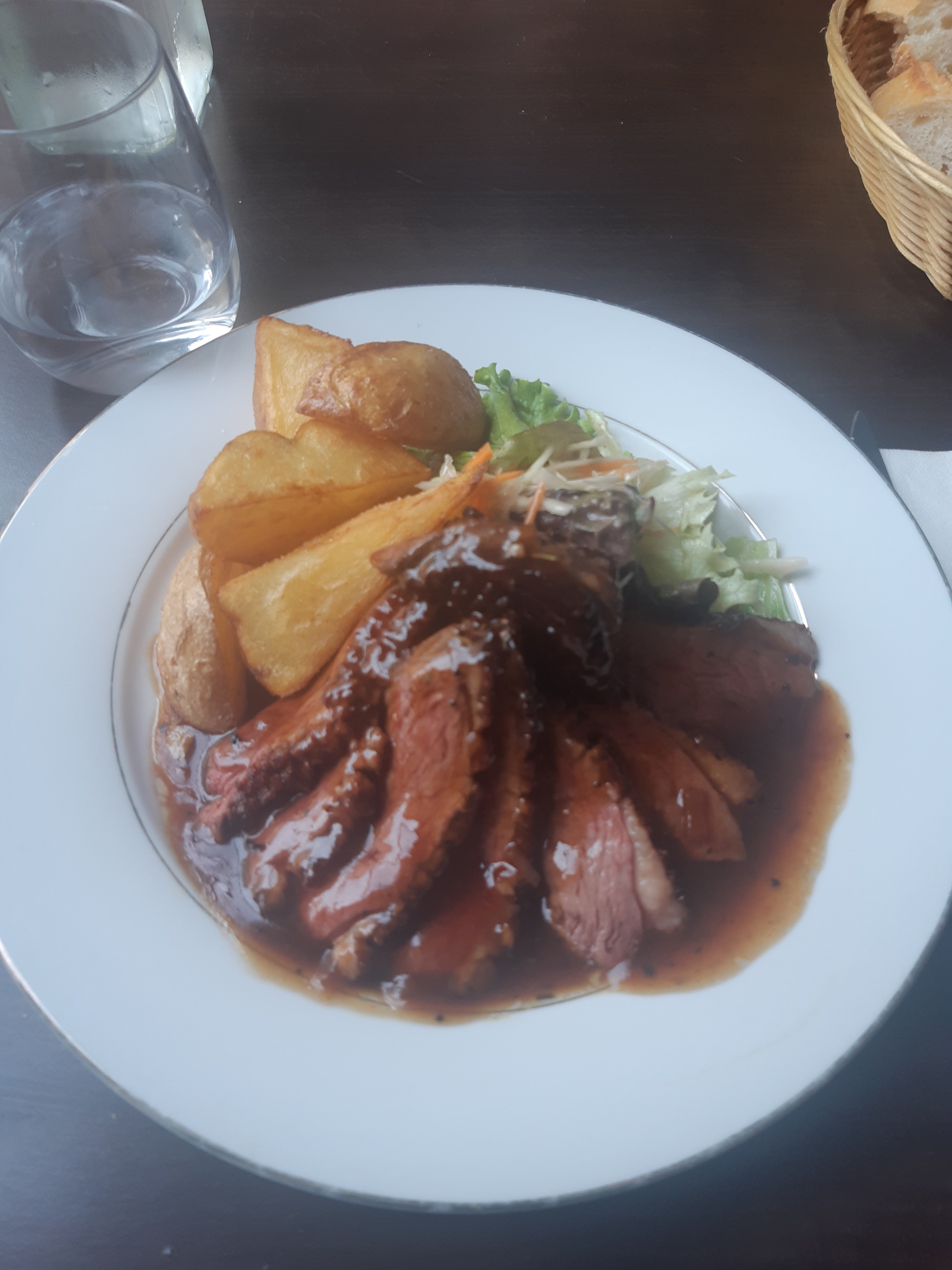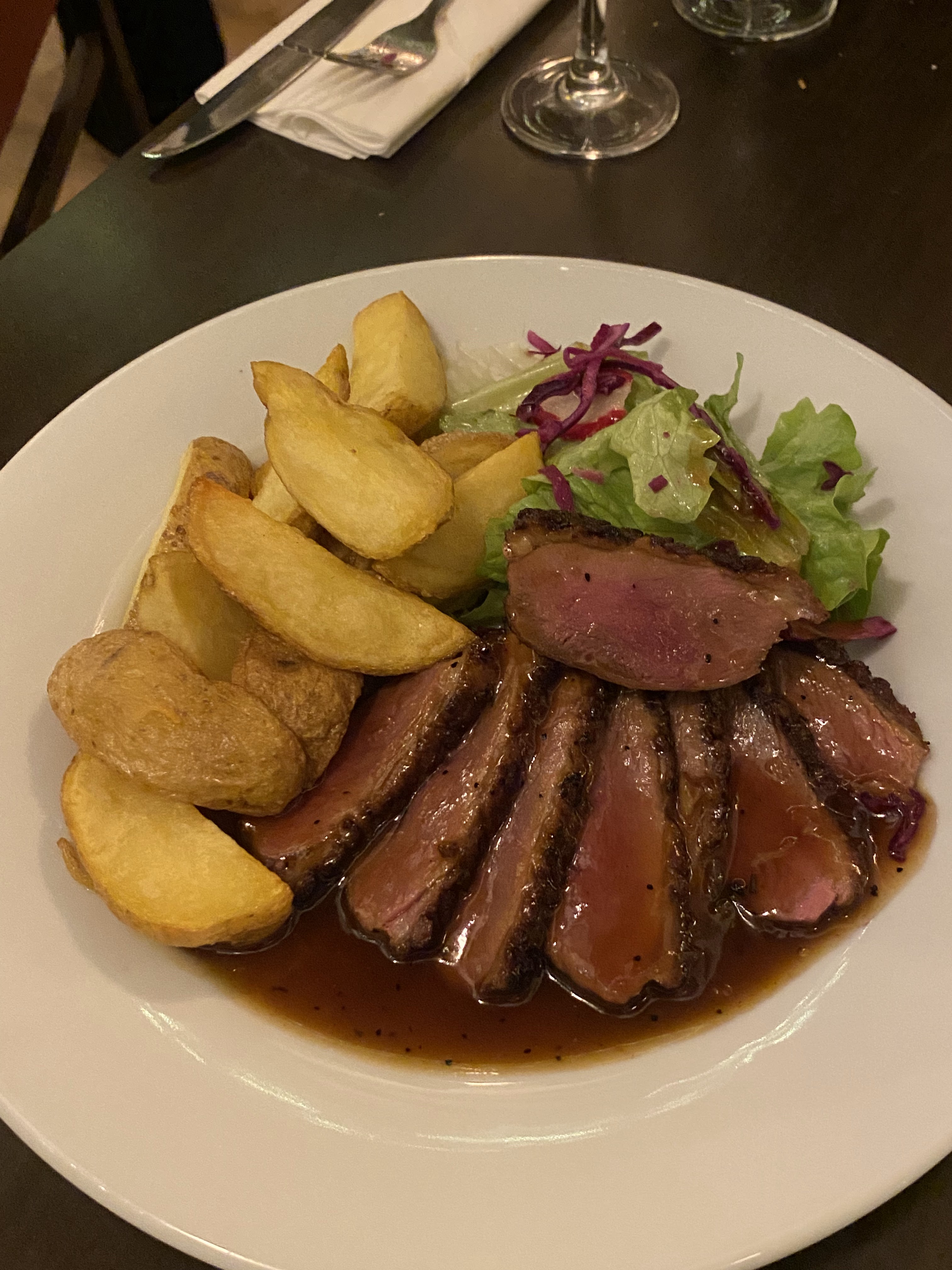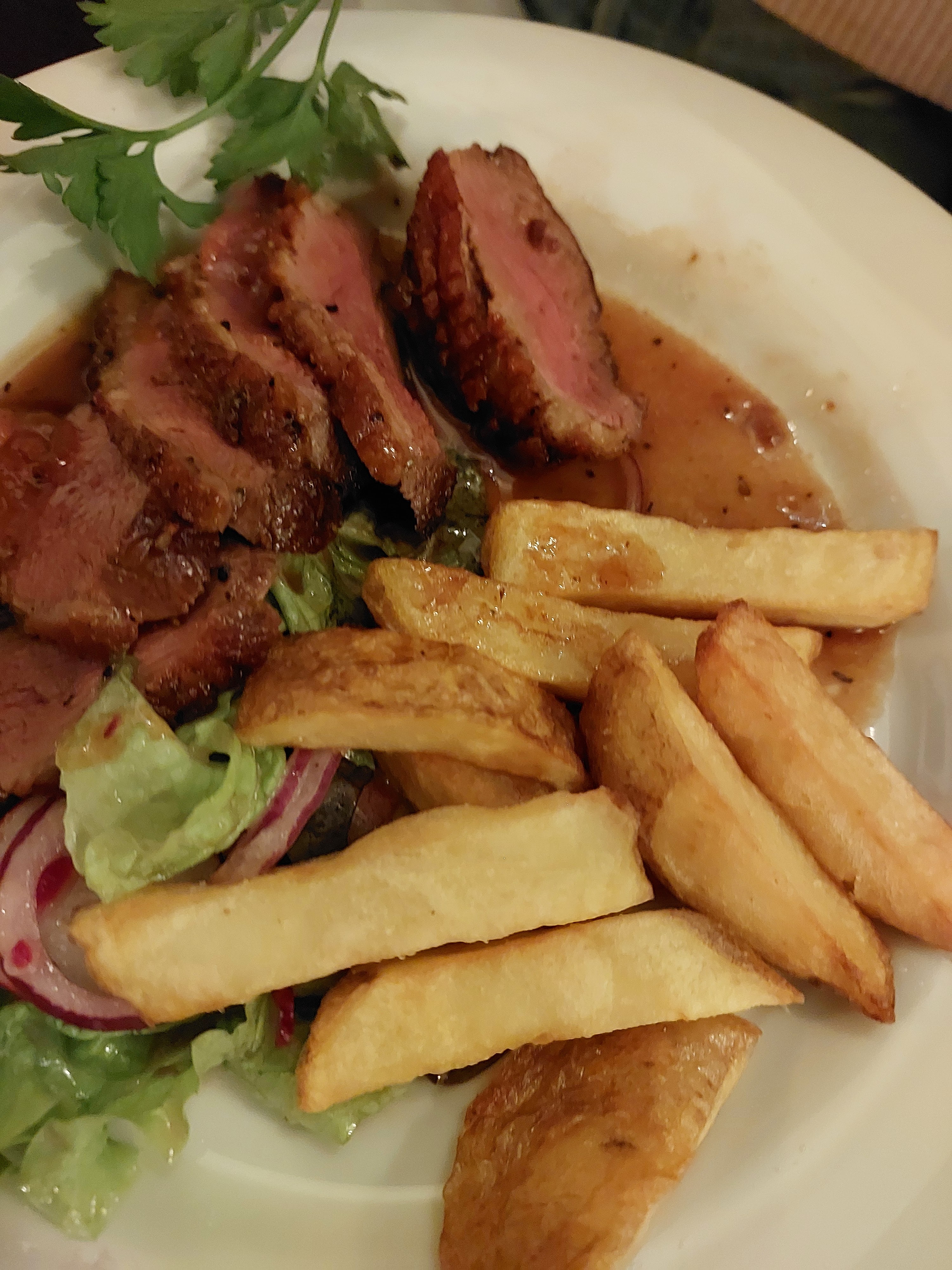 La nourriture était fantastique ! J'ai eu le magret de canard. C'était parfaitement assaisonné et les pommes de terre bien dorées. Je me suis assis à l'étage; le serveur est très sympathique et attentionné ; contrairement à d'autres serveurs que j'ai rencontré en France ! Le prix était raisonnable aussi. J'ai payé 16 pour le magret de canard. L'endroit semble neuf (ils jouaient de la musique d'ambiance depuis leur téléphone haha) et ils sont en train de réfléchir à leur organisation mais ils sont définitivement bien partis.