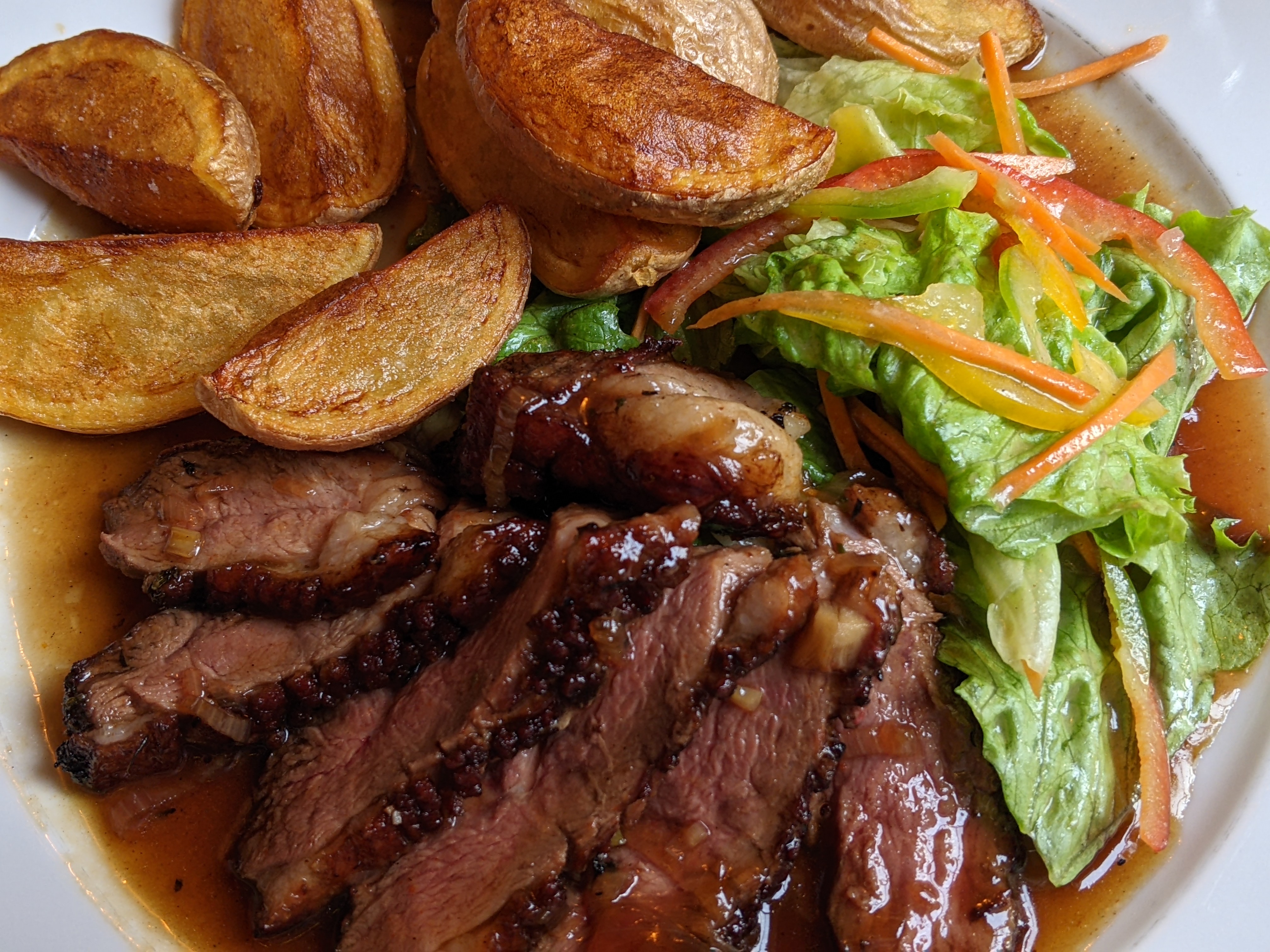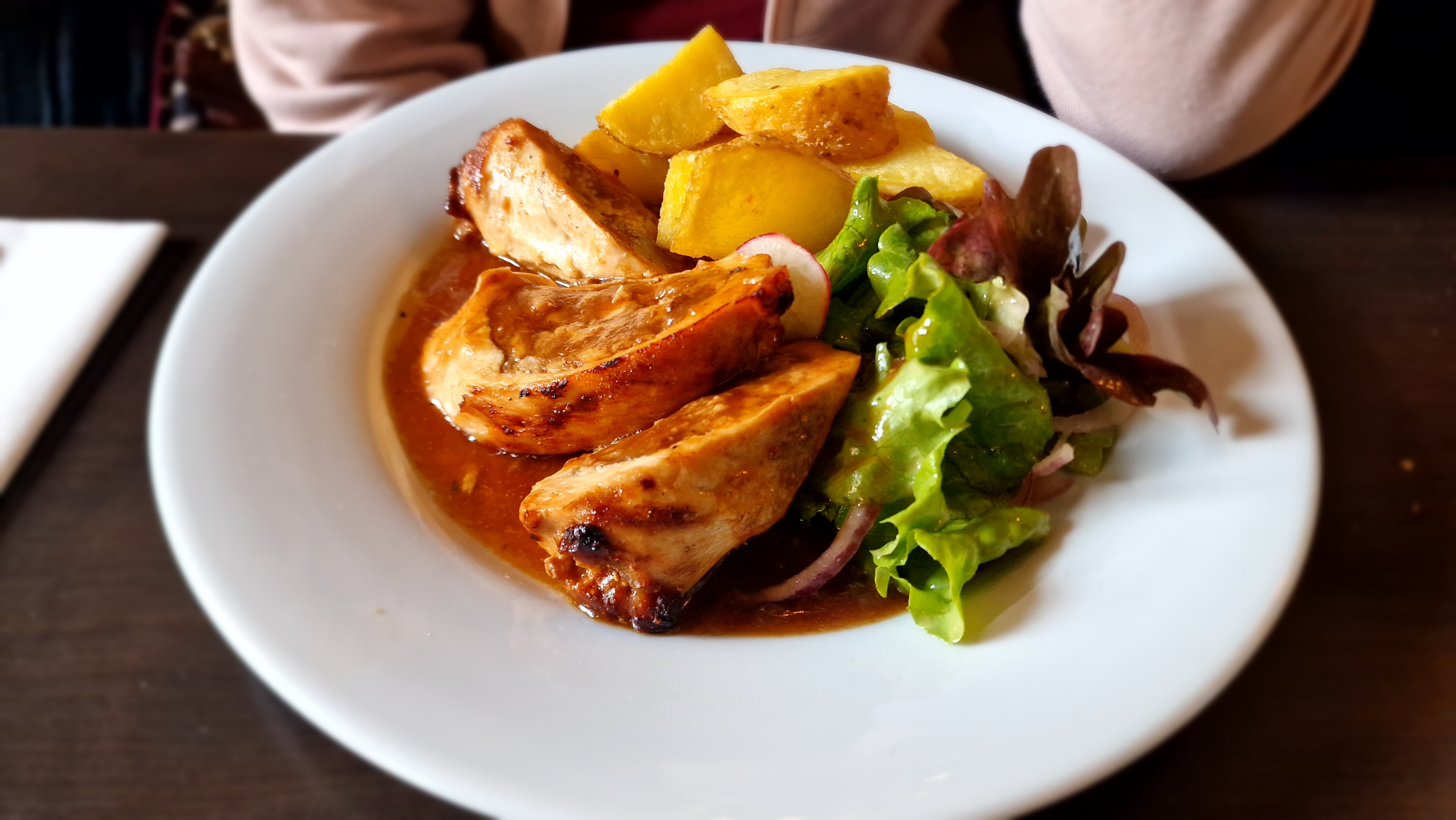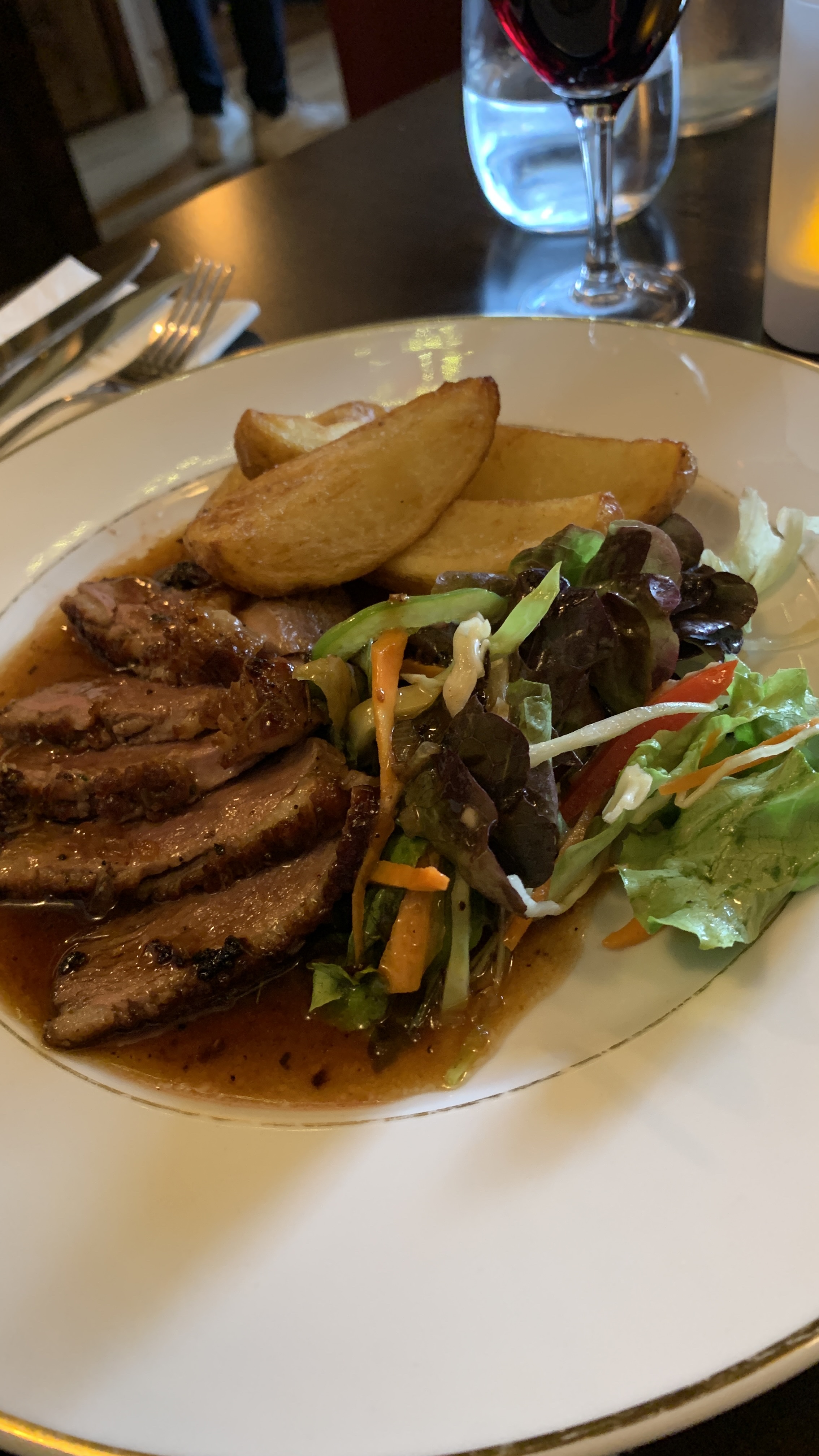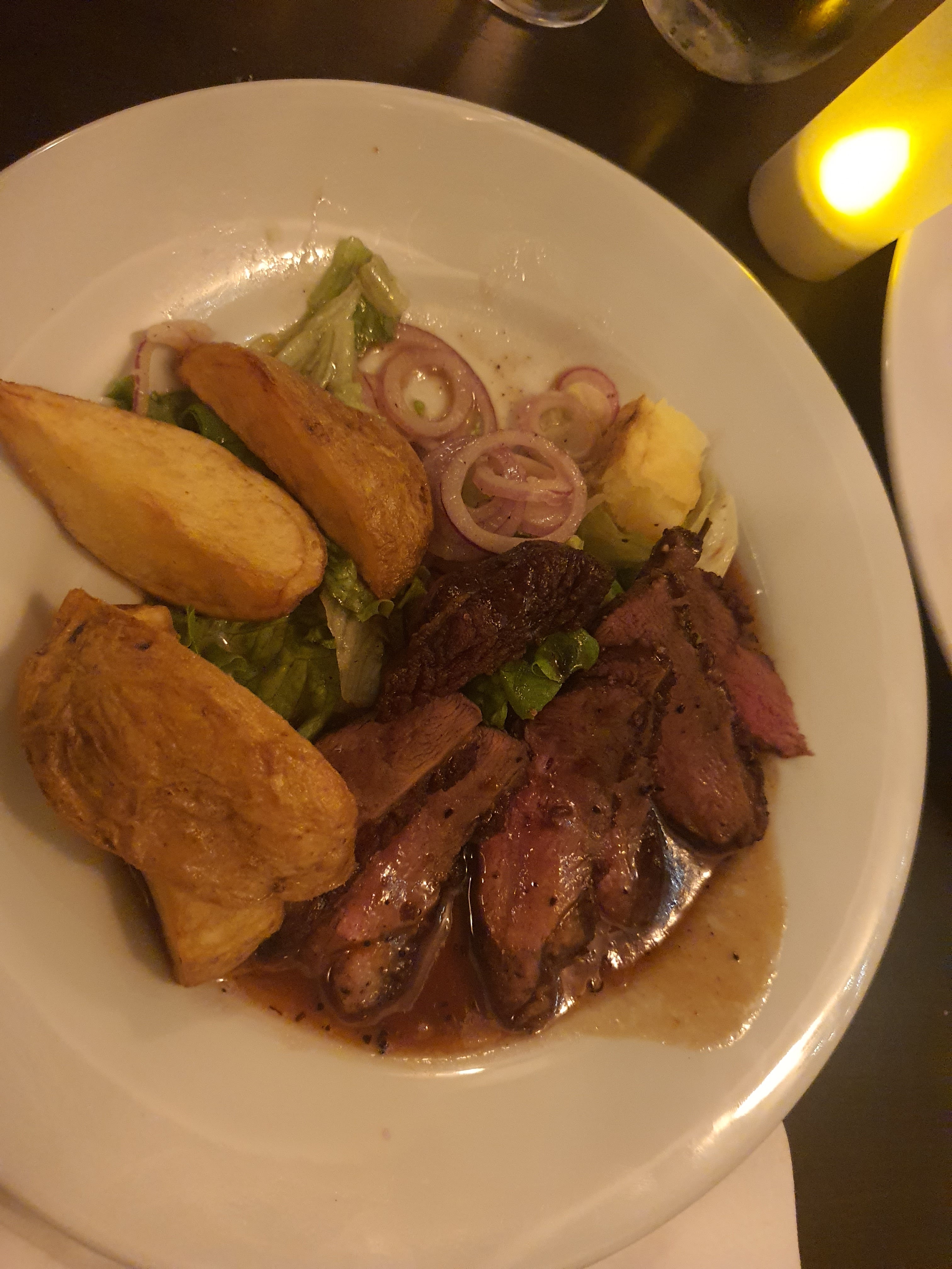 La nourriture était fantastique ! J'ai eu le magret de canard. C'était parfaitement assaisonné et les pommes de terre bien dorées. Je me suis assis à l'étage; le serveur est très sympathique et attentionné ; contrairement à d'autres serveurs que j'ai rencontré en France ! Le prix était raisonnable aussi. J'ai payé 16 pour le magret de canard. L'endroit semble neuf (ils jouaient de la musique d'ambiance depuis leur téléphone haha) et ils sont en train de réfléchir à leur organisation mais ils sont définitivement bien partis.