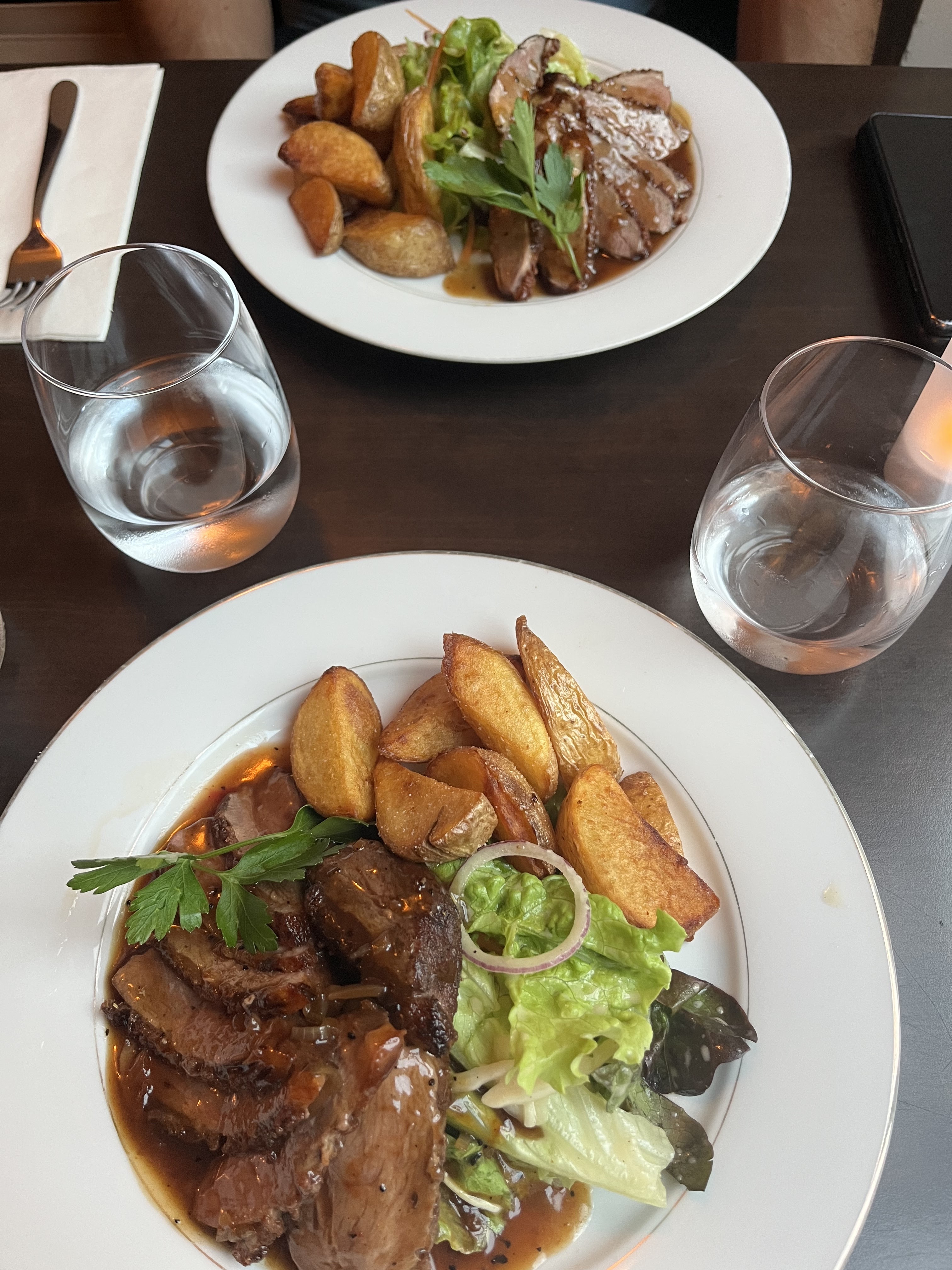 Lorsque nous sommes entrés pour la première fois dans le restaurant après avoir hésité un peu dehors, un Français plus âgé qui dînait au premier étage nous a donné un coup de pouce, ce qui nous a donné l'espoir que nous avions fait le bon choix. La nourriture ici ressemble à un repas maison français raffiné. Très satisfaisant et délicieux tout en étant abordable. Nous avons eu le bœuf bourguignon et le magret de canard et les deux étaient délicieux. Le magret de canard a presque fondu dans la bouche. Le service était chaleureux et gentil même si le quartier est très touristique.