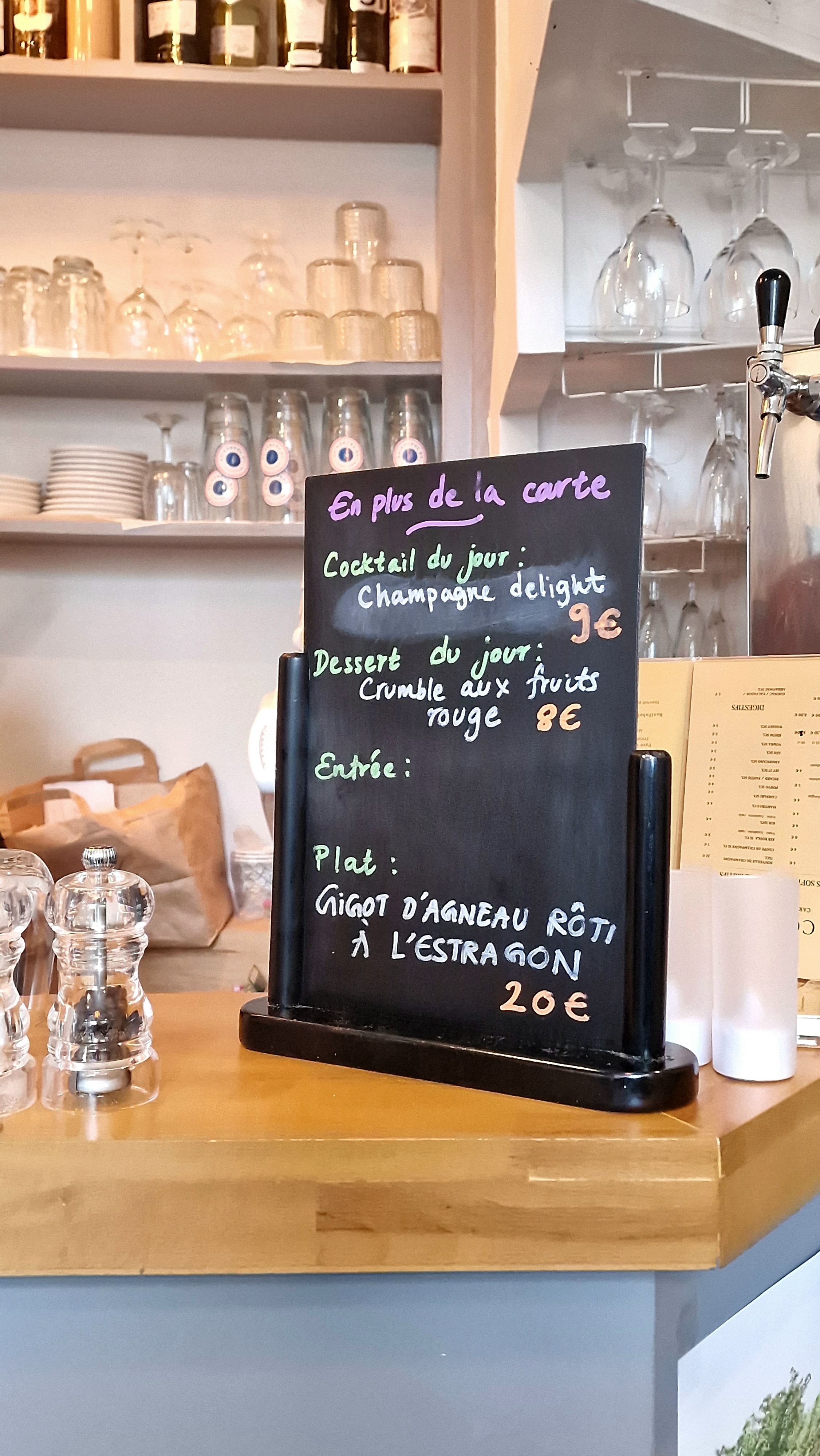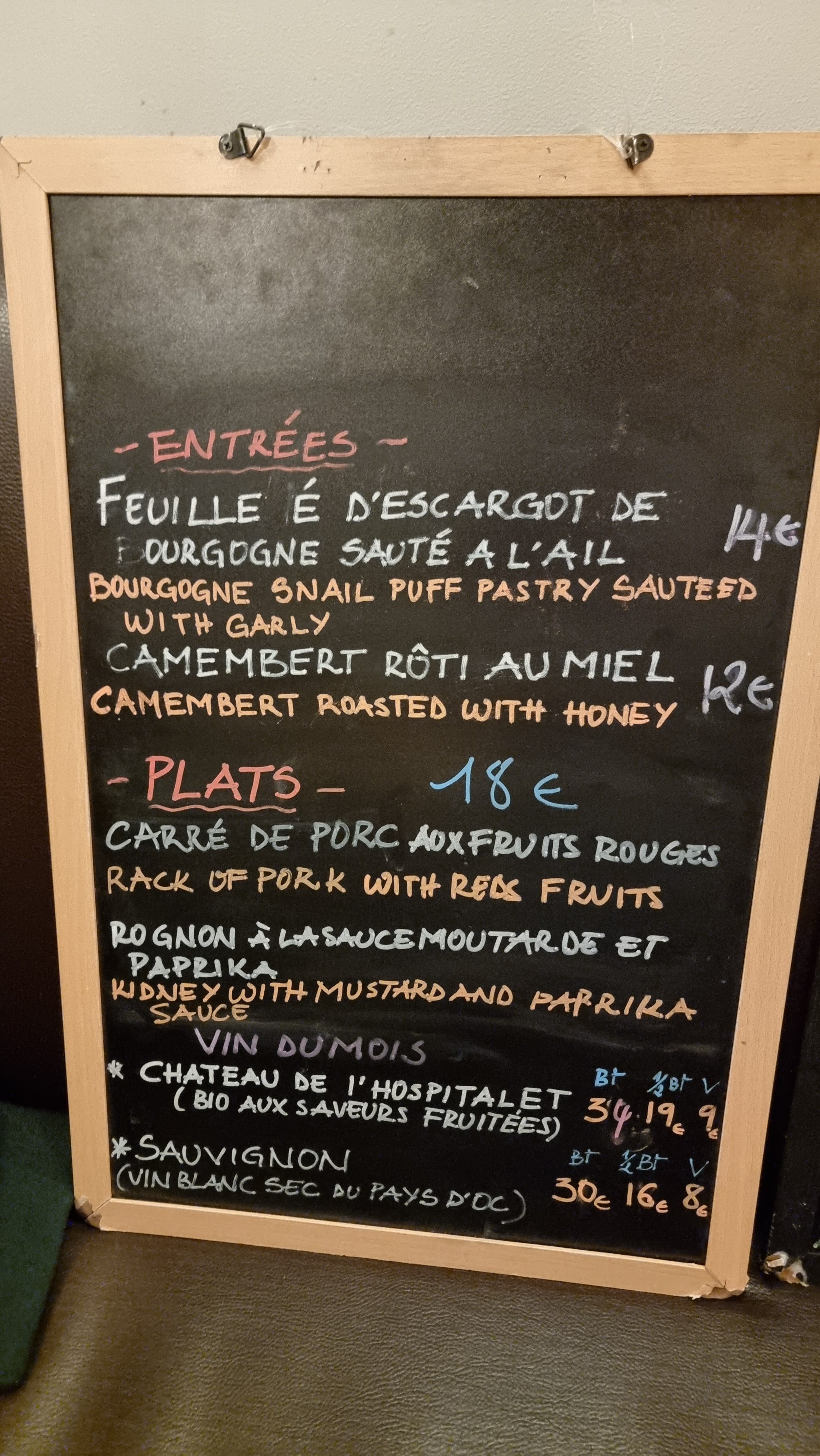 Le prix par plat est de 10 à 20 €. La nourriture est délicieuse. Si vous ne buvez pas de vin, vous pouvez demander de l'eau du robinet ou d'autres boissons. Surtout, le personnel est très sympathique et sait communiquer en anglais et en français. Et la salle de bain à l'étage est propre.
