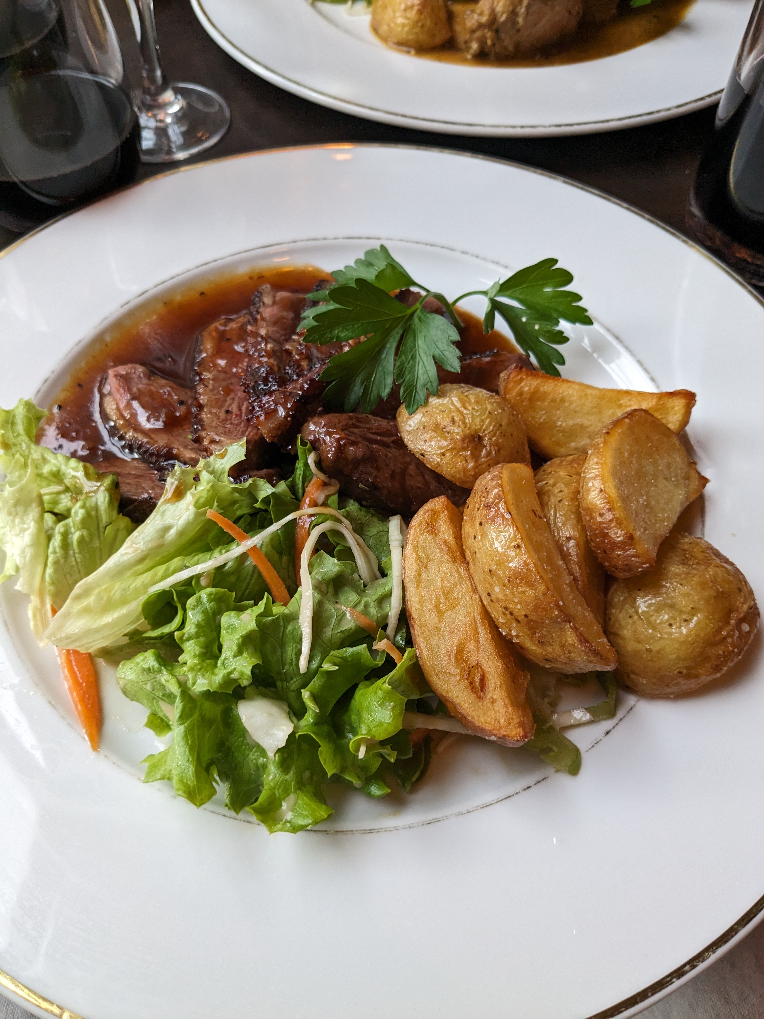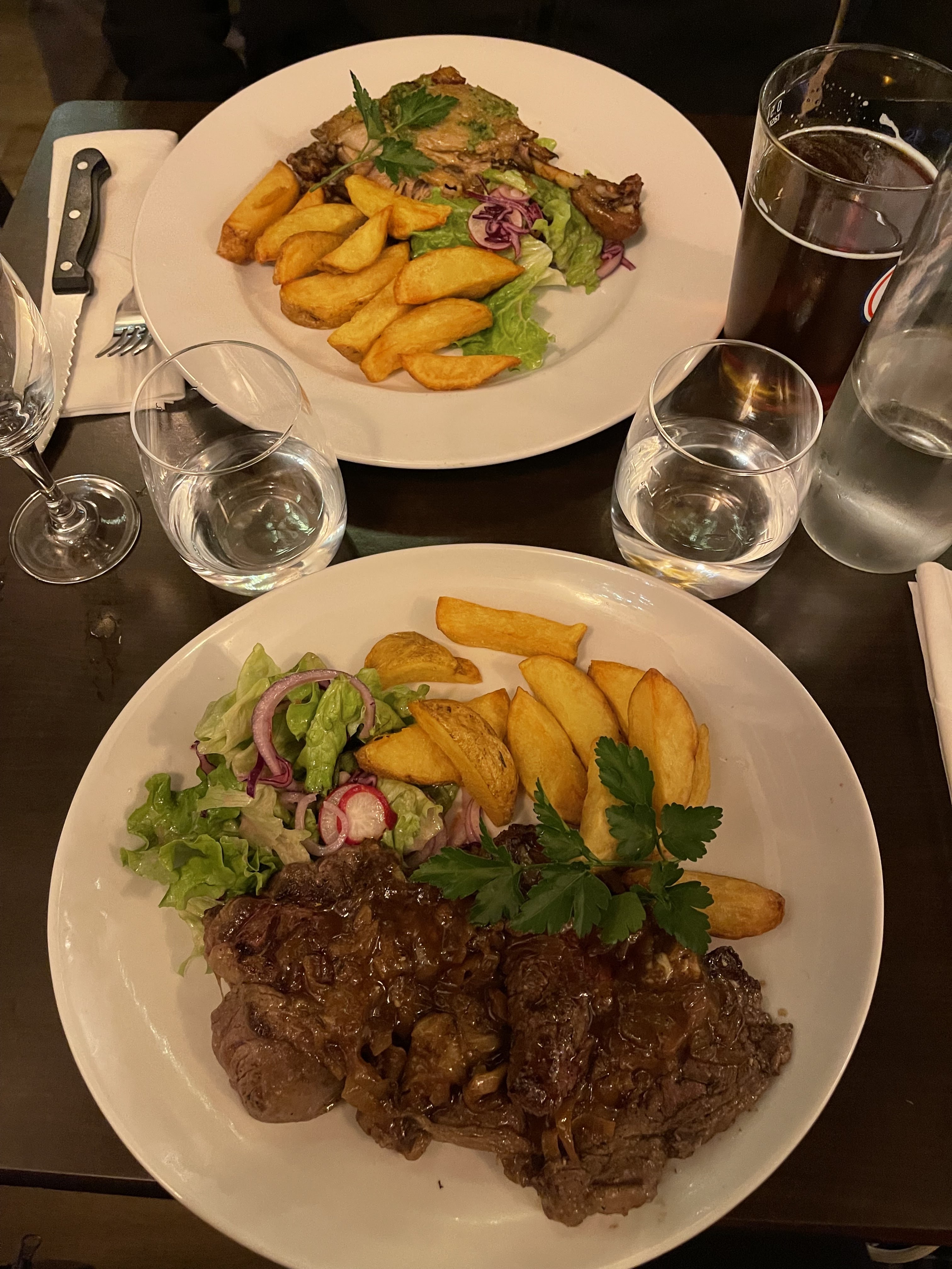 Authentique, délicieux ! Nous avons eu la soupe à l'oignon française. Le meilleur que nous ayons jamais eu. Ma femme a eu le magret de canard (incroyable) et j'ai eu le steak sauce au beurre d'échalote. Je reviendrais certainement ici chaque fois que je serai à Paris. Un VRAI joyau caché.