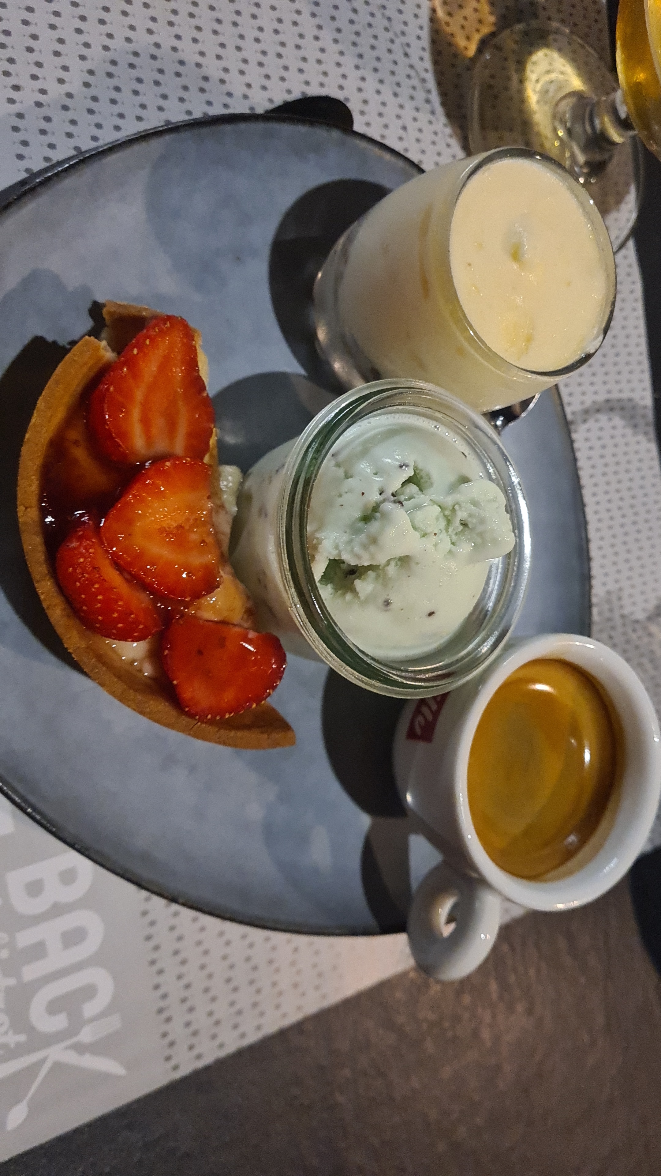 Dans l'ensemble le repas était correcte. L'entrée bonne mais il manquait des tostes pour manger le foie gras. Le plat principal : la viande était très bonne, l'accompagnement bon aussi. Pour le dessert la glace était très bien mais pour ma part je n'ai pas aimée la crème aux chocolats. Juste le prix du menus pour la St Valentin à 45 euros était je trouve un petit peut chère.
