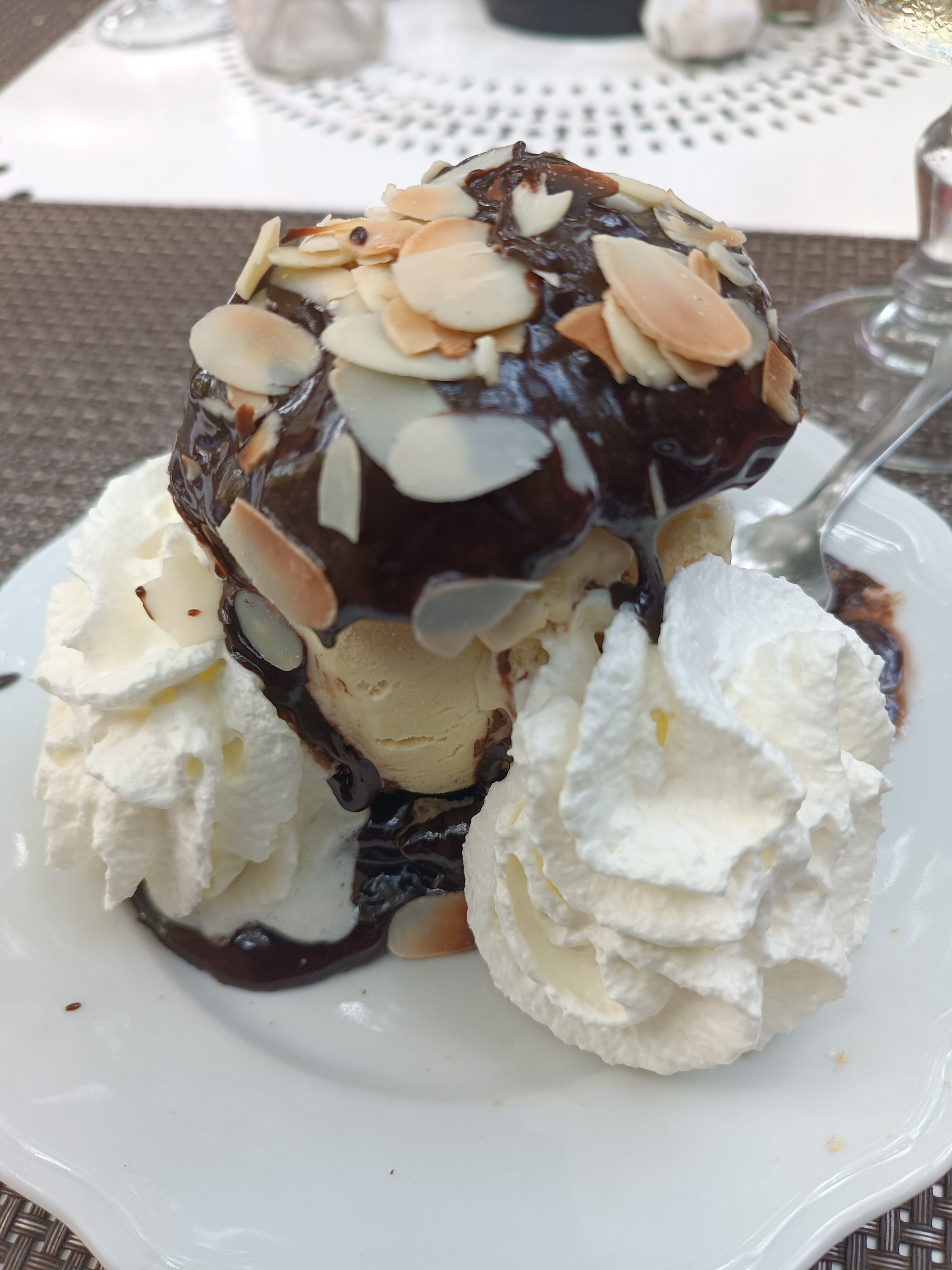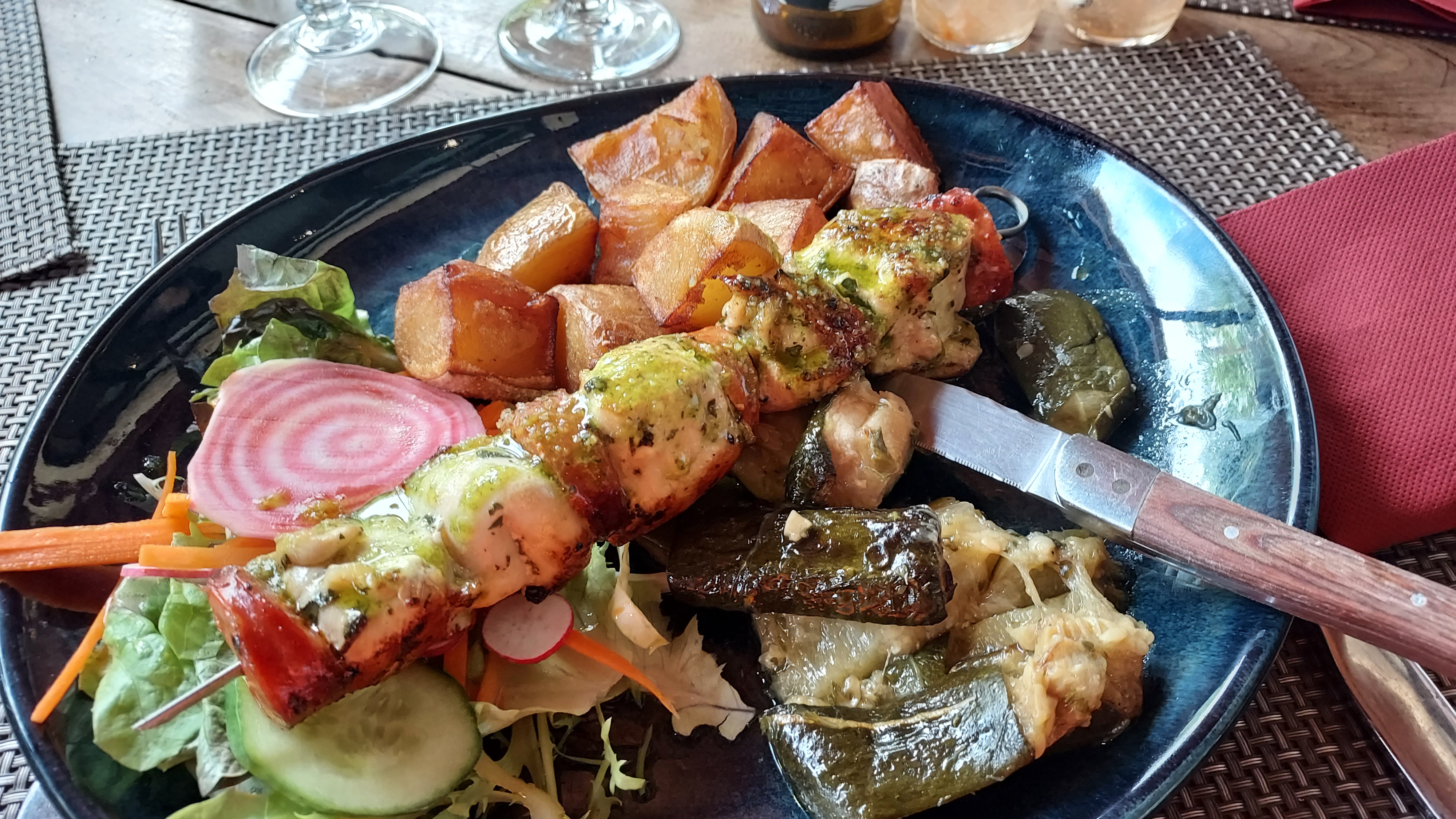 Bien, j'étais dans un groupe de 20 personne (donc pas toujours facile à servir) et bien, à l'ombre (par ces chaleur solliciter sous les arbres)... Bonne cuisine et suffisante...