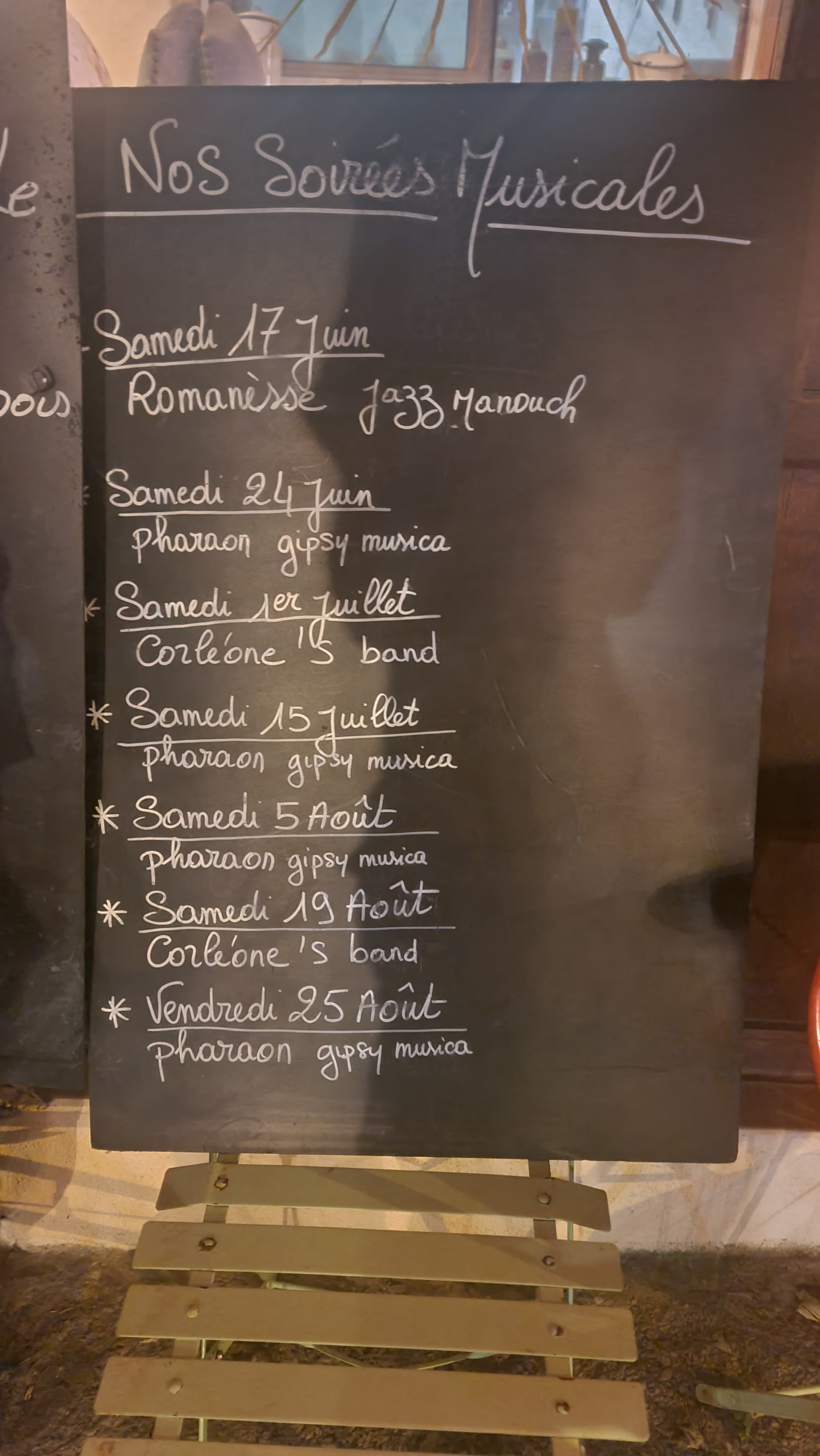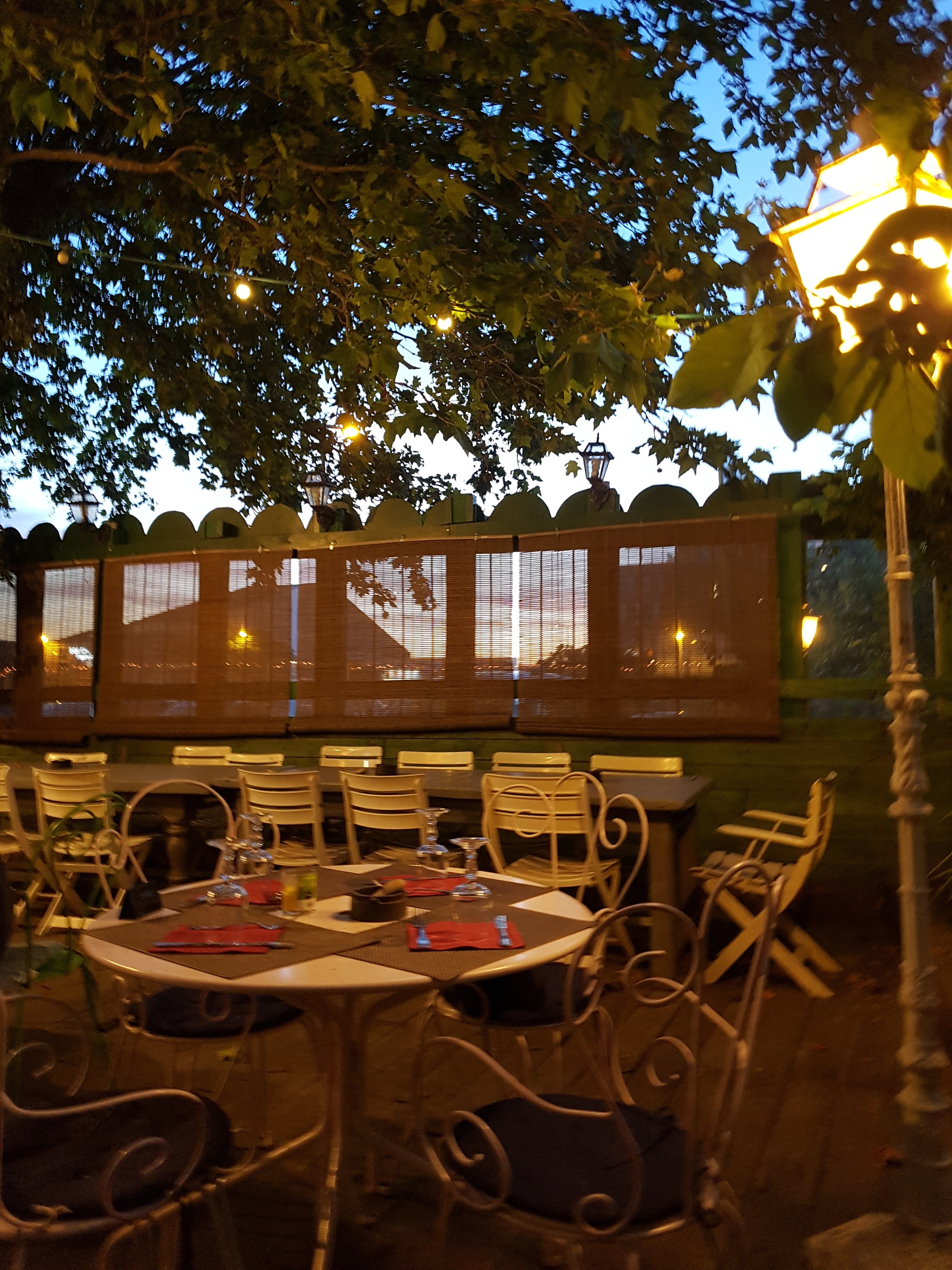 Arrivée sans avoir réservé ce samedi soir,nous avons été très bien accueillis, une soupe offerte en entrée nous a fait patienter, les brochettes de magret étaient délicieuses,le vin bon, le dessert léger, baba et café. Superbe découverte sur une terrasse couverte.merci pour cet accueil chaleureux.