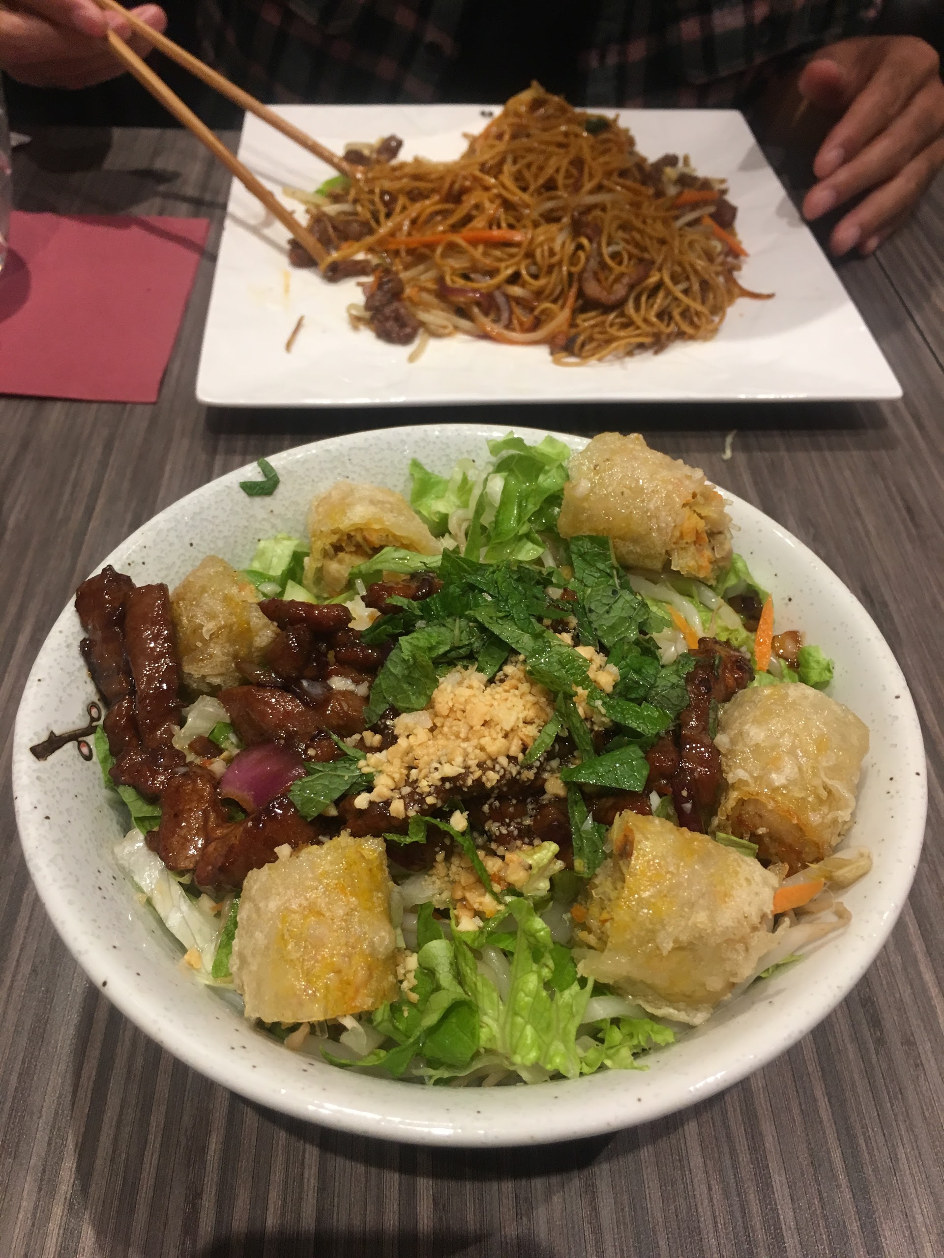 Nous avons pris commande à 20h10 et avons été servis à 20h18. J'ai pris 4 nems au porc en entrée, ils étaient bien chaud et croustillant (cf photo1). Puis les plats sont arrivé le poulet au oignon (photo 2) était très bon, la sauce était épaisse et un peu sucrée, le tout était très copieux. Photo 3 : Bo Bun La dame est très sympa et le cadre est plutot agréable car tranquille. Je recommande. (Pour deux personnes, donc 2 entrée, 2 plats et 3 boisson le total était d'environ 40 euros)