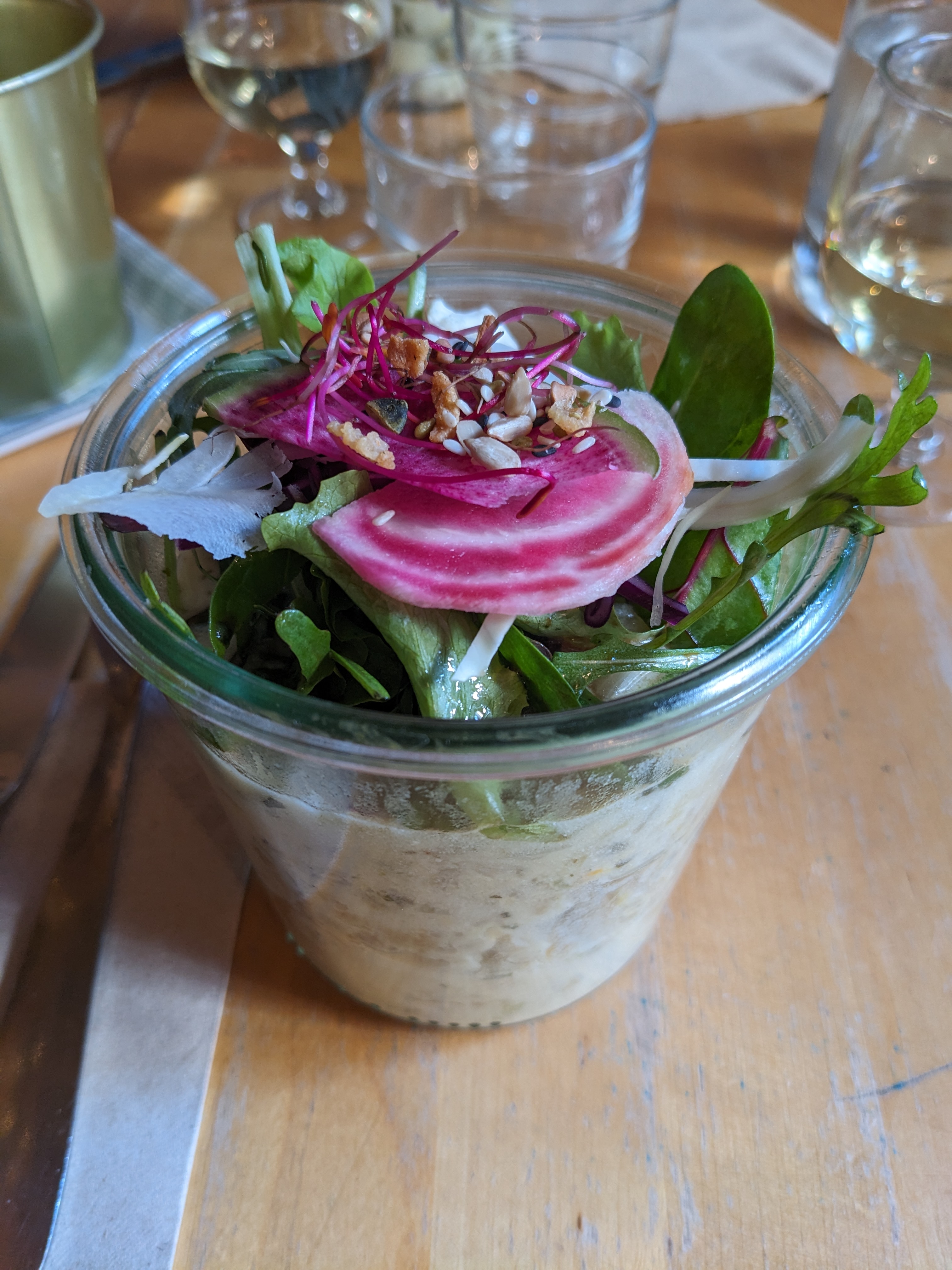 Le service dans des pots de type confiture n'est pas du tout pratique. On ne sent pas trop l'alcool de pomme dans l'apéritif comme à la maison ! Par rapport au prix la quantité n'est pas à la hauteur. Ce n'est pas mauvais mais c'est sans plus. Restaurant décevant.