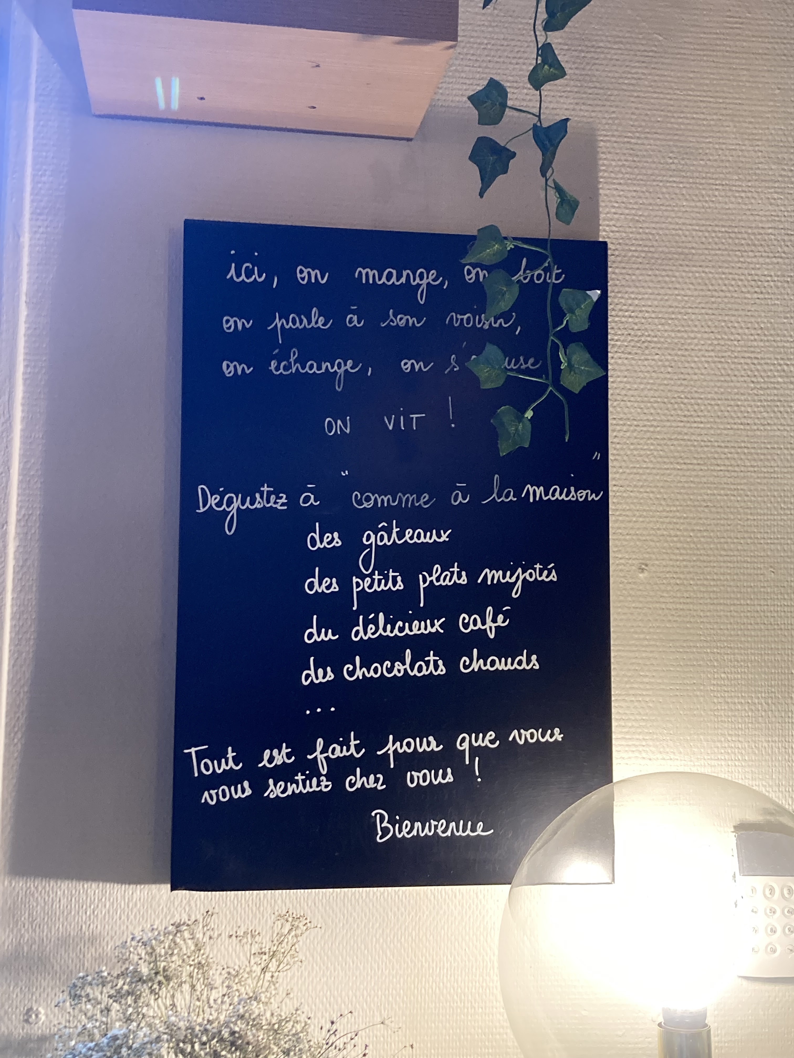 Comme à la maison, sauf qu’il faut passer commande au comptoir (et la serveuse n’a pas eu la présence d’esprit de nous l’indiquer. Il fallait lire la micro-ardoise). Comme à la maison, sauf que les couverts sont jetables (tant pis pour la planète). Comme à la maison, sauf qu’il ne reste plus la moitié des plats à deux heures de la fermeture (pour un restaurant ouvert uniquement en journée). Comme à la maison, sauf que vous oubliez que nous sommes vos clients (et qu’il y a plus de personnel que de place assises). Comme à la maison, sauf qu’on ne reviendra pas …