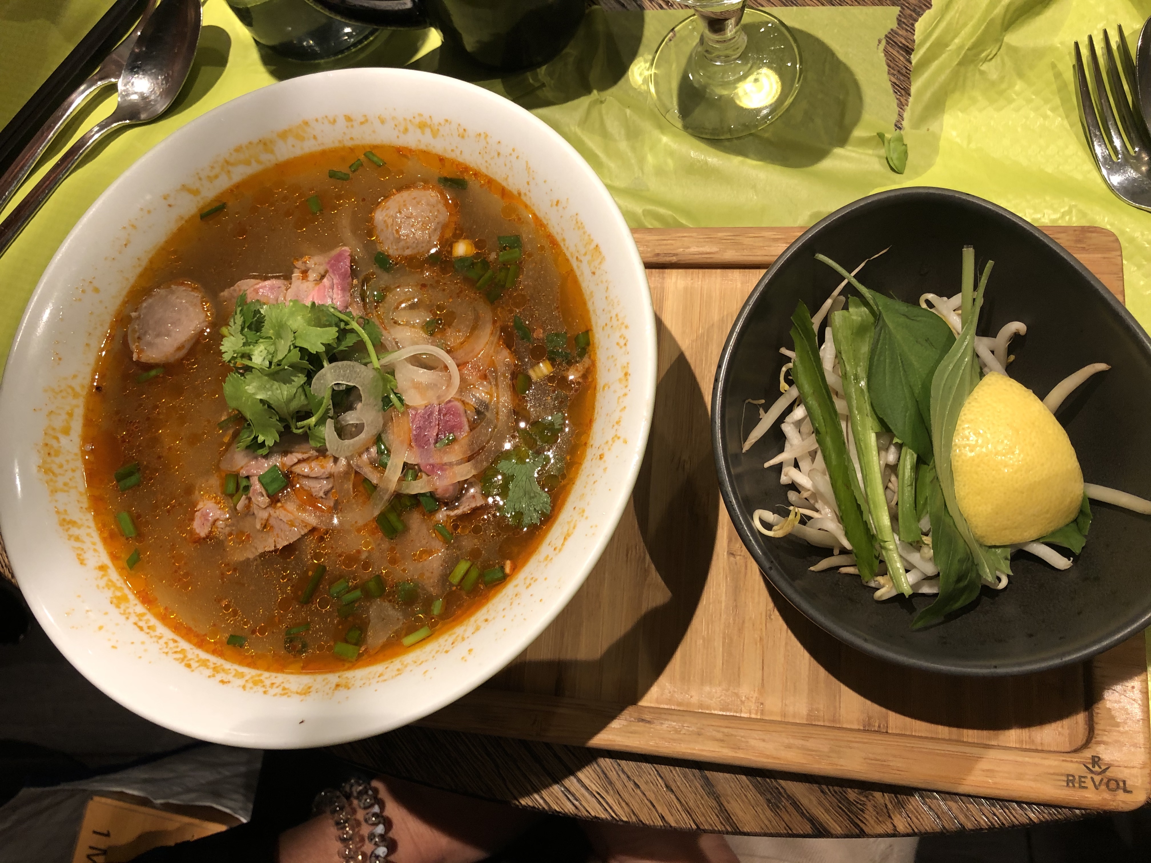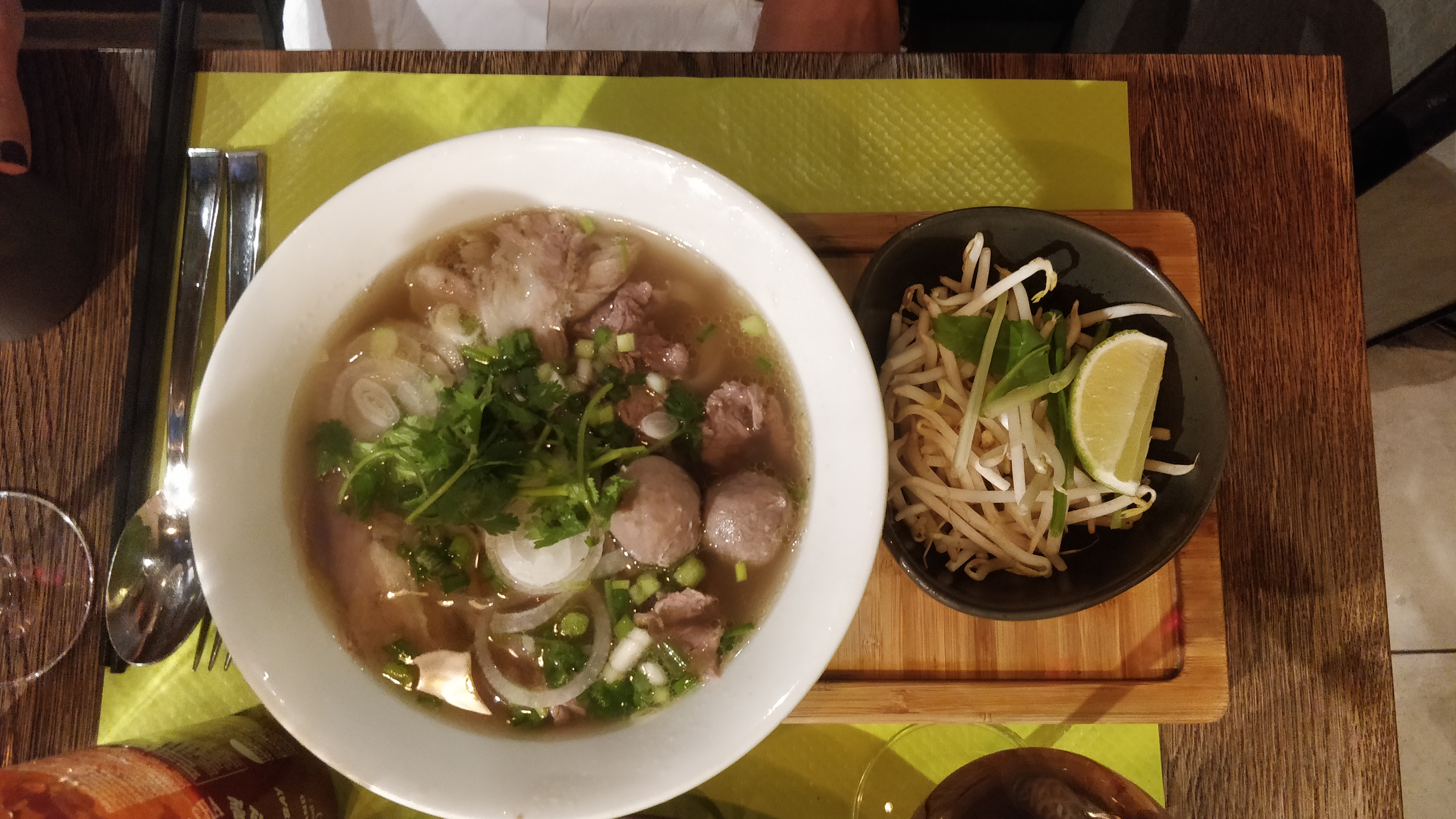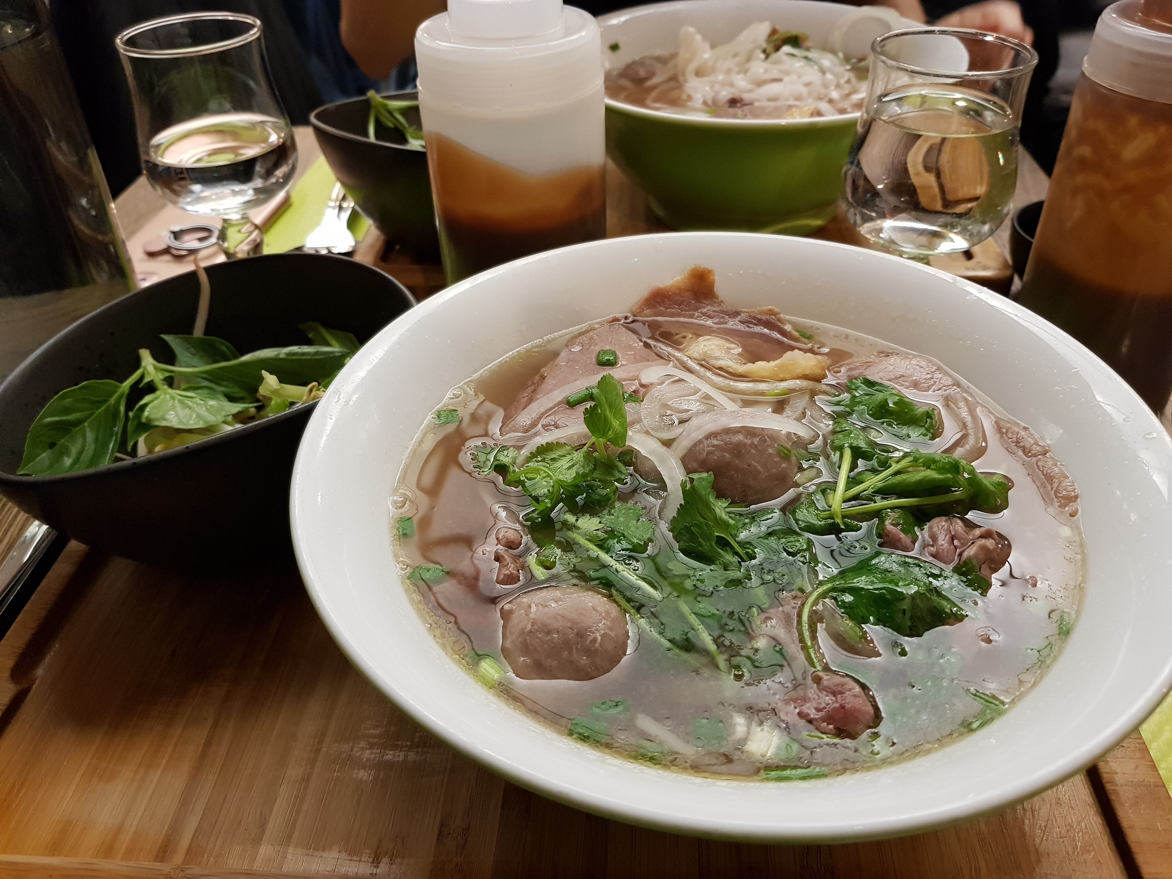 Restaurant qui manque d'organisation, ce qui est dommage. En effet, lors de notre arrivée, nous avons dû patienter en plein milieu de l'arrière salle car l'equipe ne savait pas où nous placer, ce qui relève le manque d'organisation. De plus, à peine installé, on nous demande si on a décidé ce qu'on voulait commander. Évidemment que non. Concernant la cuisine, elle semble rapide et organisée. Le pho est bon et équilibré (la viande est bien proportionnelle), nous n'avons rien a redire et mention spéciale pour la soupe qui ne contient pas de glutamate (exhausteur de goût). Cependant à la fin du repas on nous débarrasse, et on nous laisse poireauter sans aucun serveur qui nous demande si nous voulons un dessert ou l'addition. Bref, la déco est sympa et moderne, le seul bémols c'est le service qui est à revoir.