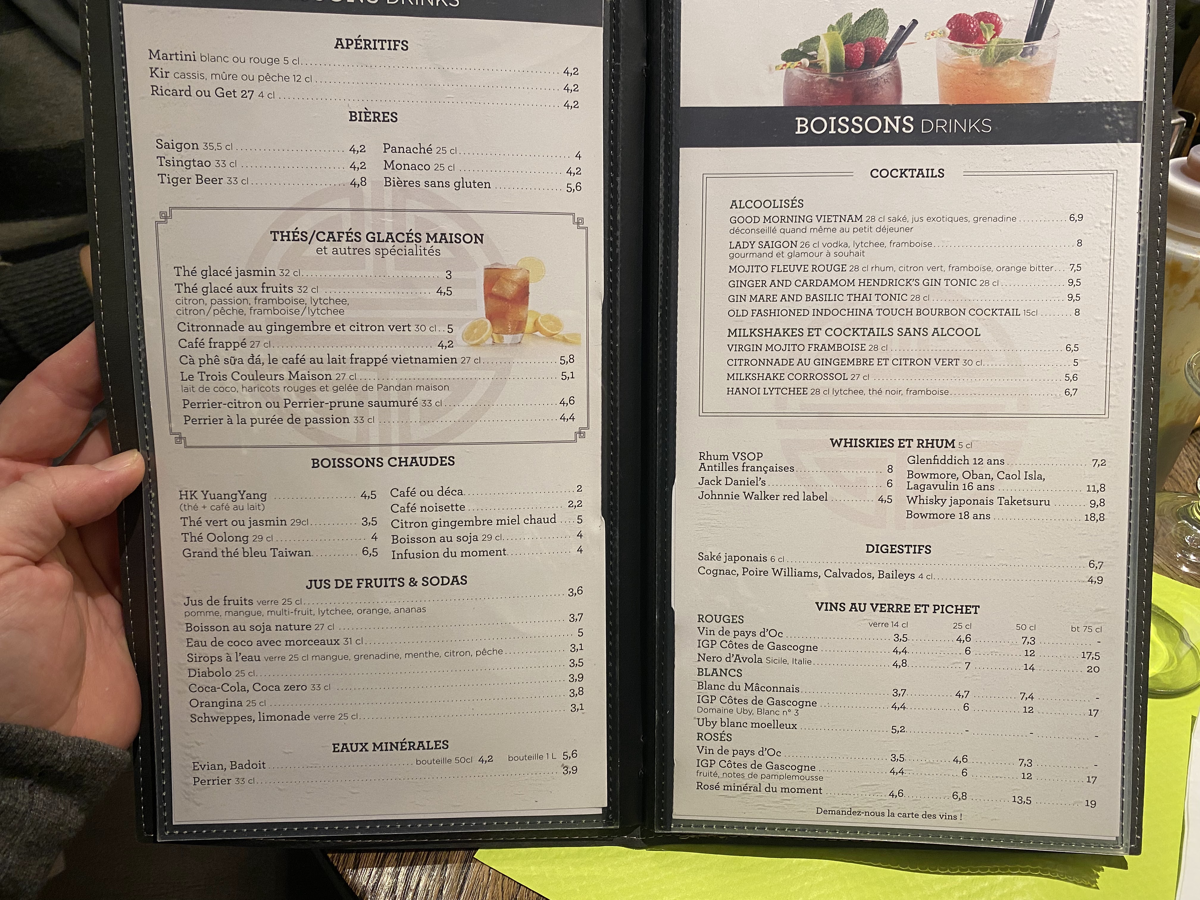 Édit du 29/12/22 L assiette comme au Vietnam est moyennement bonne et c est plutôt dans les prix hauts de la carte .. 18,50€ Le crabe farci se trouve facilement dans les rayons surgelés des épiceries asiatiques pour pas très cher __ Édit du 01/10/22 Le bouillon du banh canh est bon Par contre la boisson 3 couleurs est moyenne avec ses haricots noirs, il manque le rouge et le jaune. ___ Édit du 10/09/22 Le pho est toujours bon mais c'est toujours le même serveur qui insiste lourdement dès le début sur les cocktails. D'autre part on se sent toujours pressés de partir avec les couverts débarrassés rapidement, ce que je peux comprendre car il faut faire du chiffre et il y a la queue dehors mais je le déconseille pour une soirée en couple où on voudrait prendre son temps. __ Édit du 19/08/22 C'est toujours bon, le personnel est souriant et accueillant mais j'ai toujours du mal avec le monsieur aux cheveux grisonnants qui est toujours un peu lourd, ce qui est dommage. Lors d'un repas précédent, il m'a enlevé le plat sans me demander si j'avais fini. Ma soupe était encore pleine, j'étais juste en train de tapoter sur mon phone, ce qui est plutôt énervant. __ J'étais un peu à l'étroit avec les serveurs qui passaient souvent derrière mon dos mais c'était bon et bien présenté donc le contrat a été rempli selon moi