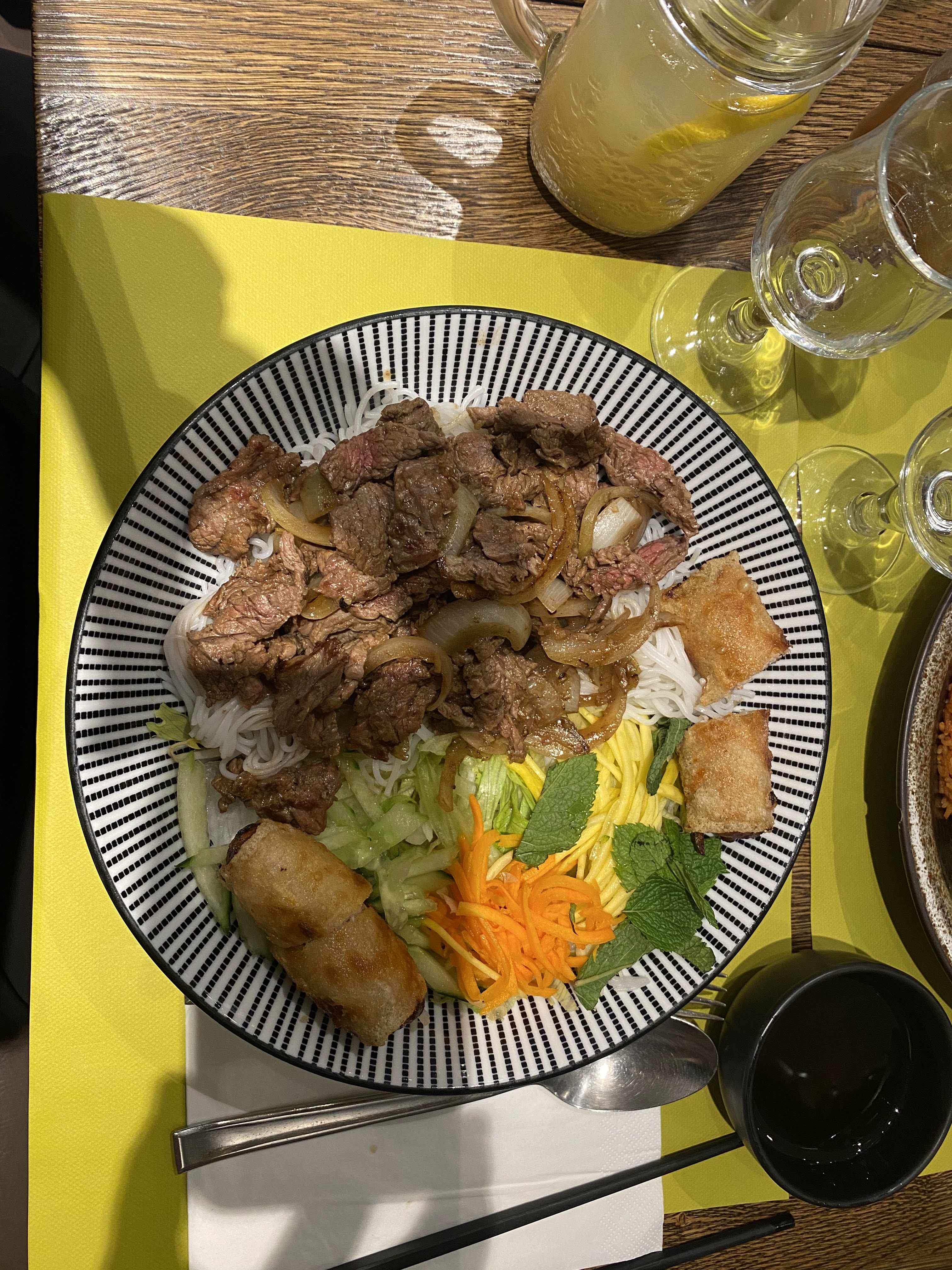 Cadre vraiment sympa qui change de mes cantoches habituelles que j'affectionne plus que tout. Je n'avais pas accroché à leur recette de Soupe Pho Bo lors de mon dernier passage, mais là, en explorant le reste de la carte, avis enthousiaste et unanime de toute la tablée. On s'ouvre l'appétit avec un assortiment d'entrées apéritives choisies par Bibi : Nems poulet et nems veggie pas gras du tout, Rouleaux de Printemps Boeuf, et aussi Crevette avec un bon équilibre des ingrédients, Crevettes en beignet. J'ai orienté les indécis sur le Boeuf Loc Lac, la valeur sûre qui plaît toujours. Pour ma part, j'ai testé le Bun spécial Comme au Vietnam, au porc grillé, porc laminé (Bí) et Crabe farci, hyper copieux... super bonne pioche ! Les autres Bun cha gio plus classiques que j'ai vu défiler étaient bien garnis et appétissants. Banh Xeo bien léger, dont Cath a pu venir à bout sans problèmes. La carte des desserts est bien pensée : en plus des desserts typiques, elle aligne des propositions plus adaptées aux goûts Occidentaux. Bravo pour le gros travail sur la Carte des Vins 🍇🍷 !!! De jolis choix judicieux sur les différentes régions France + Monde. On a misé sur plusieurs quilles de Viré-Clessé, parfait dès l'apéro. J'ai moins aimé le Brouilly, et pourtant j'aime tant les Crus du Beaujo !...