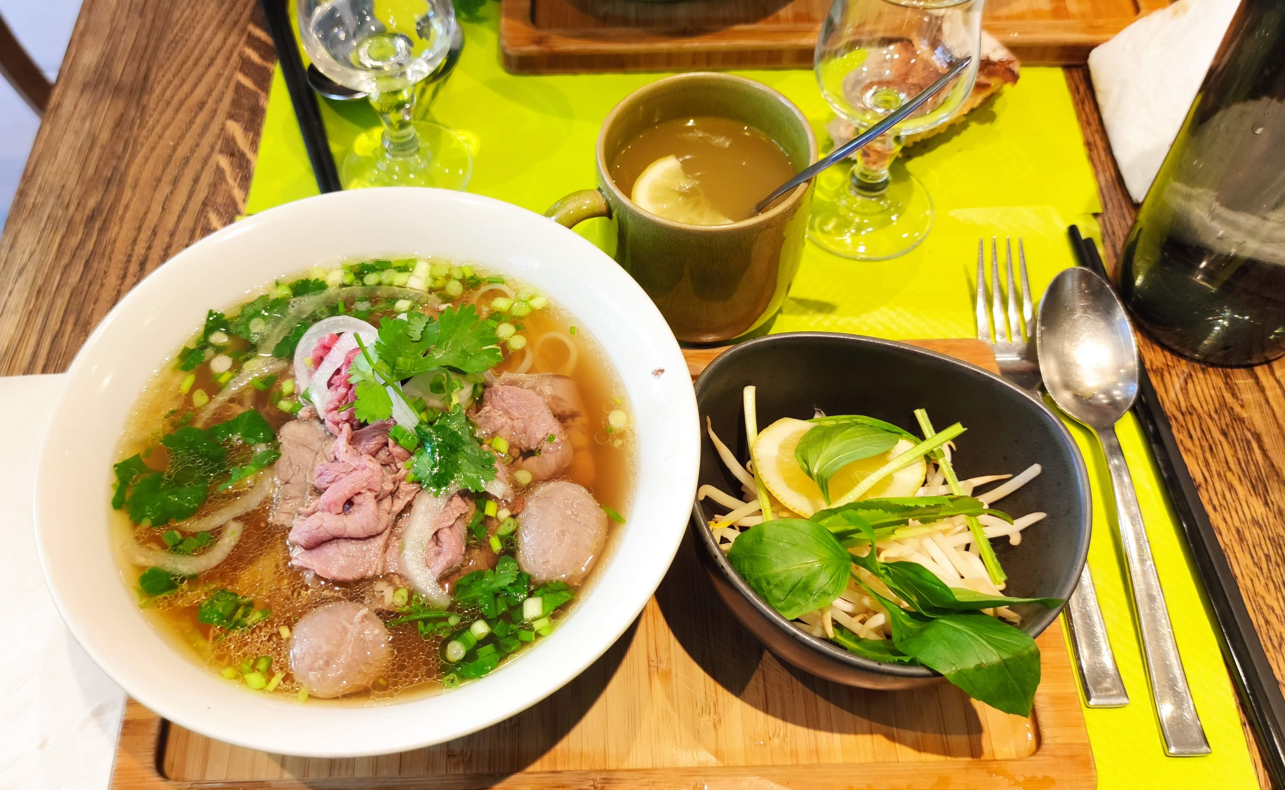 Super bon. Un accueil chaleureux et surtout kid’s friendly. Nous avons profitez de la boisson du moment : thé chaud gingembre et citron 🍋 super bon pour se remettre en selle. Le pho 🍜 est a tomber et le pho semi-epais poulet - crevette- udon est vraiment nourrissant et si bon. Ils sont très organisés et le service est rapide. Ils prévoient les doggy bag pour les enfants avec meme le petit sac plastique pour que cela ne fuit pas ds les sacs. Bref allez - y !