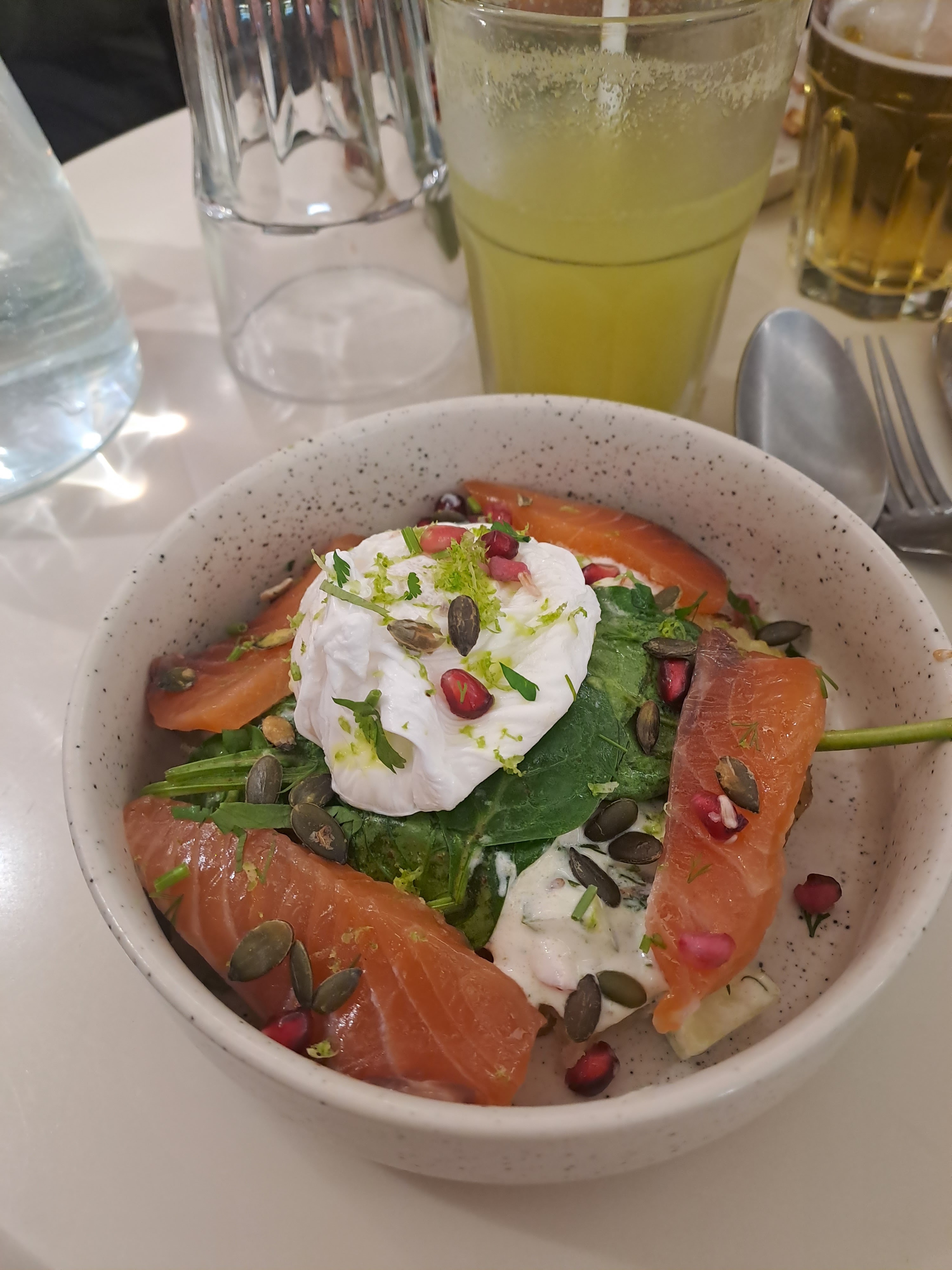 C’est une chouette adresse avec une carte originale (mention spéciale aux carottes rôties) Cependant je trouve que pour optimiser le rendement il y’a trop de tables dans la salle, on s’y sent serrés et cela est bruyant à l’heure de pointe c’est dommage On regrette un petit peu le manque de formule car il est vrai qu’en faisant le cumul de ce qui pouvait composer un vrai brunch… la note peut être salée Enfin, j’ai demandé une simple salade verte seule en accompagnement avec supplément bien sûr, et j’ai trouvé dommage que même là, j’y ai trouvé plus de croûtons, graines de grenades, noix de pécan, oignons rouge que … de salade 😅 Il me semble que le client, pour des raisons personnelles, a quand même le droit de choisir des choses très simples ... j’aurai préféré qu’on me dise non …