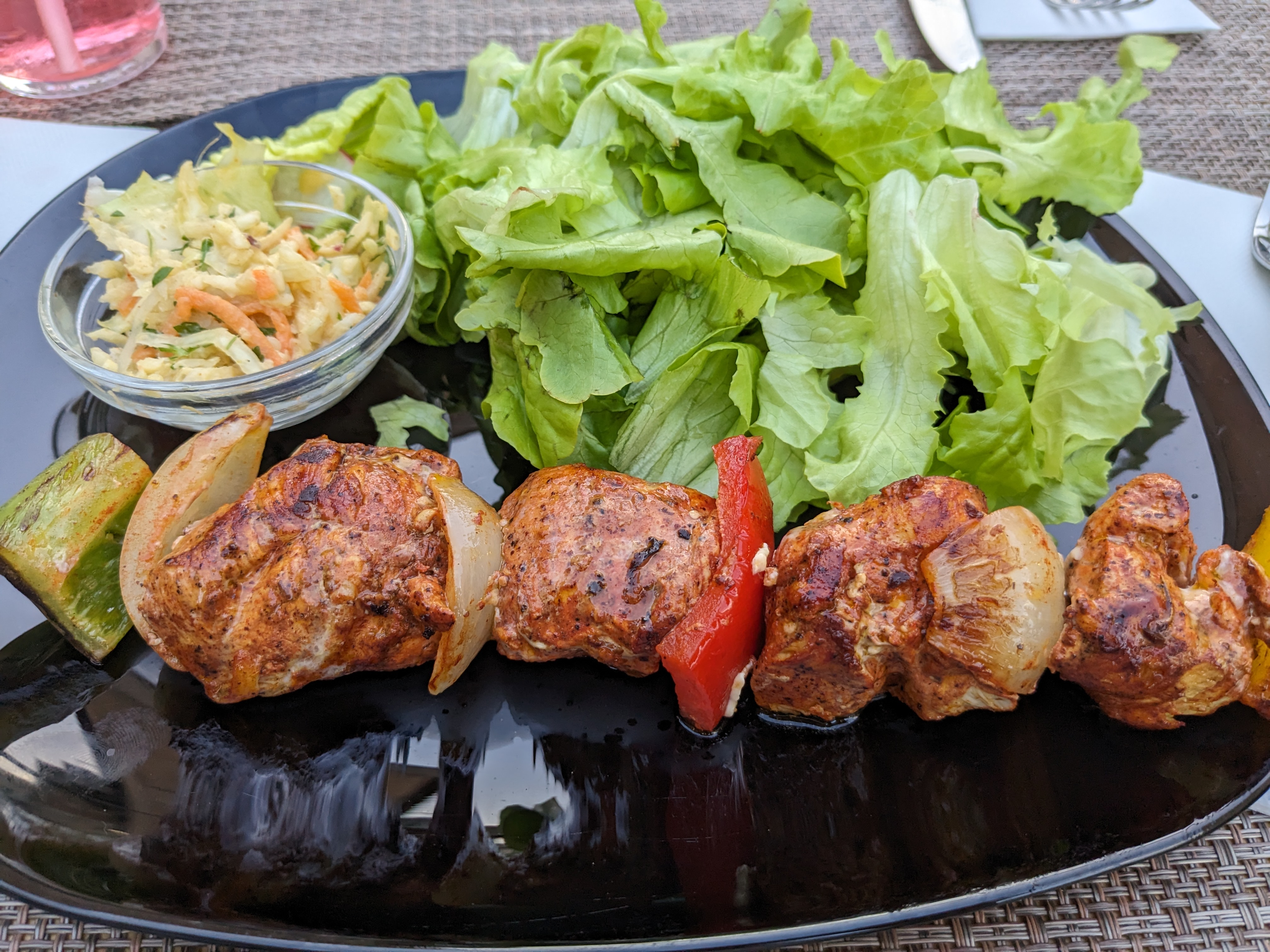 Les tables de ce restaurant sont pour la plupart réparties au bord d’une rue sinueuse à l’écart de la rue touristique principale. Comme il faisait très chaud, nous étions très heureux des endroits ombragés et de la légère brise. Le propriétaire a pris beaucoup de temps pour nous. Notre fils était très enthousiasmé par sa recommandation de boisson avec du sirop fait maison. Notre nourriture était également très savoureuse.