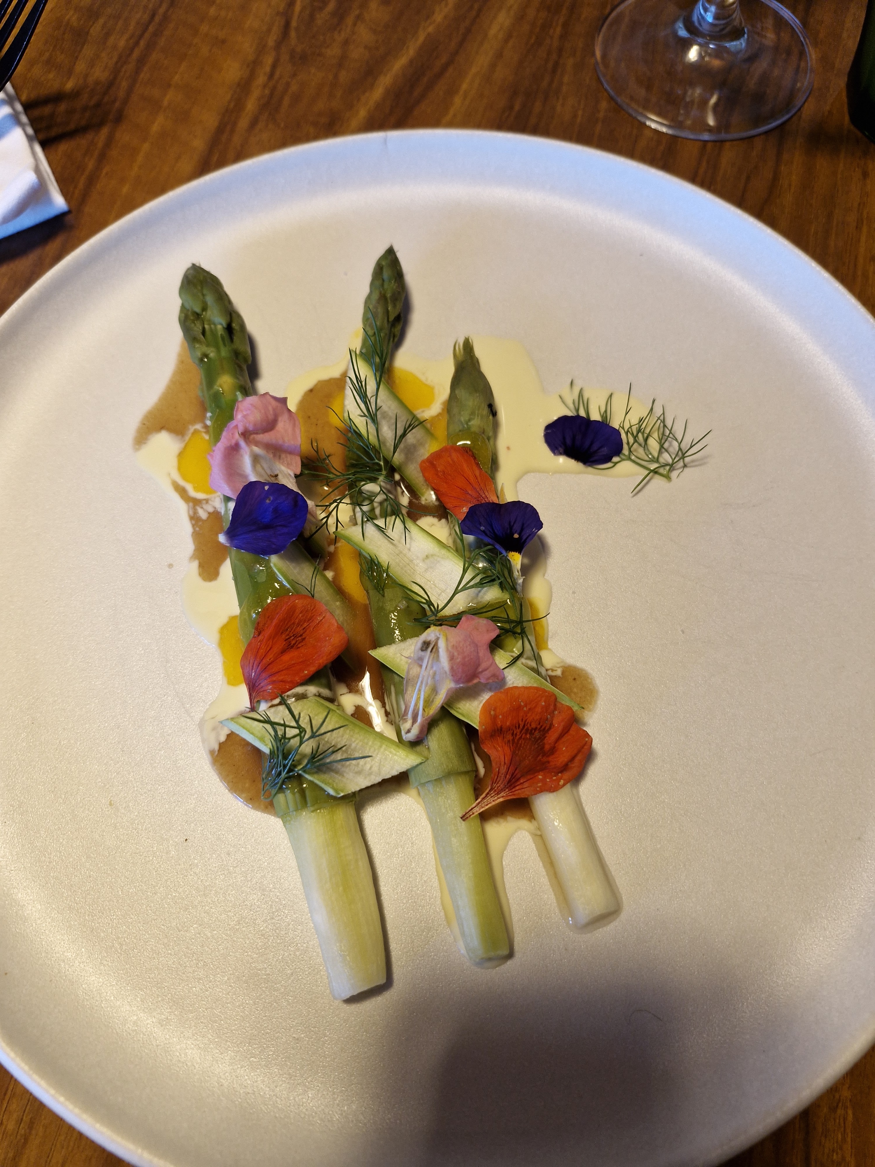 Nous avons testé ce nouveau restaurant un midi en semaine. Joli cadre très sympa. Déco sobre et agréable. Jolie table bien arrangée avec des couverts modernes noirs, serviette en tissu. Nous avons un très bon accueil. La carte est très bien présentée par le personnel que ce soit pour les mets ou les vins. La formule proposée du midi est bien. Je pars sur un plat à la carte et mon compagnon la formule du midi avec entrée et plat. L'entrée est très bien présentée mais laisse à penser un peu légère : 2 asperges qui sont excellentes tant sur la cuisson que sur l'accompagnement. Elles sont un peu perdues dans cette assiette. Peut être est ce le souhait de ce plat. Du pain est proposé. Il est servi un morceau uniquement et aussi que pour mon compagnon. on ne m'en propose pas. On trouve ça un peu limite. Arrivent les plats. Toujours une belle présentation mais peu d'accompagnements autour de la viande ou du poisson. Mon plat coûte aussi cher que le menu du jour (entrée + plat). Je sens franchement que je n'ai pas assez avec uniquement le plat. C'est dommage. Je n'ai pas envie de prendre de dessert. sinon je ne suis plus à un déjeuner en semaine mais plutôt à un tarif de resto en week end. Notre avis est donc mitigé. La cuisine est excellente, les produits aussi. Le personnel impeccable mais les quantités surtout pour les légumes ou accompagnements sont vraiment à revoir. Sortir d'un resto en ayant faim. Bof.