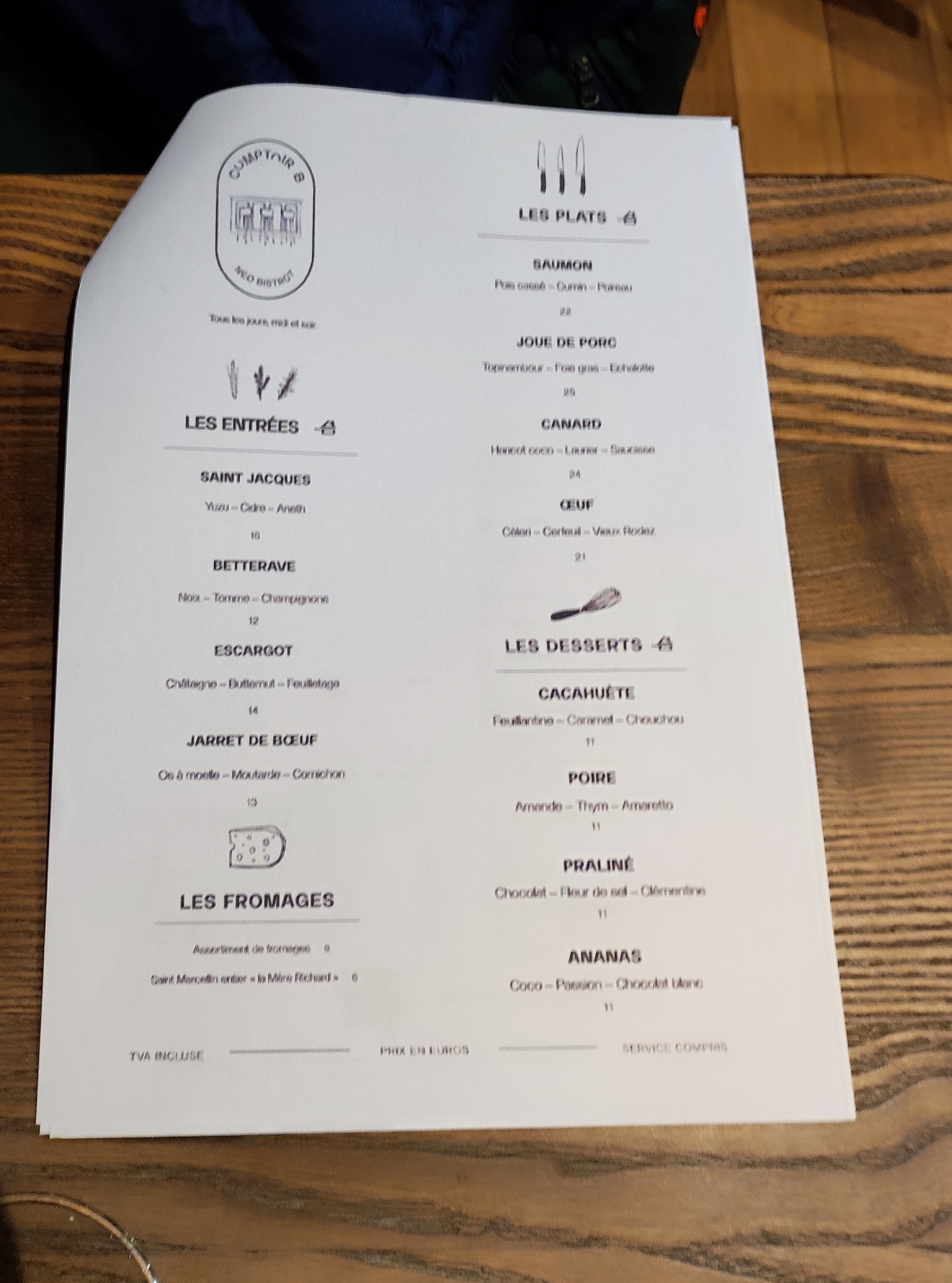 Excellente découverte !! La cuisine est délicieuse, le Chef a bcp d'humour et nous a aussi fait le service en ce mois de Mai....je vous recommande Comptoir B sur tous les points!!!