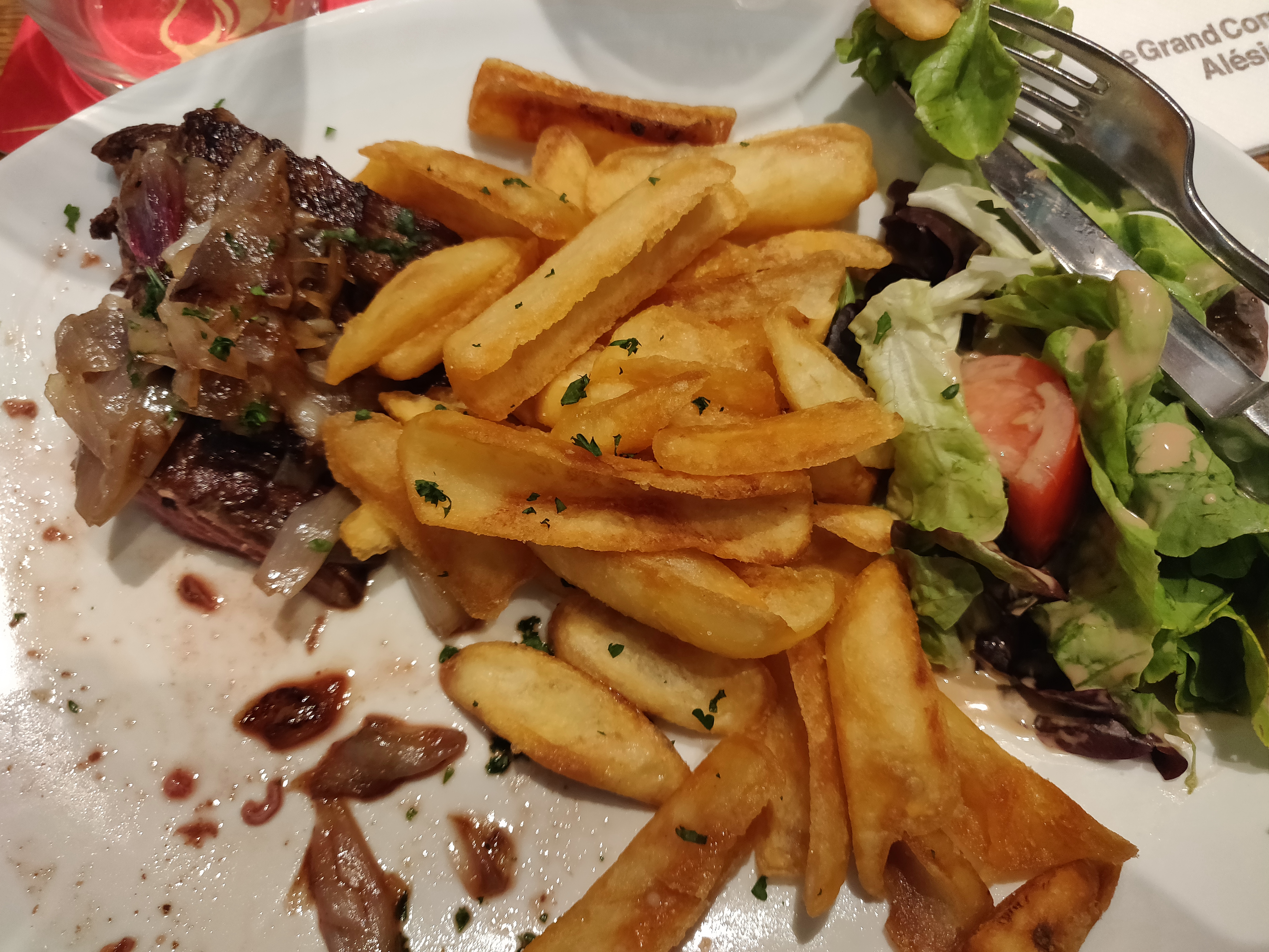 Le premier jour de voyage seul, j'ai traîné mon corps fatigué de l'aéroport à mon logement et au premier repas que j'ai pris après l'enregistrement. J'ai commandé un steak et c'était bon. Et le serveur sympathique. C'était le premier repas d'un voyage satisfaisant. C'était le premier jour de mon voyage. De CDG à l'hôtel... J'ai pris le RER et le métro et c'était très fatigué. Donc, après l'enregistrement à l'hôtel, je visite ici et commande un steak. C'était délicieux et la serveuse était très gentille. Tout était bon. :)