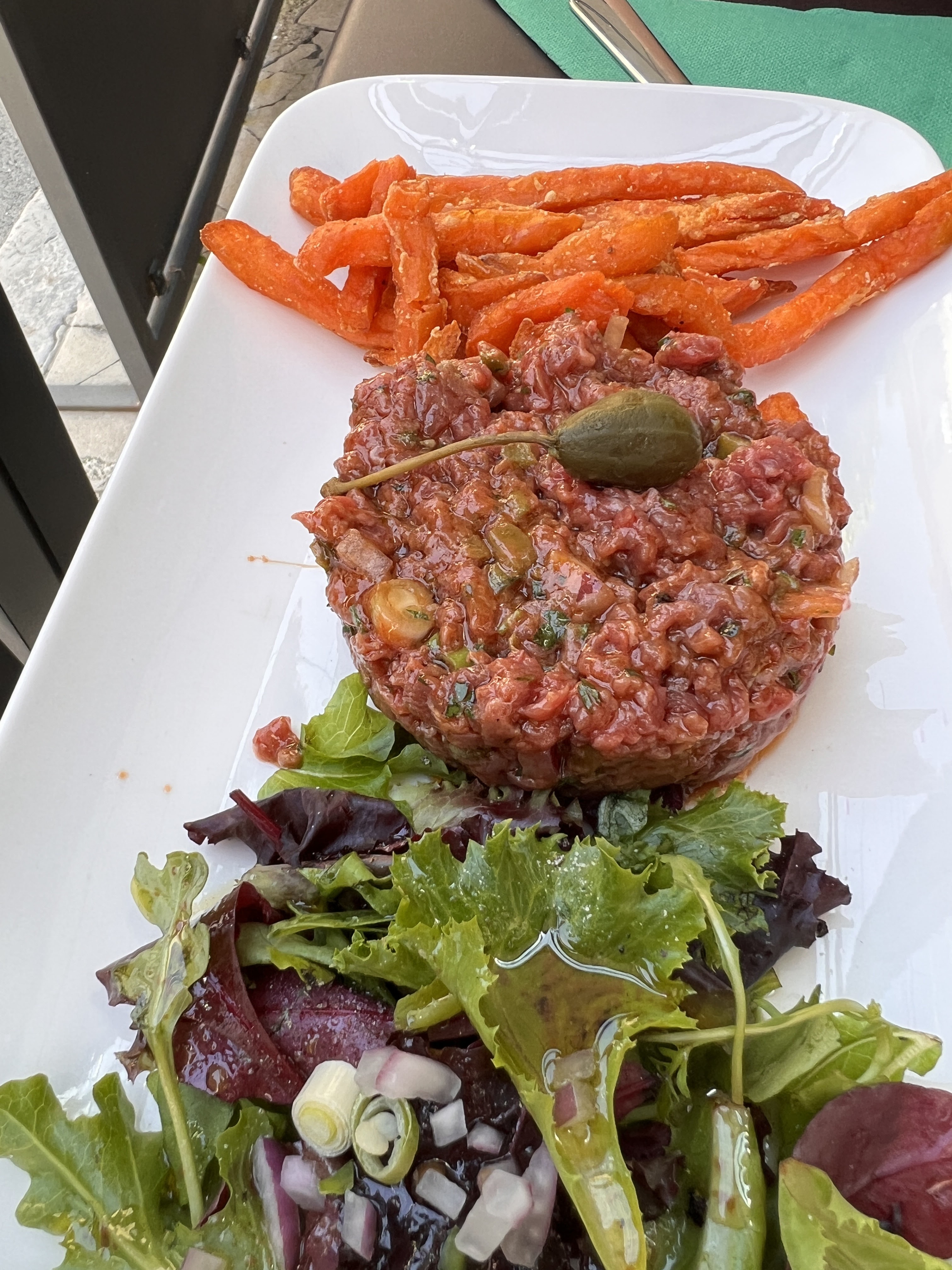 Nous avons déjeuné en famille dans ce restaurant chaleureux avec une cuisine excellente et originale. Je me suis régalée avec la salade de tomates anciennes accompagnées d'une mozzarella burrata, assaisonnée d'une huile d'olive riche et délicieuse. Mon fils s'est régalé de son paleron sauce vigneronne accompagnée de patates douces frites. Et mon conjoint m'a dit que c'était son meilleur tartare de boeuf. Cela change de tomber sur un excellent restaurant dans un lieu touristique. Je vous le conseille.
