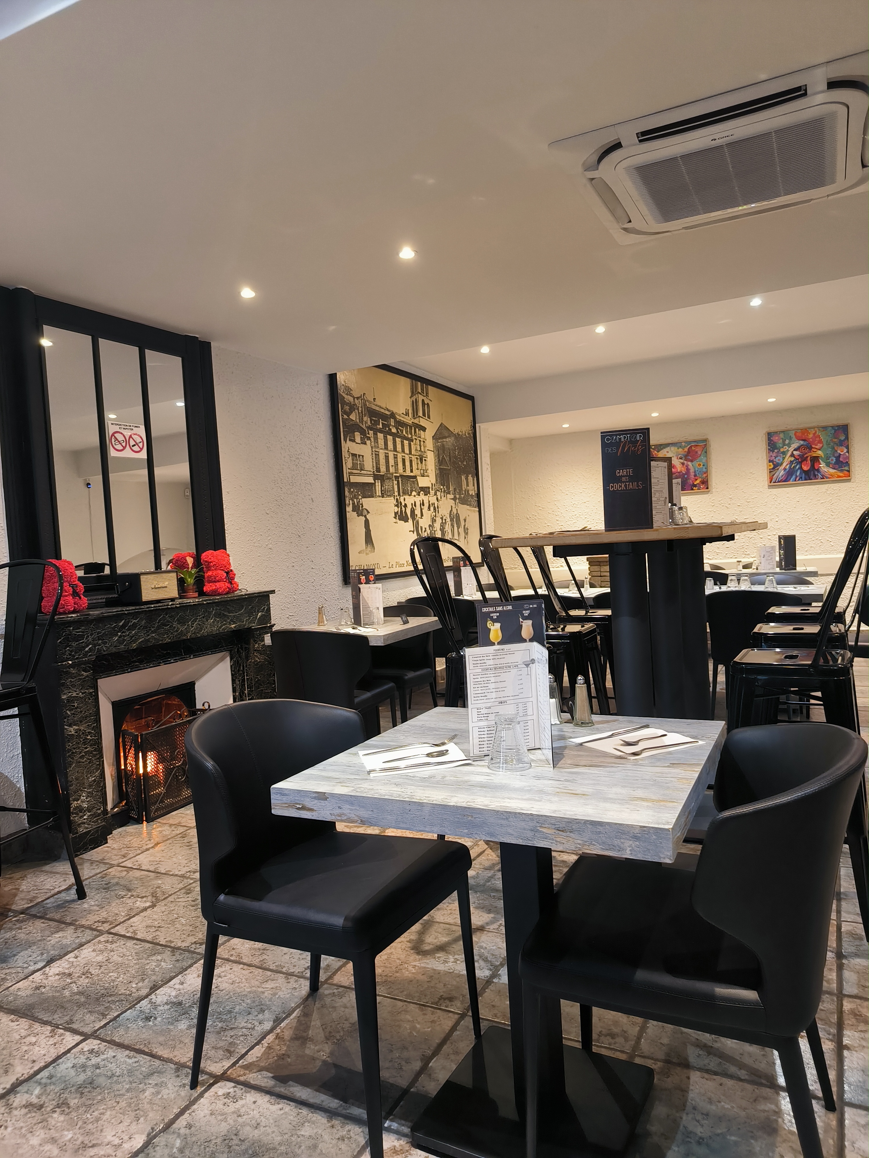 Changement de propriétaire . Nous avons manger en intérieur un soir en semaine , pas grand monde dans le restaurant. La décoration de la salle du fond est froide ( mur blanc , lumière blanche) Au niveau cuisine, rien à redire. C'est bon et les prix sont correcte pour un soir ( 20 euros avec plat et dessert). L'hamburger est généreux, l'assiette du comptoir est sympa . Attention quand même au supplément. La lecture de la carte n'est pas simple au 1er abord. Au niveau du service, c'était correcte. ( peu mieux faire) .