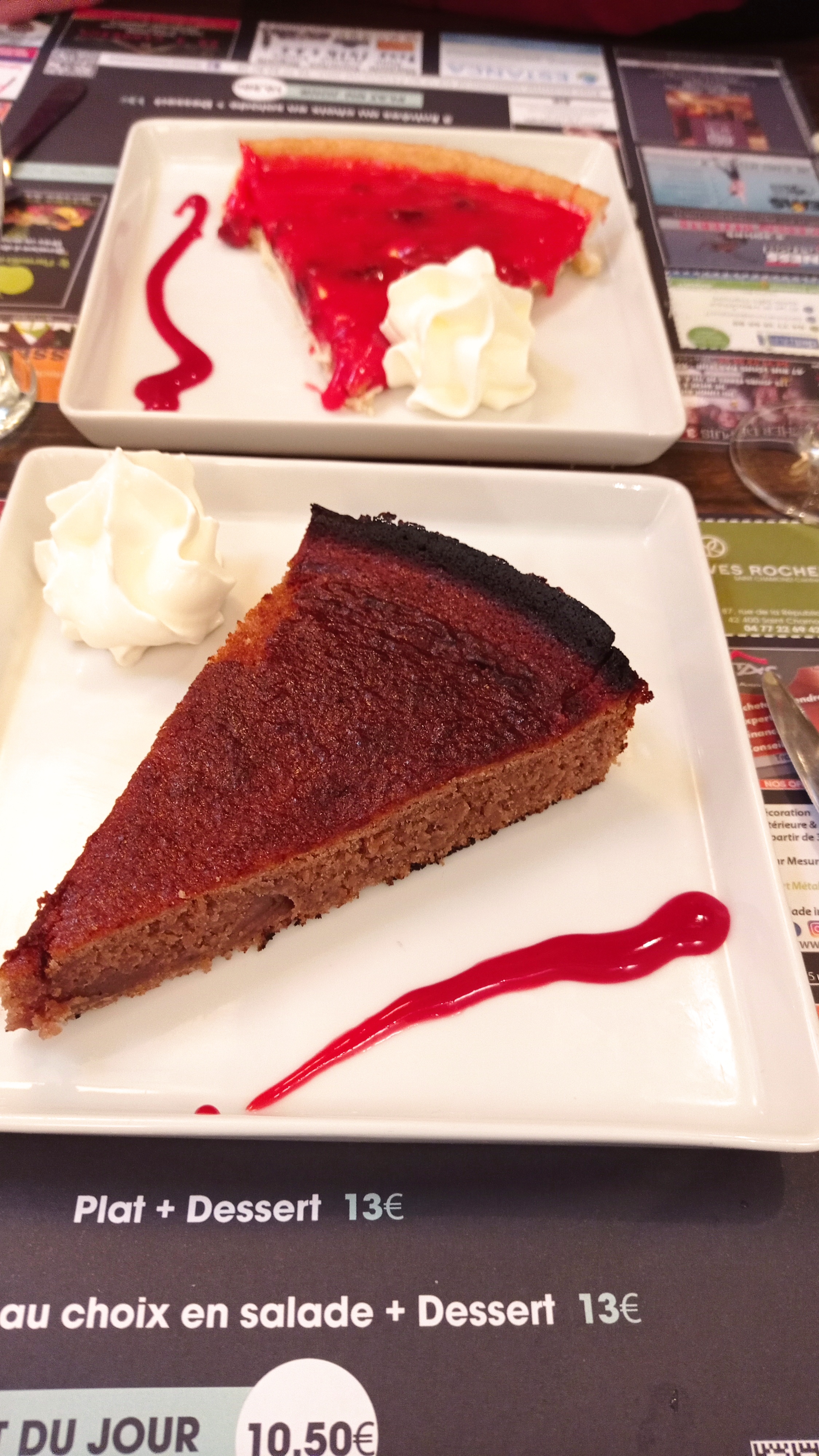 Choix entre 3 entrés 2 plats et une dizaine de desserts en comptant glace fromage sec et fromage blanc. J'ai mangé un cake ricotta tomates confites et coppa ce fut bon. Domage quil ny ai que deux feuilles de salade verte un peu plus aurait été appréciable. En plat du poisson avec du riz et une sauce au curry. Et en dessert un crumble. Bon dans l'ensemble rapport qualité prix correcte. Domage que ce soit un peu l'usine et quon nous ai servit l entrée en même temps que l'apéritif...