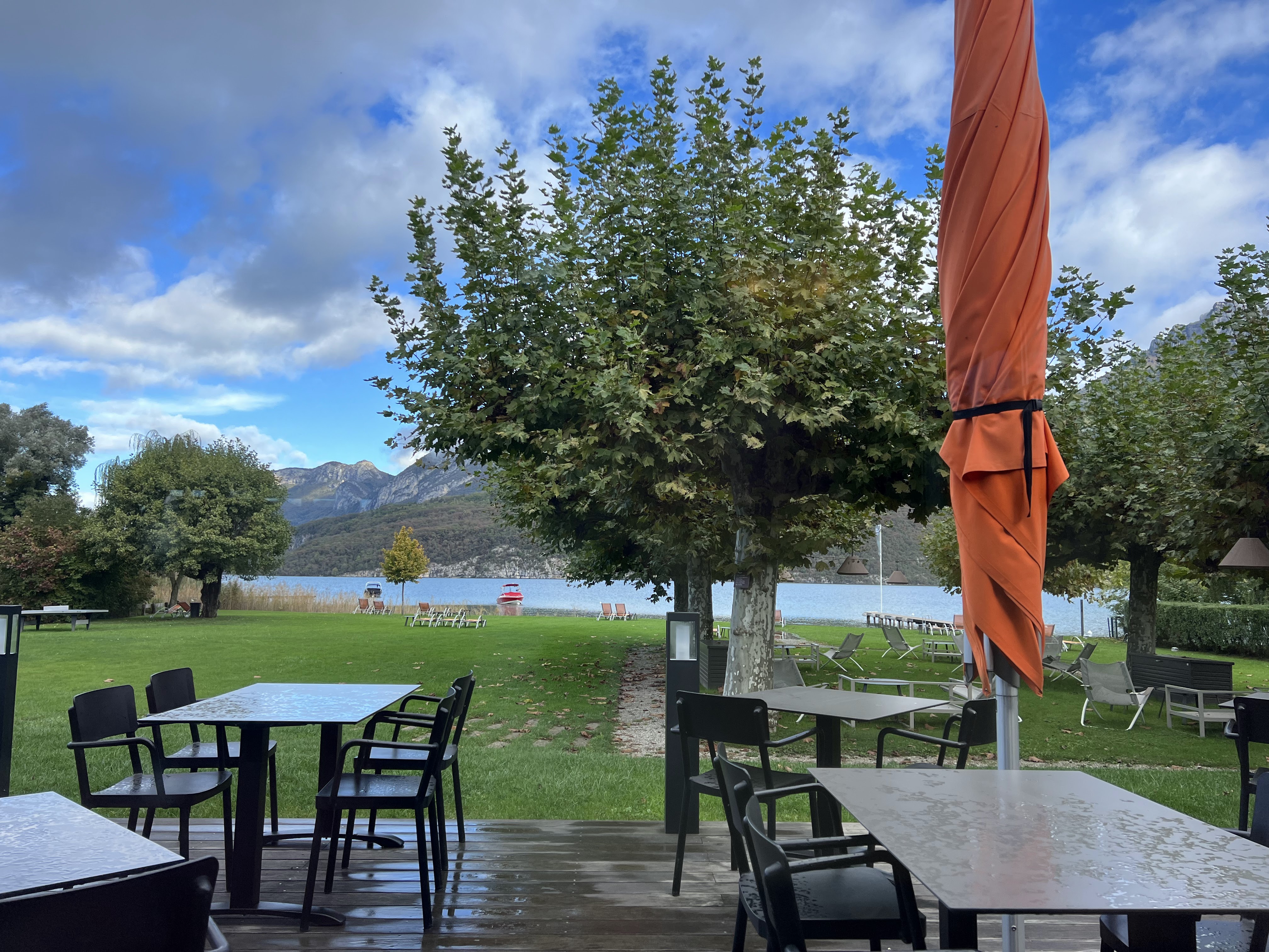 Reposant et respectant bien la distanciation. Pour ceux qui y séjournent, il y a même un jaccuzi extérieur. Bonne table et bons produits. Très agréable avec vue sur le lac.