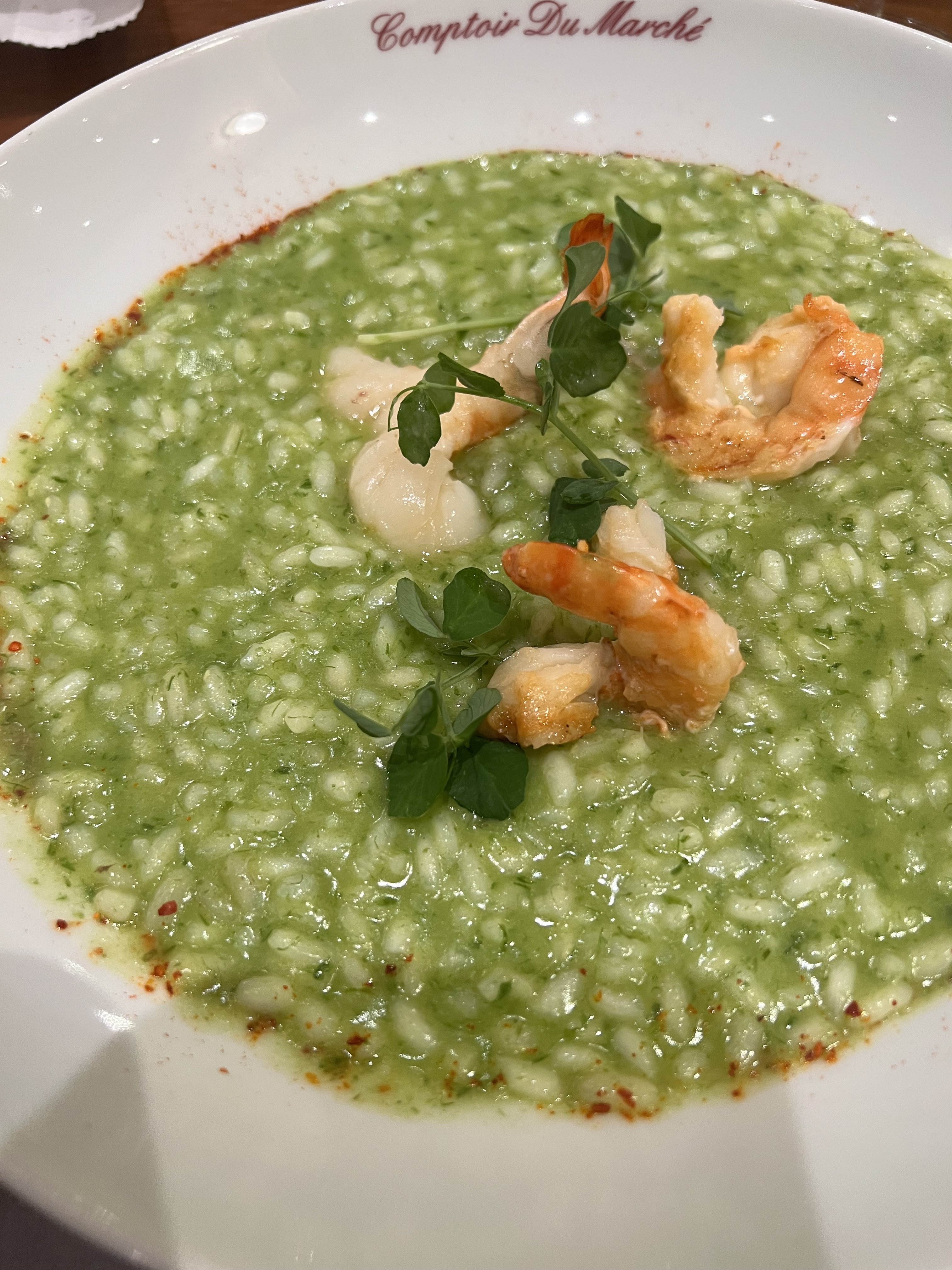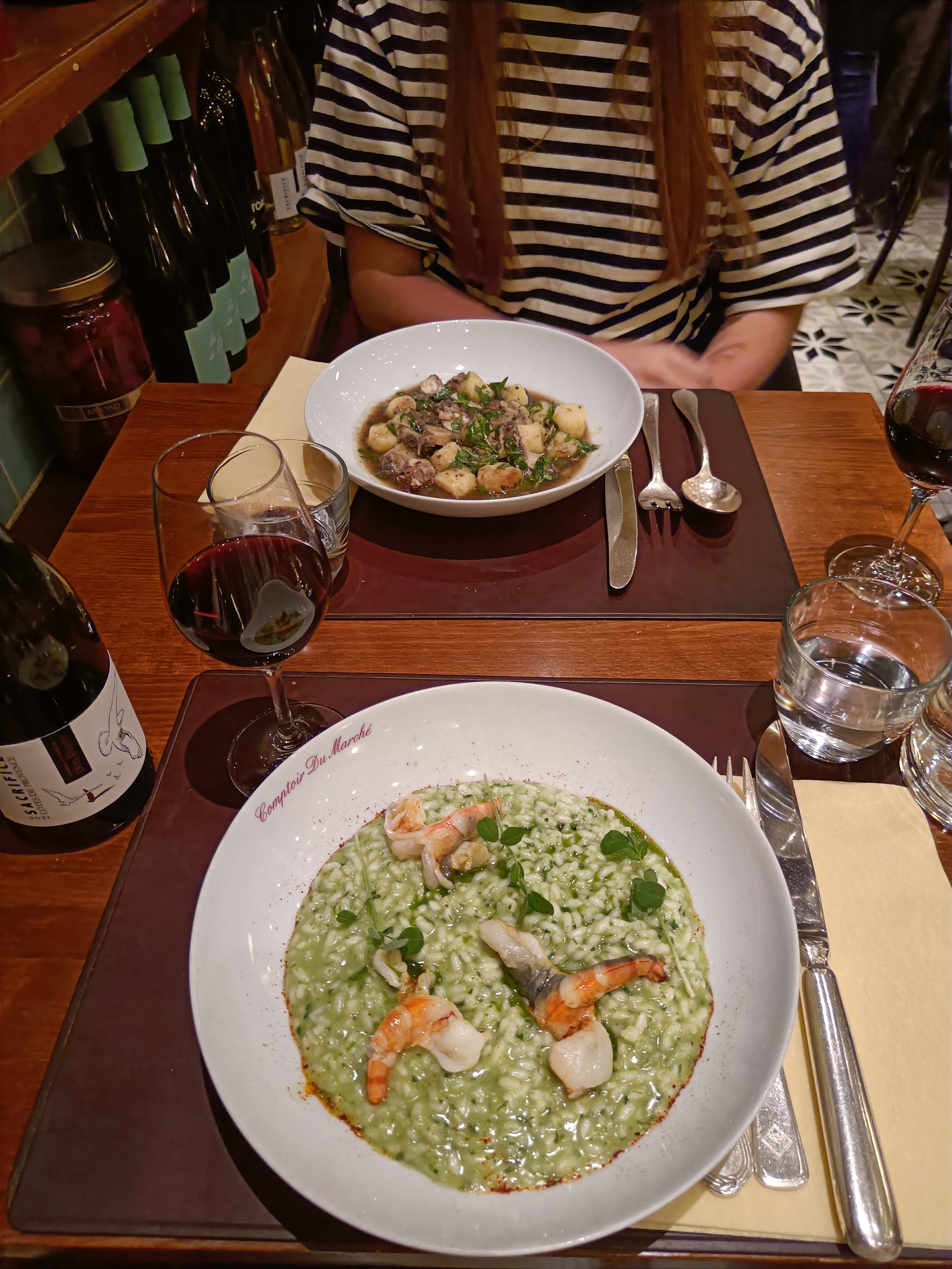 Venir ici a été un moment fort de notre voyage à Nice ! Mon conjoint et moi avons repéré le Comptoir du Marche en nous promenant dans Nice et ne connaissions rien de sa réputation ; nous avons très inconsciemment essayé d'avoir une table sans réservation. La réception aurait pu s'épargner cet effort et nous refouler, mais nous a gentiment laissé attendre à l'intérieur par une soirée froide pour voir s'il y avait des non-présentations inattendues. J'apprécie beaucoup qu'ils se surpassent pour deux touristes aléatoires ! Il existe des menus au tableau en français et en anglais qui, je suppose, changent quotidiennement. Il y a beaucoup de choses à manger pour les pescatariens et les végétariens. Le risotto était le meilleur que j'ai jamais goûté (!), les calamars étaient merveilleux et nous avons adoré la sélection d'apéritifs.