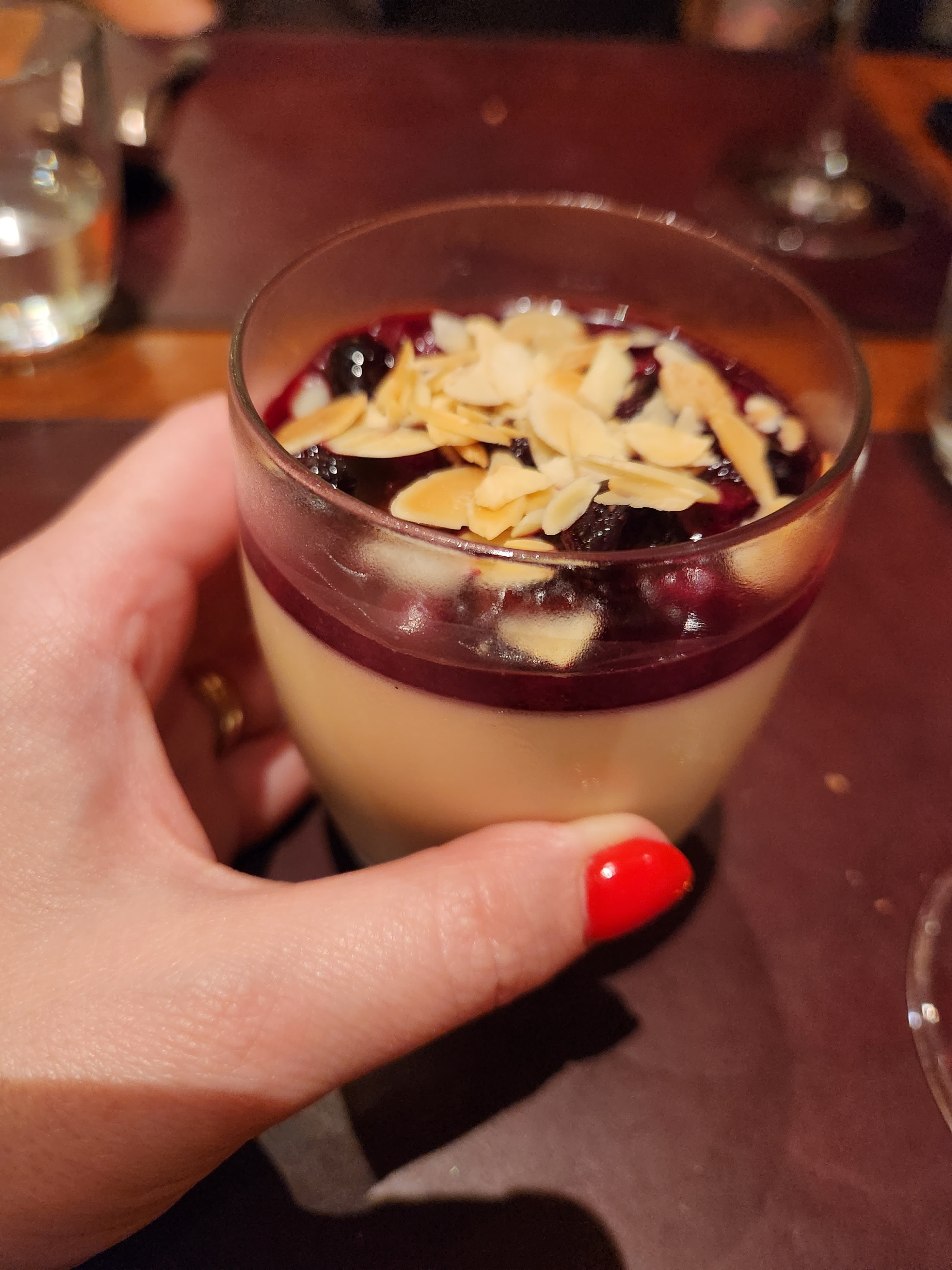 Il y avait beaucoup de monde avec ce qui ressemblait à un bus touristique rempli de Britanniques. Bruyant pour cette raison et écrasé. La moitié de notre groupe a aimé la nourriture. L'autre moitié… On m'a dit que le risotto n'était pas assez cuit et que la pizza était médiocre selon mon fils de 16 ans qui a mélangé la grosse boule de fromage avec tout. Mais mon autre enfant a vraiment aimé le thon poêlé et j'ai adoré le canard aux carottes et aux pommes de terre gratinées et le pot de moules en apéritif, des moules vraiment savoureuses. Nous avons également adoré l'entrée aux calamars et les desserts, la mousse au chocolat comme la création et la mangue à la crème de citrine étaient tous deux excellents.