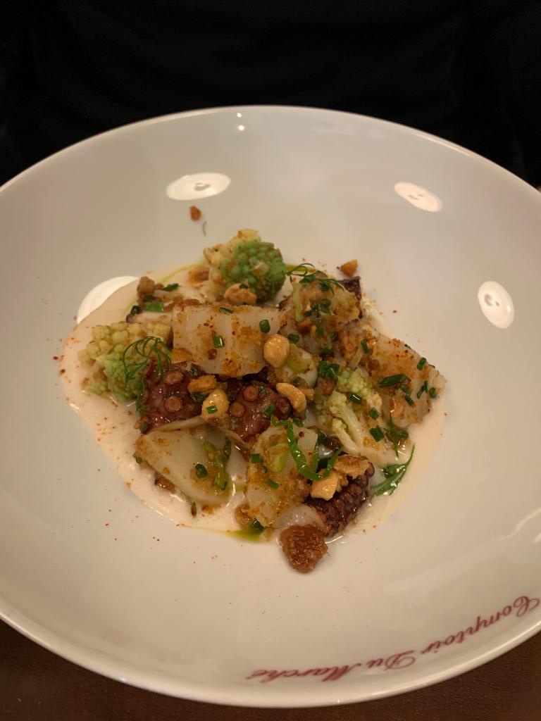 Les calamars grillés aux artichauts étaient sucrés et salés, un incontournable. Le tartare de bœuf aux truffes était incroyable avec la fraîcheur du bœuf, le croquant du concombre et de la salade et rehaussé par les copeaux de truffe. Le dessert aux figues était une finition parfaite, léger et rafraîchissant