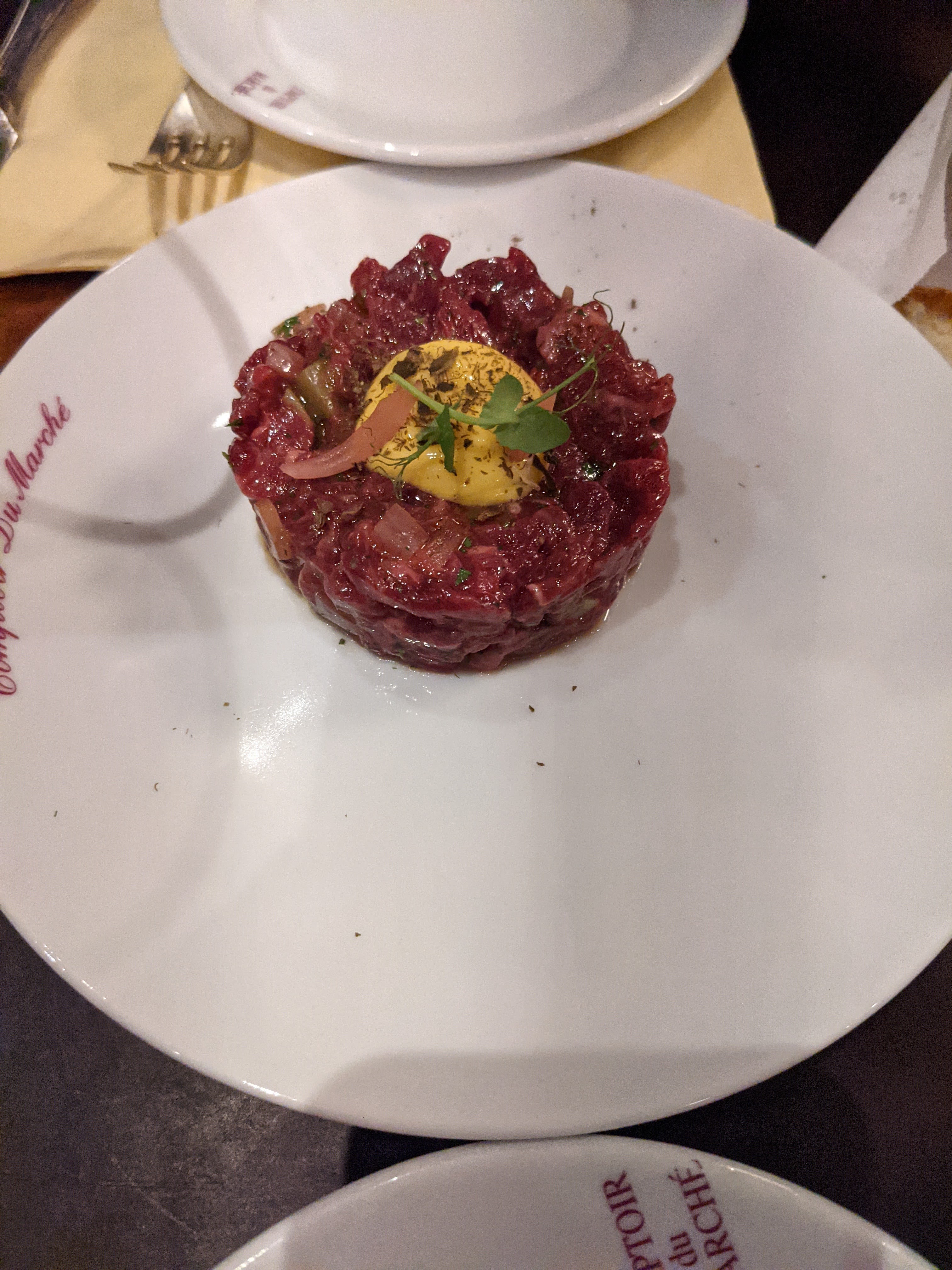 Superbe dîner. Je recommande vivement le tartare de bœuf et le magret de canard (saignant, ce qui était moyennement rare pour moi). La Joue de porc (joues de porc) était également superbe. Un bon Côtes du Rhône pour accompagner tout cela coûte environ 25€. Personnel efficace et agréable. Soit arrivez tôt entre 19h00 et 19h45, soit faites une réservation. Ils sont occupés.