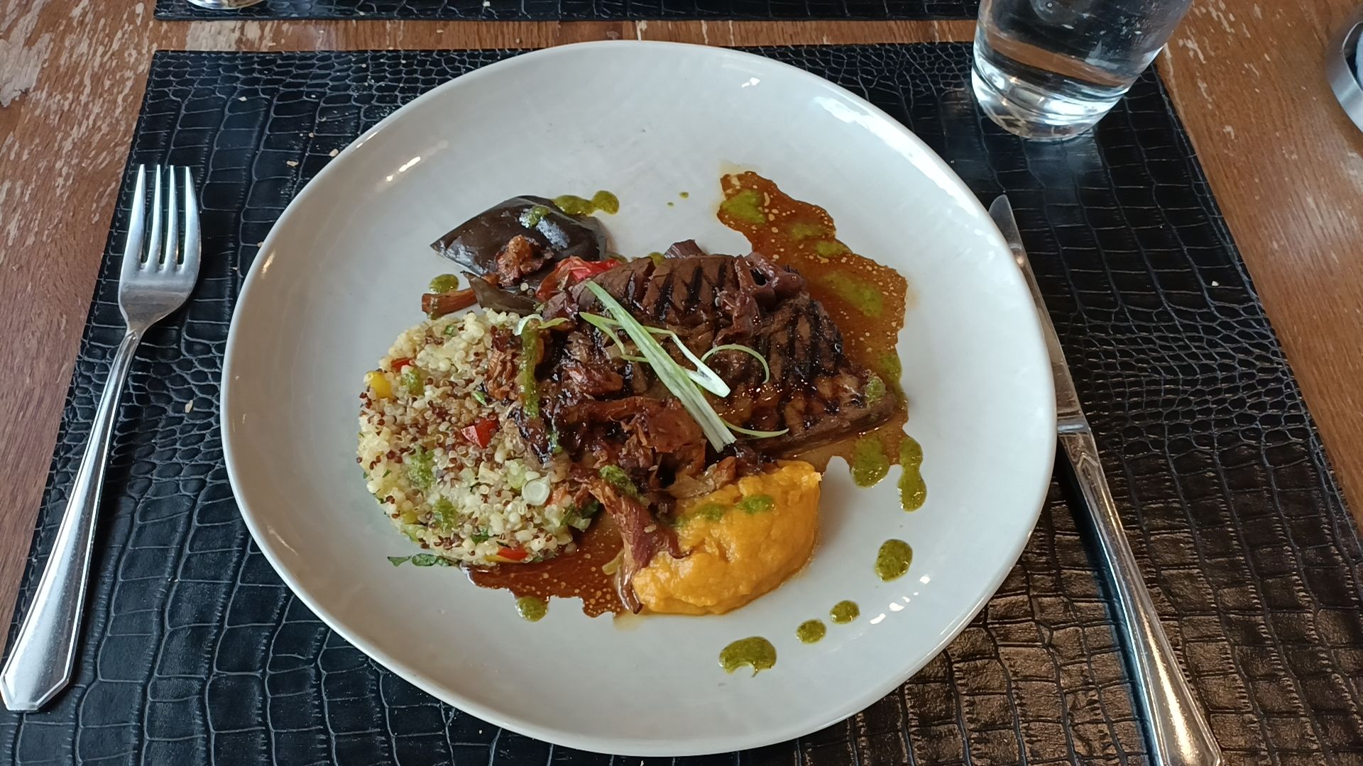 Assiette joliment présentée, mais un peu chère par rapport à la quantité. Le plat était composé d'un morceau de poisson dans les 50 grammes accompagné de très peu de légumes. La formule entrée + plat de midi ne m'a pas rassasié, ce qui est généralement le cas. Quant au goût, c'était bon sans plus.