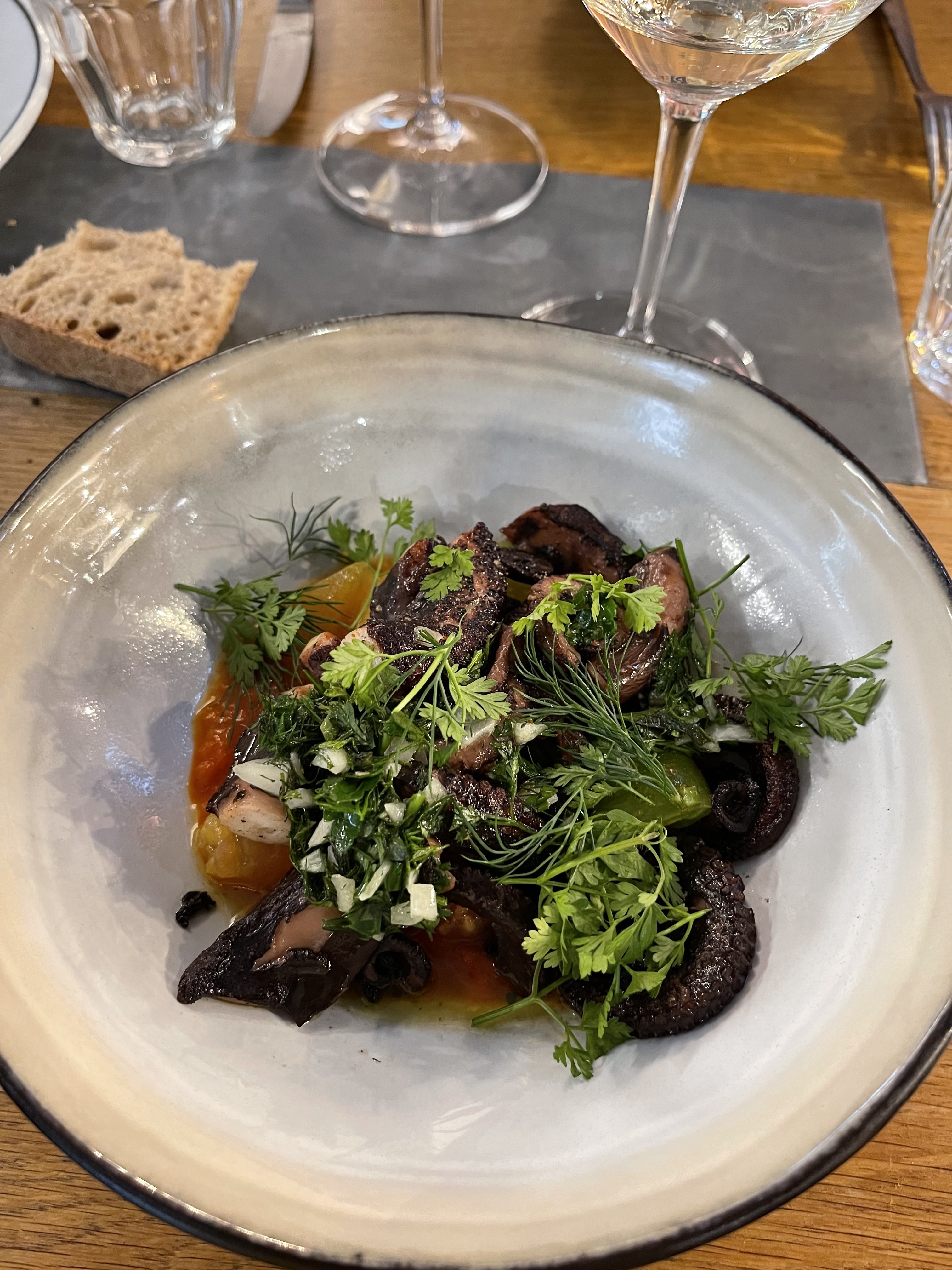 J'ai eu un merveilleux déjeuner un samedi après-midi. J'étais seul alors j'ai mangé au bar et j'ai demandé à mon serveur ses plats locaux préférés. J'ai réussi un coup de circuit avec la moelle pour un premier plat et le foie pour le plat principal. De plus, d'excellents vins au verre en ont fait un déjeuner très mémorable ! Pas bon marché mais de très haute qualité. Merci!