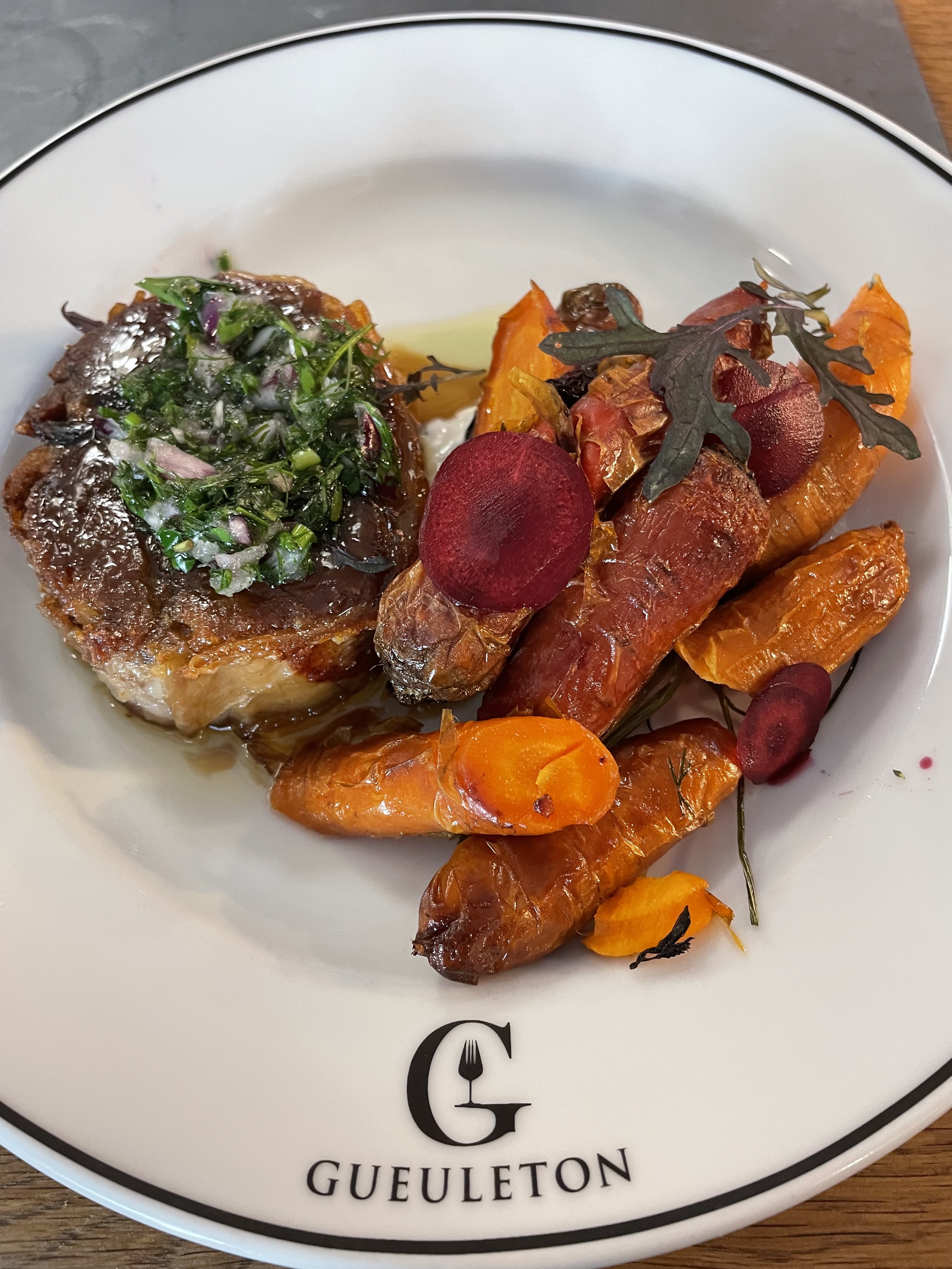 J'ai adoré ça en morceaux. Certains critiques n'ont aucune idée de ce qu'ils commandent et seront inévitablement déçus, principalement à cause de leur propre ignorance. Par exemple, l'onglet de bœuf est un steak semblable à la bavette. Pour moi, s’il est cuit en bleu, c’est tout à fait glorieux. Pour les autres qui veulent juste du tendre sans goût (bonjour le filet), ce serait un cauchemar. C'est savoureux, savoureux... D'autres plats ici reflètent l'enthousiasme de Lyon et de la commune pour l'utilisation des abats. Mais vu qu'il s'agit d'une sorte de chaîne, Gueuleton est fantastique. Le vin au verre comprenait un Morgon fabuleusement doux, moelleux mais puissant et le Chardonnay ressemblait à de l'or liquide, doux et fumé en bouche. Mon onglet était parfait et le merlu (merlu) de ma femme divin. Les accompagnements étaient à partager, une fabuleuse purée au beurre glacée avec je suppose une légère pincée de St Marcellin et un duo de carottes Héritage rôties et une purée de carottes à la consistance nuageuse. Deux cafés noisettes et le tout à 75 euros. L'équipe qui nous a servi était fabuleuse, polie, amusante et l'ambiance du restaurant était également fantastique. Recommandation absolue