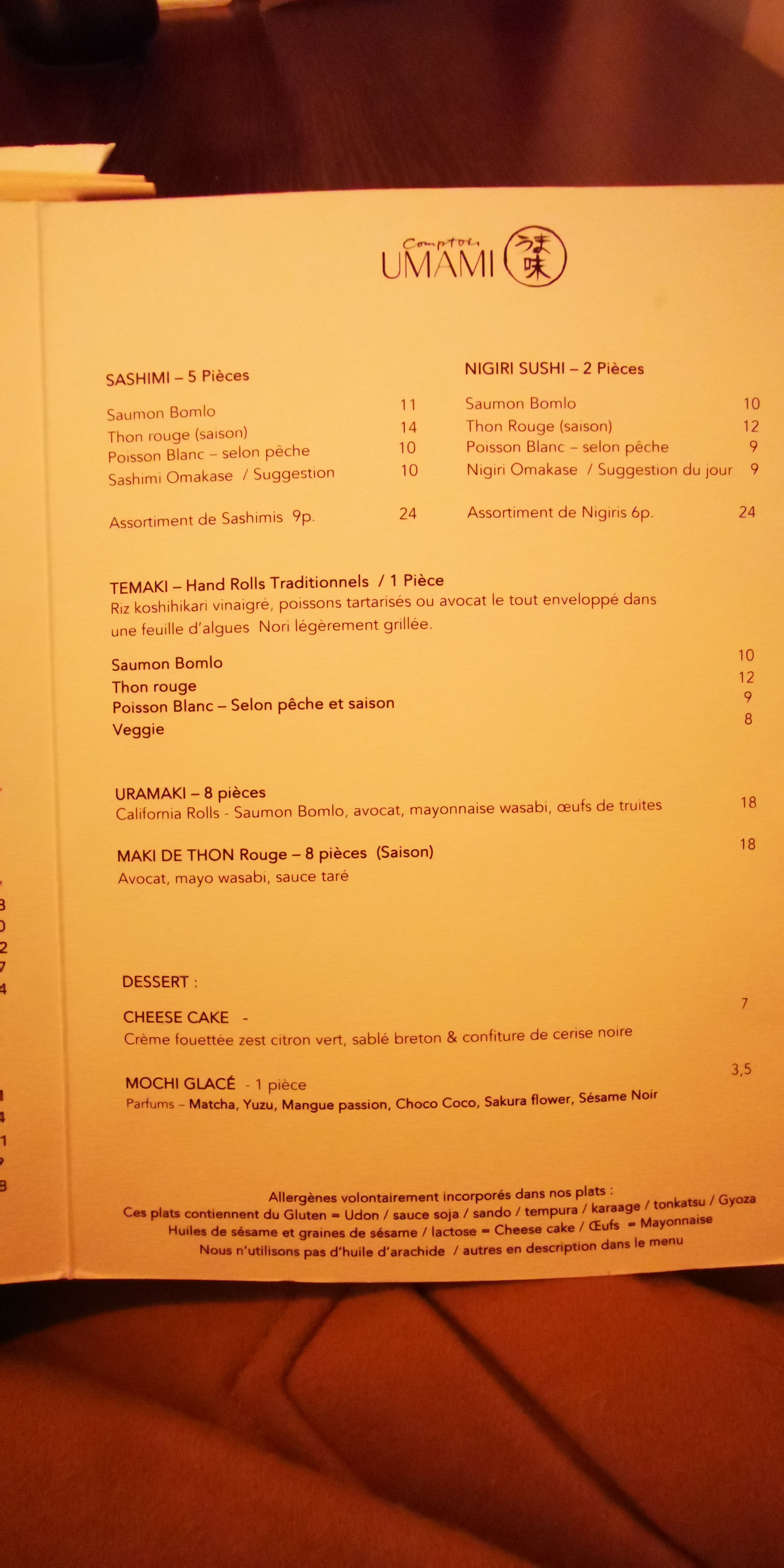 Connaissant bien la gastronomie japonaise, j’ai été déçu. Les tempura dans le bouillon se désagrègent et finissent en bouillie. La bière à 7€50 (?) et un bol de nouilles udon à 22€, c’est cher pour ce que c’est. Un peu culotté d’appeler ça Umami. L’attente fut très très longue. La cuisine ouverte laisse entendre que la patronne n’est pas contente de son équipe en rodage… un peu gênant pour les clients en salle. Bref, je n’y retournerai pas.