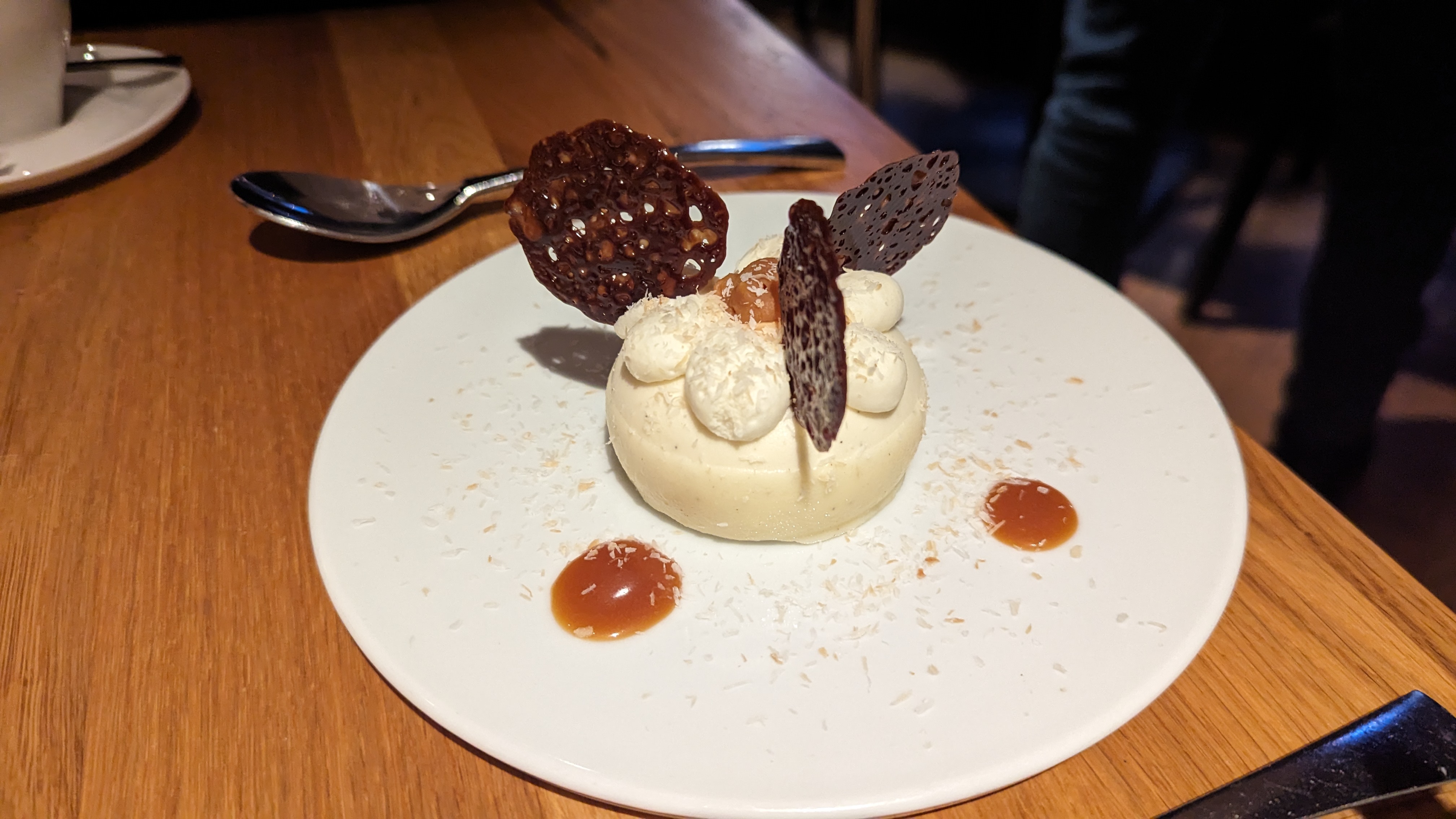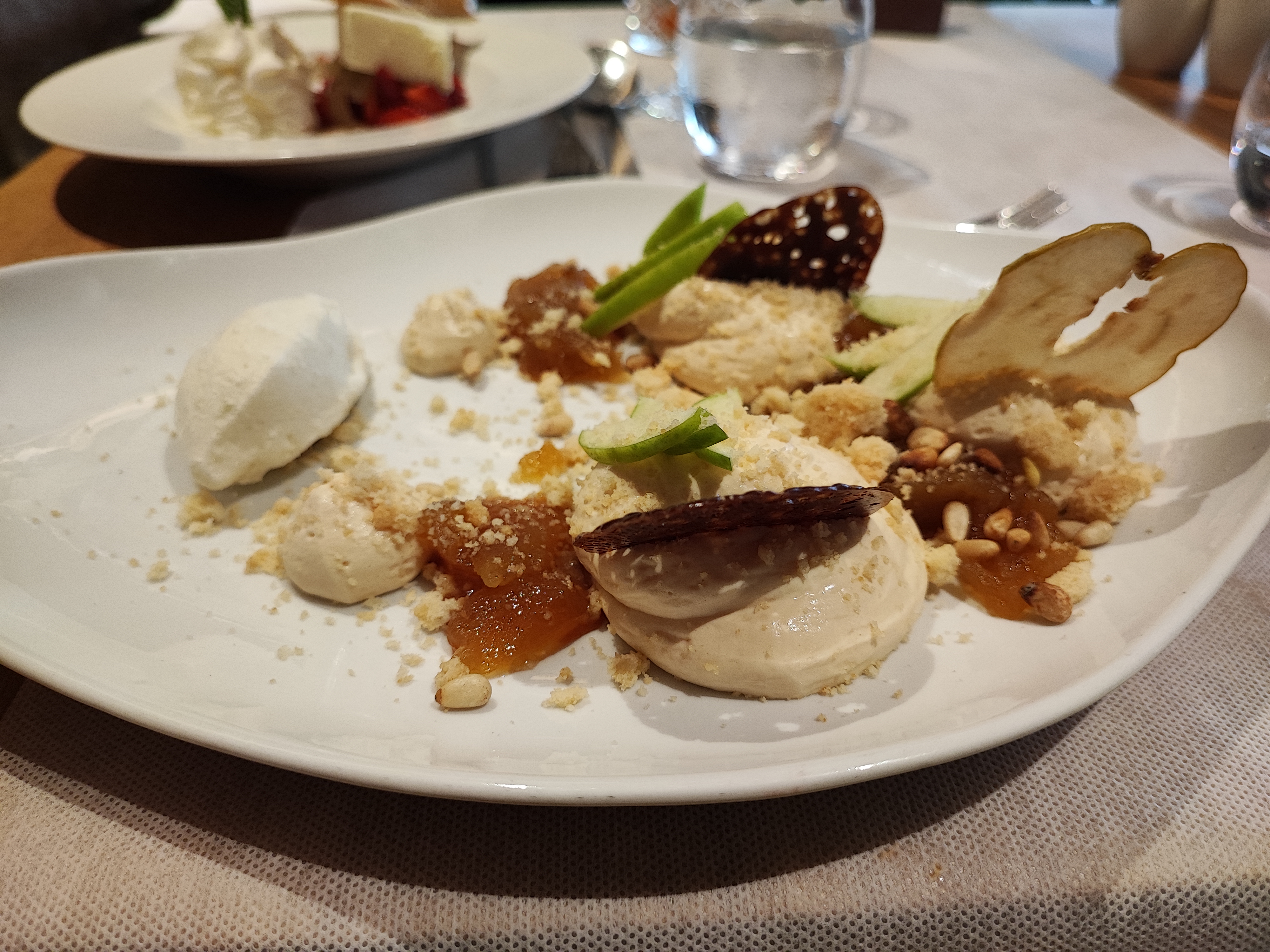 Très bon repas ! Pas étonnant, mais toujours des saveurs très intéressantes et riches. Les pétoncles et le saumon étaient délicieux mais étranges avec l'inclusion de pamplemousse. Ce n'est pas ma combinaison préférée. Recommandez le cassoulet, délicieux et riche avec les haricots, le canard et la saucisse ! J'ai adoré les bords noircis et légèrement croustillants des haricots. J'ai choisi la boule de chocolat en dessert... très bonne ! Solide quatre étoiles dans l'ensemble.