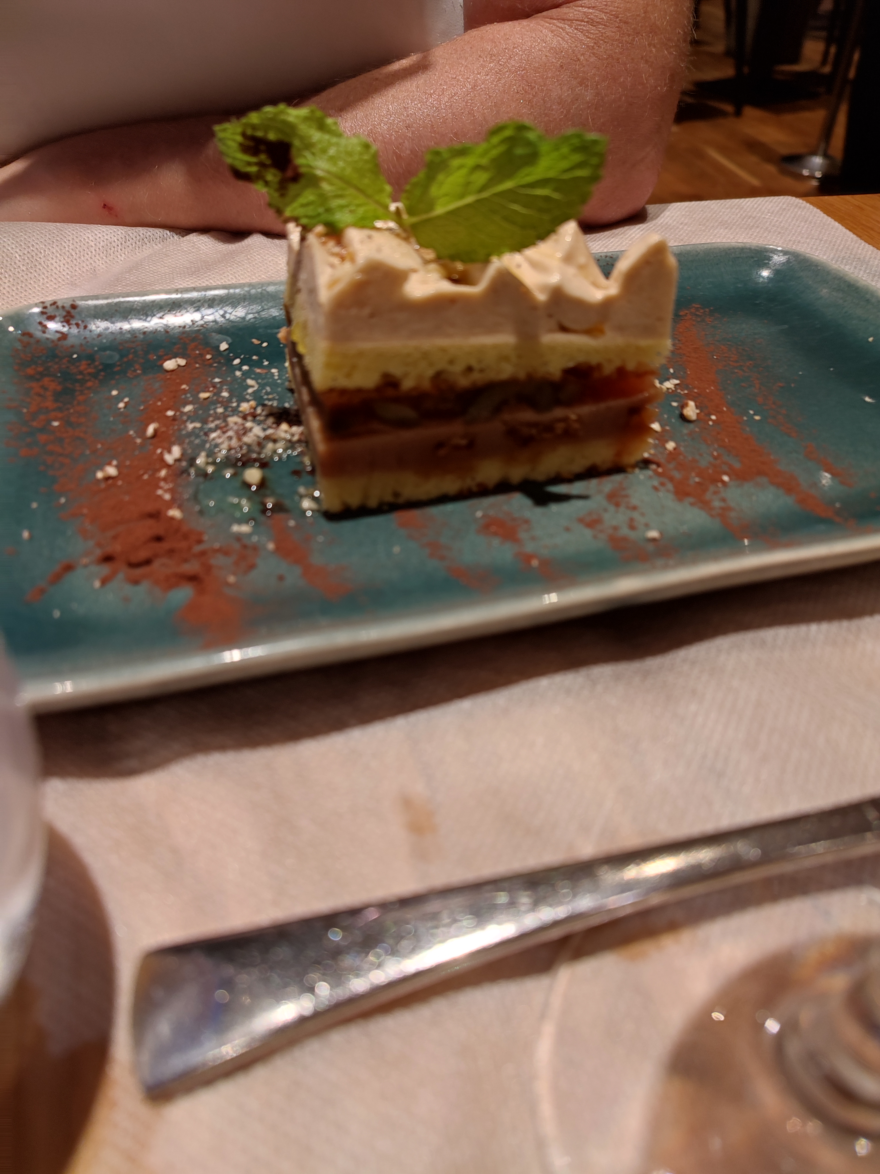 Ambiance sympa et agréable. La nourriture dans l’ensemble était plutôt bonne mais nous n’avons pas été séduits non plus. Le désert de panna cotta était ennuyeux et je m'en fichais. Le foie gras était excellent. En général, le menu semblait un peu trop cher. La serveuse, bien qu'efficace, n'était pas très chaleureuse.