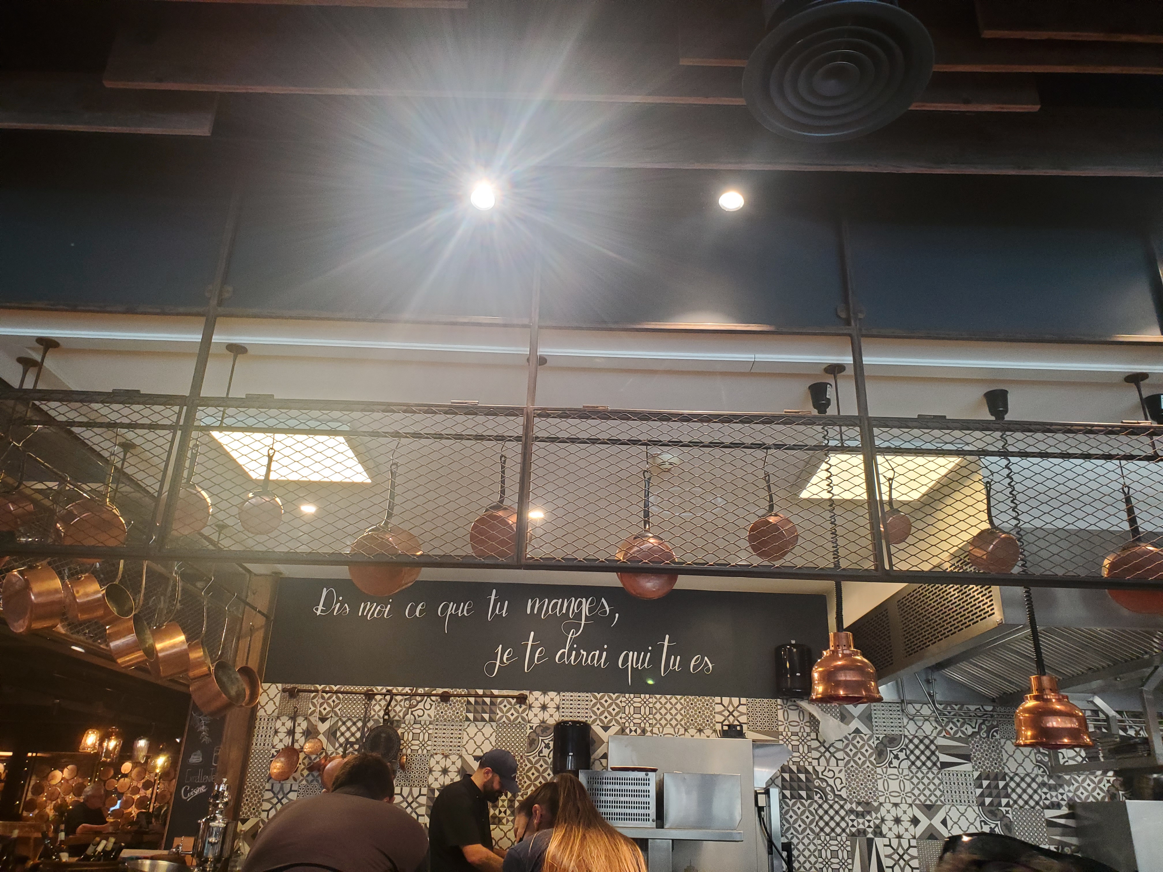 Quand la terrasse n’est pas ouverte il reste des places à l’intérieur mais faut-il avoir envie d’être au bar… cocktail amère , planche de charcuterie sans âmes et surtout le verre de vin rouge à 8€ sans voir la bouteille rien franchement abusé…..