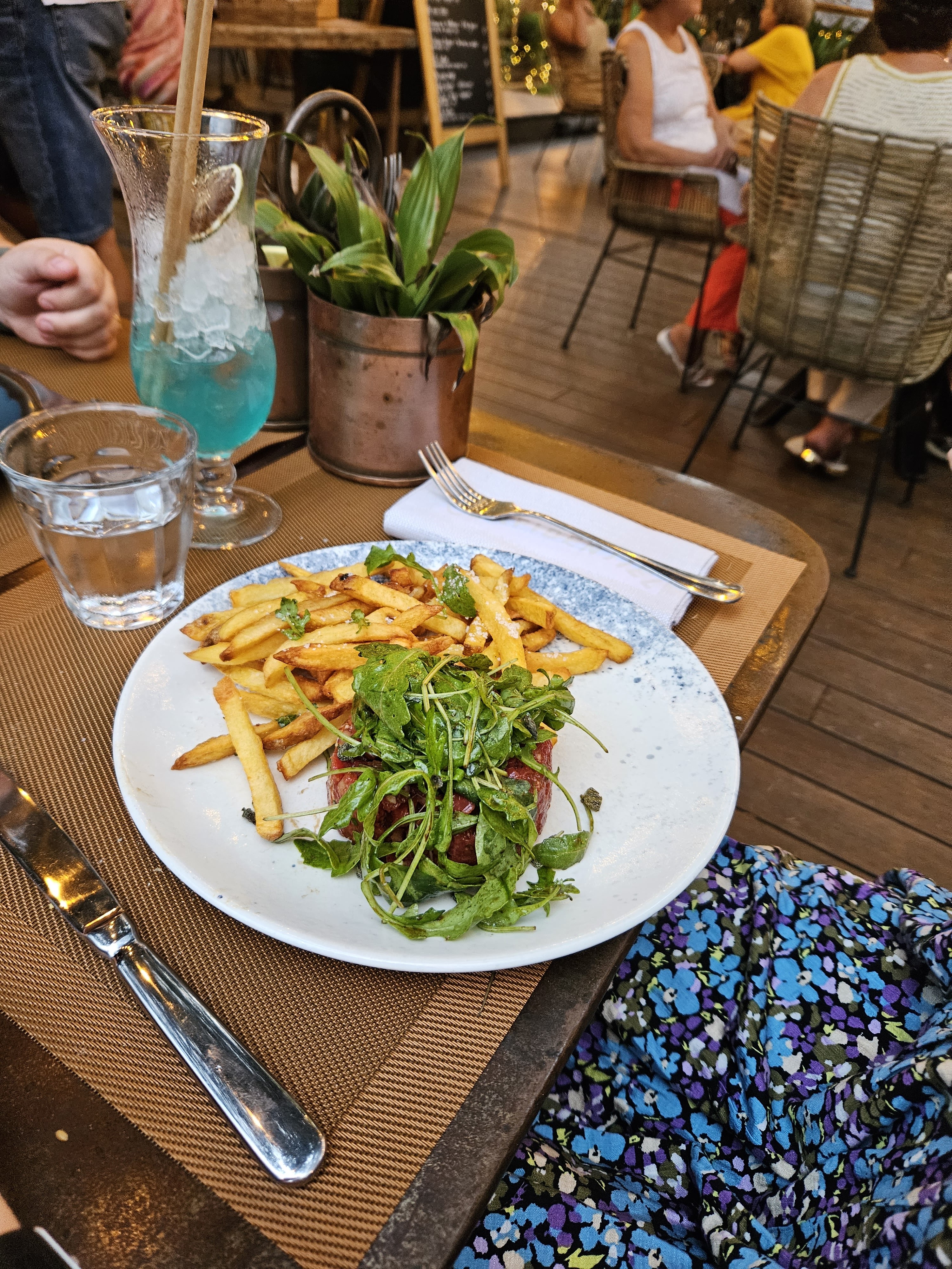 Très bon moment passé au coin tapas. Beau cadre et belle ambiance ( mardi soir). Les cocktails sont bons. Tout est bon ! Le seul bémol est au niveau des prix qui sont assez chers..: par ex 10 euros une boule de burrata ou 13 euros un petit morceau de tartare…