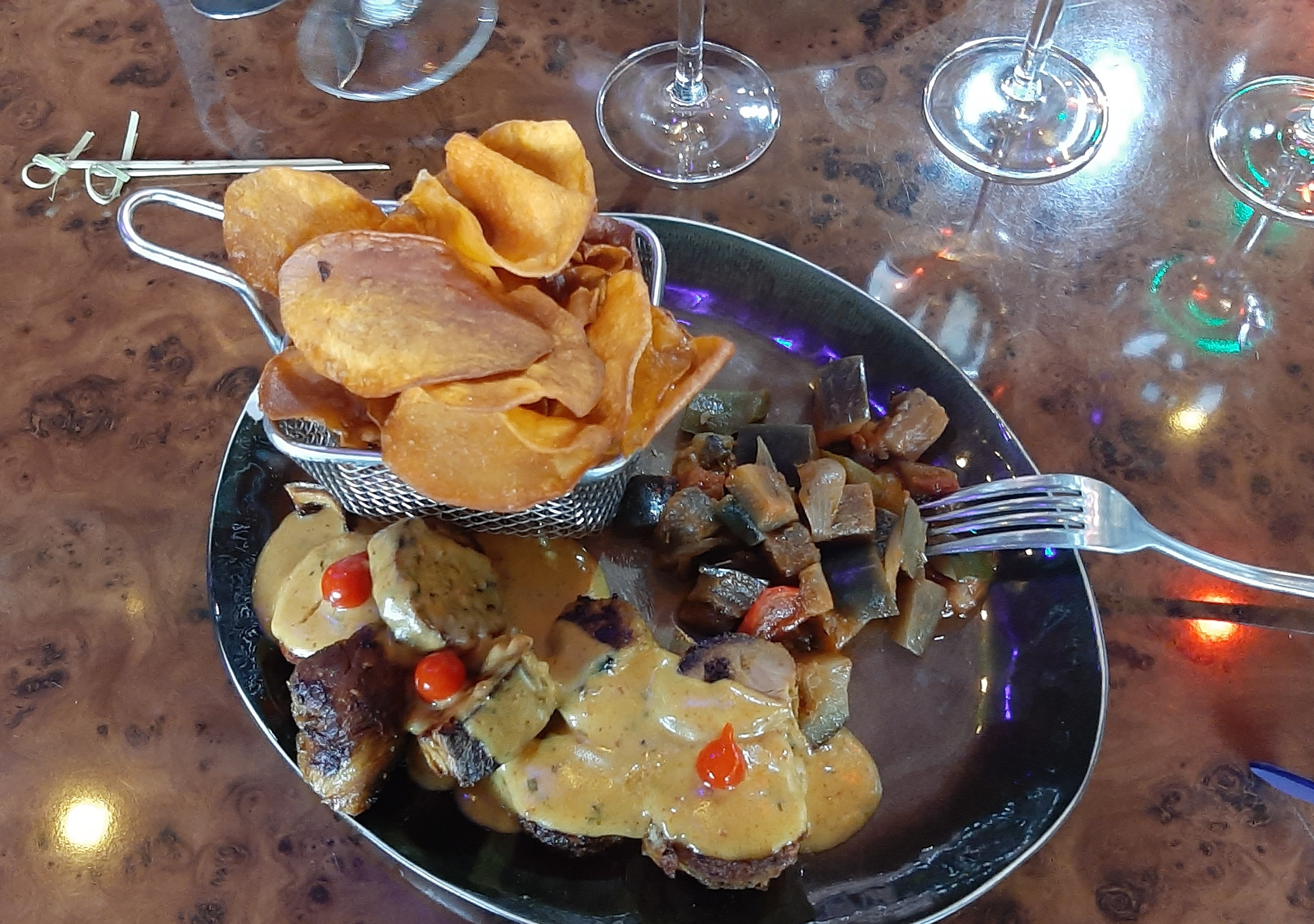 Ce lieu semblait pourtant accueillant. Une piste de danse qui au final reste vide et sans musique. Le plat découverte le plus sympa de la carte était indisponible. (Manque d alcool à brûler pour les mini appareil à cuisson de table ) pour un samedi soir c'est très décevant. Sans compter que nous l'avons appris une fois la commande passée. Perte de temps donc qui ne fait que rallonger le temps de service déjà long. On reste sur notre faim avec des plats peu copieux des frites surgelées, des cocktails et des desserts qui manquent de présentation.